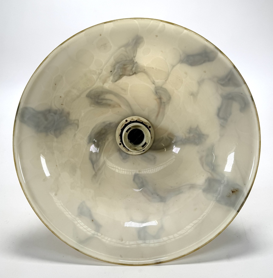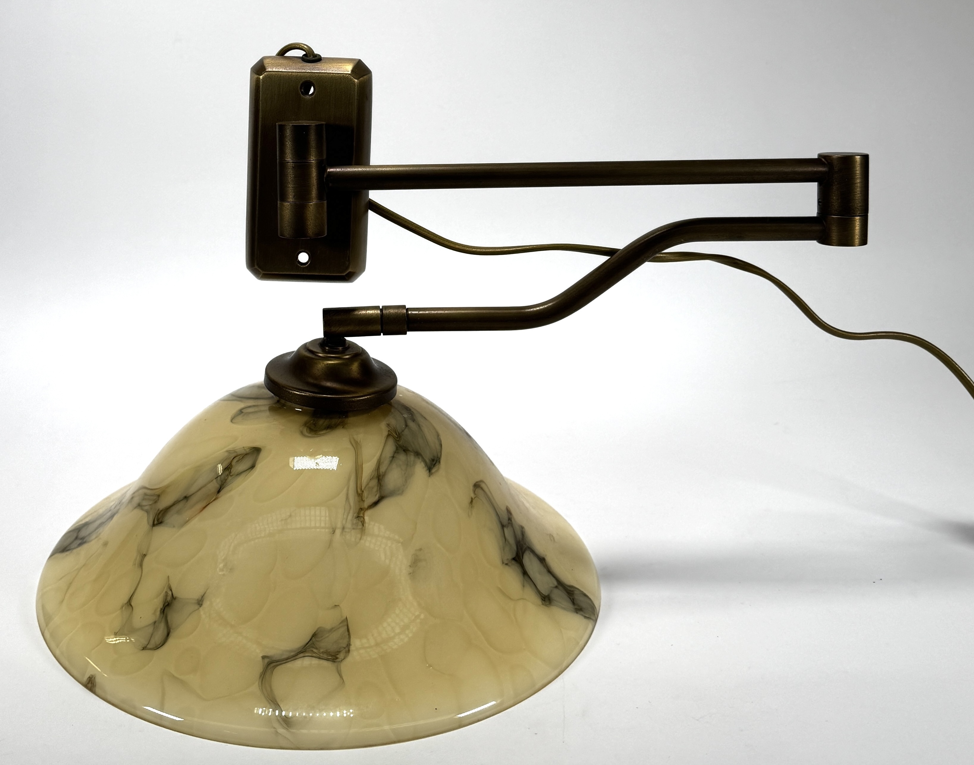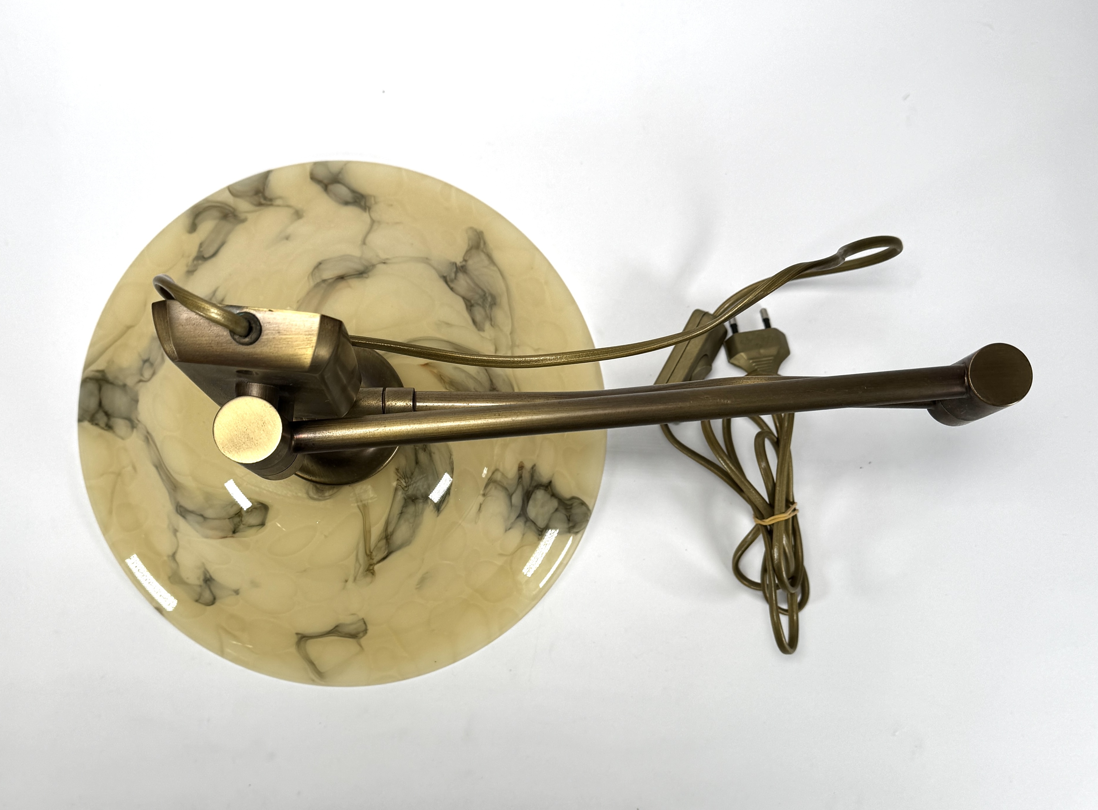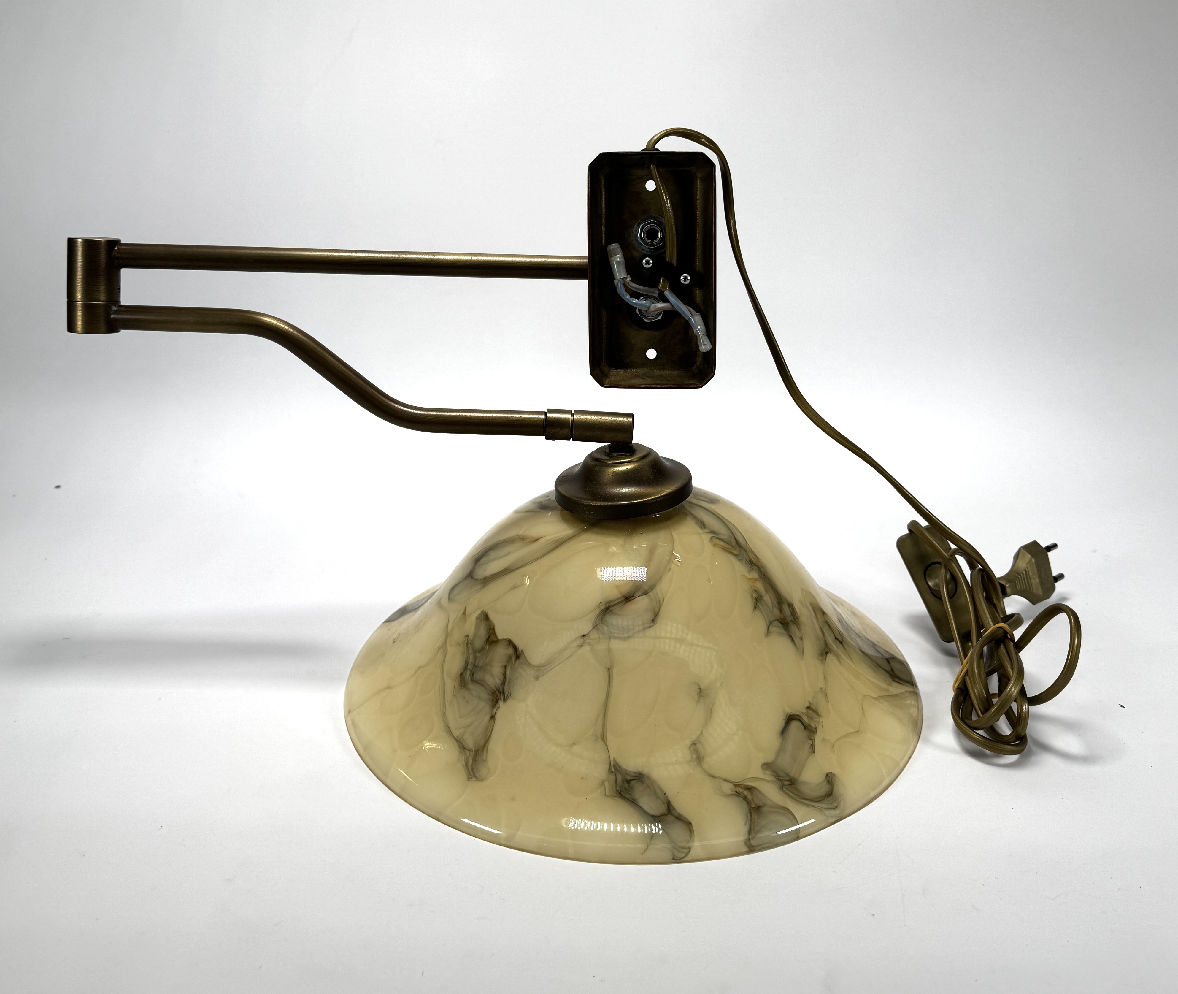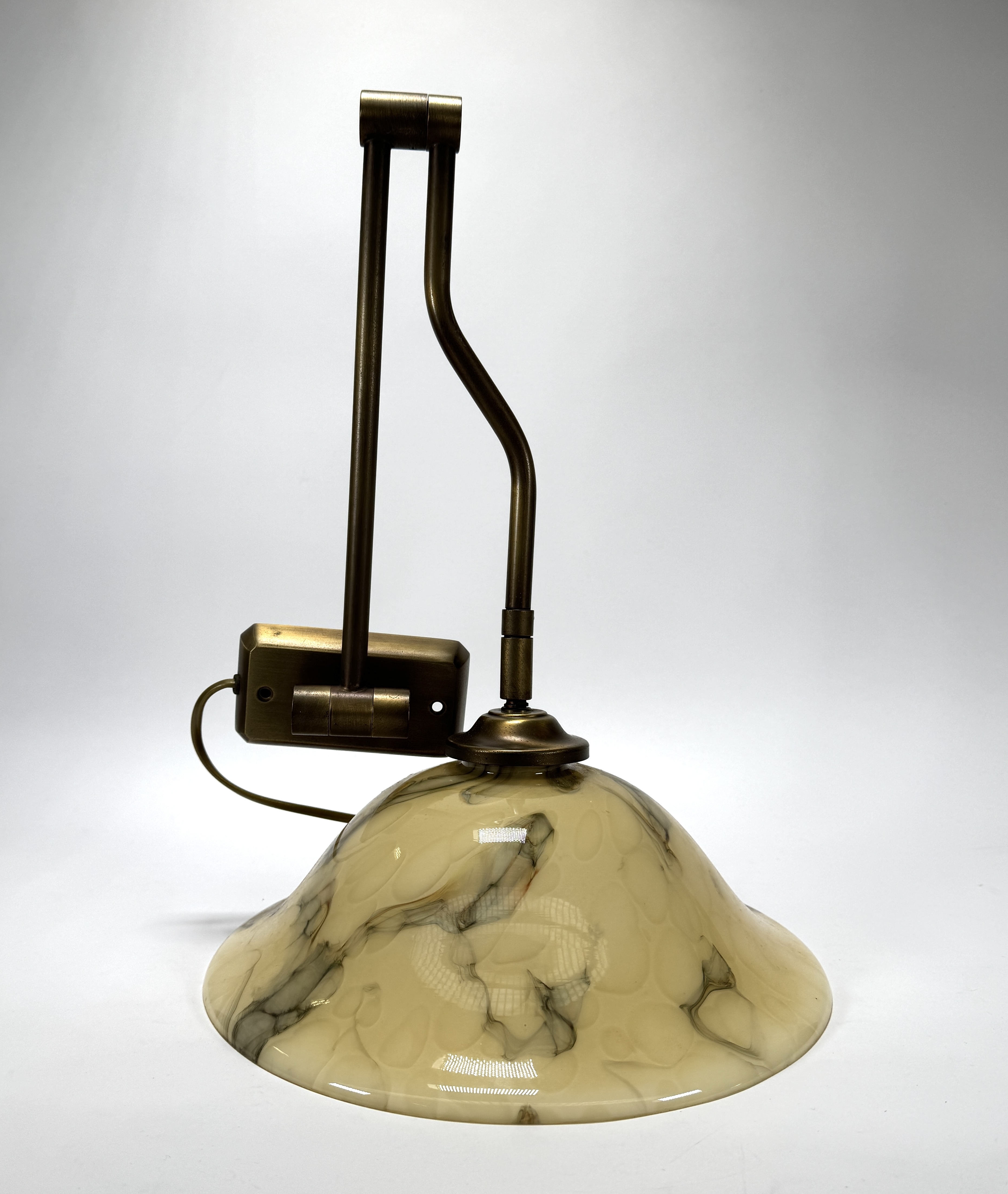 Hanglamp met verstelbare zwenkarm is uitgevoerd in een klassieke Art Deco stijl, dateert uit het midden van de 20e eeuw en combineert een messingkleurig metalen armatuur met een crèmekleurige, grijs gemarmerde glazen kap. De constructie bevat een rechthoekige wandplaat en een dubbel scharnierende arm voor optimale flexibiliteit. Deze wandlamp zelf beoordelen? Je bent welkom op onze kijkdagen op 28, 29 en 30 november! |