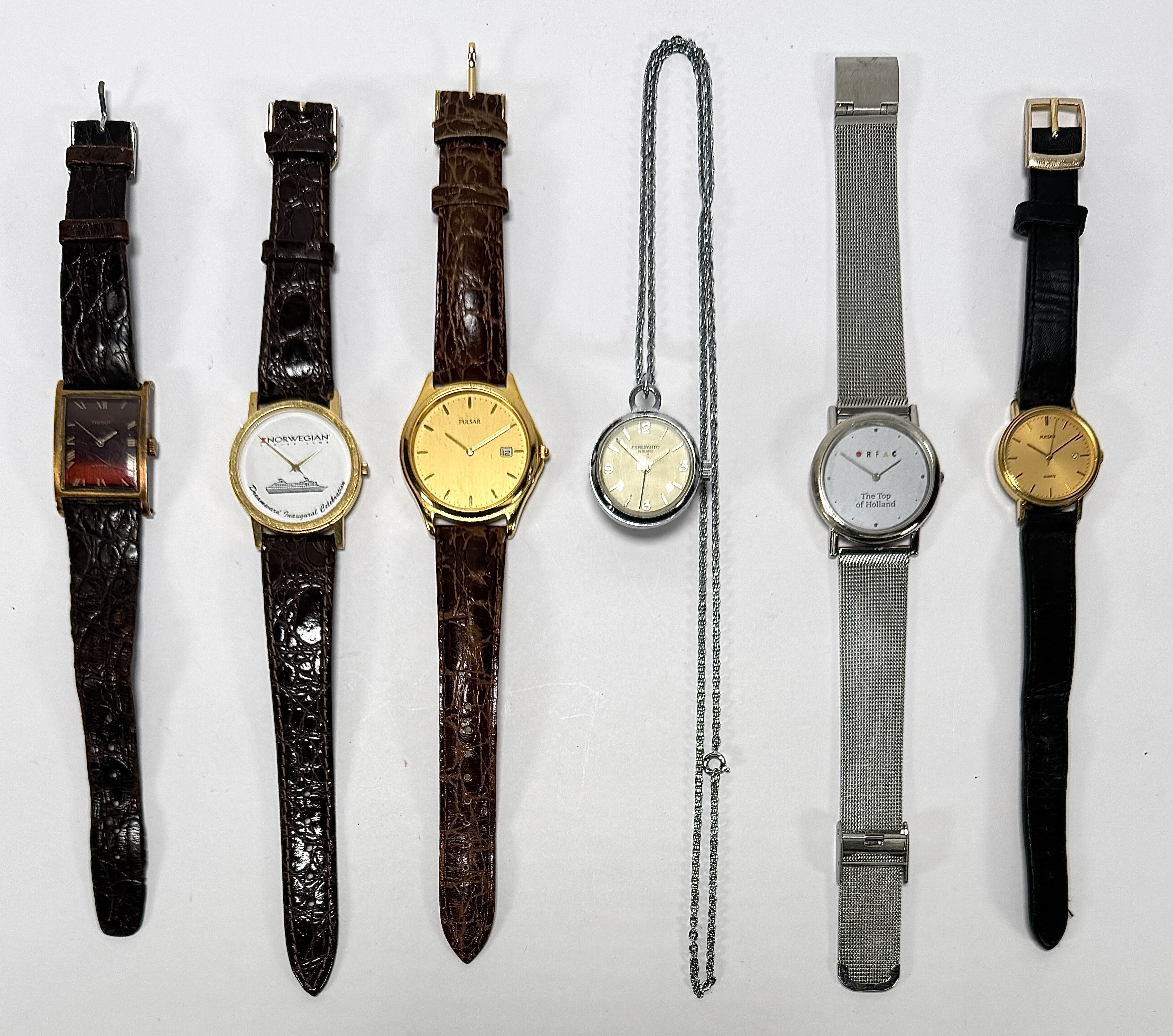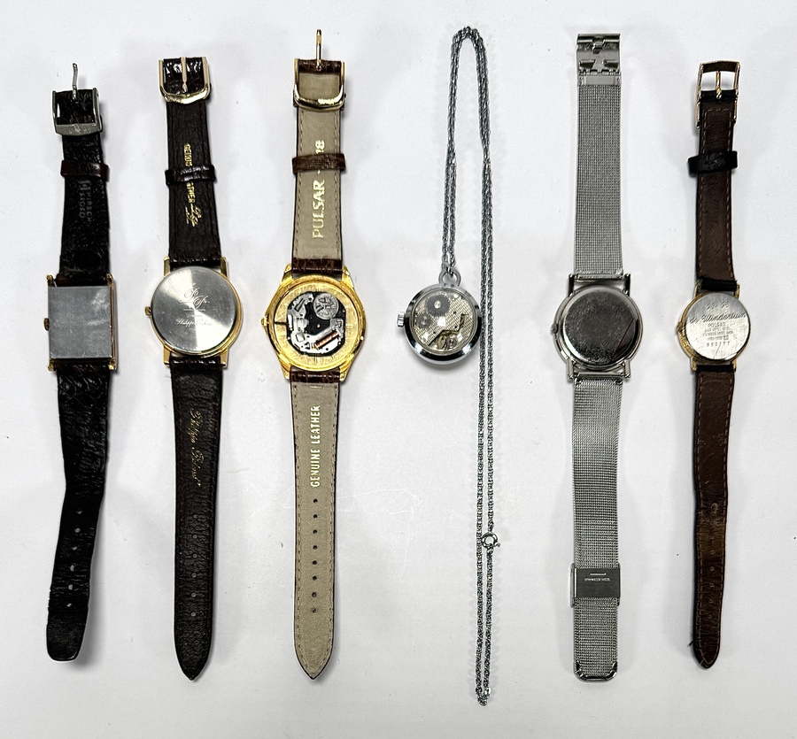 Vijf polshorloges en een medaillon hanghorloge, daterend uit de periode circa 1970–2000. De horloges zijn vervaardigd door merken als Pulsar en Akilia en zijn uitgerust met quartz uurwerken. De collectie omvat goudkleurige en stalen modellen met lederen of mesh banden. Geïnteresseerd? Bezoek onze kijkdagen op 28, 29 of 30 november van 11:00 tot 17:00 uur! |