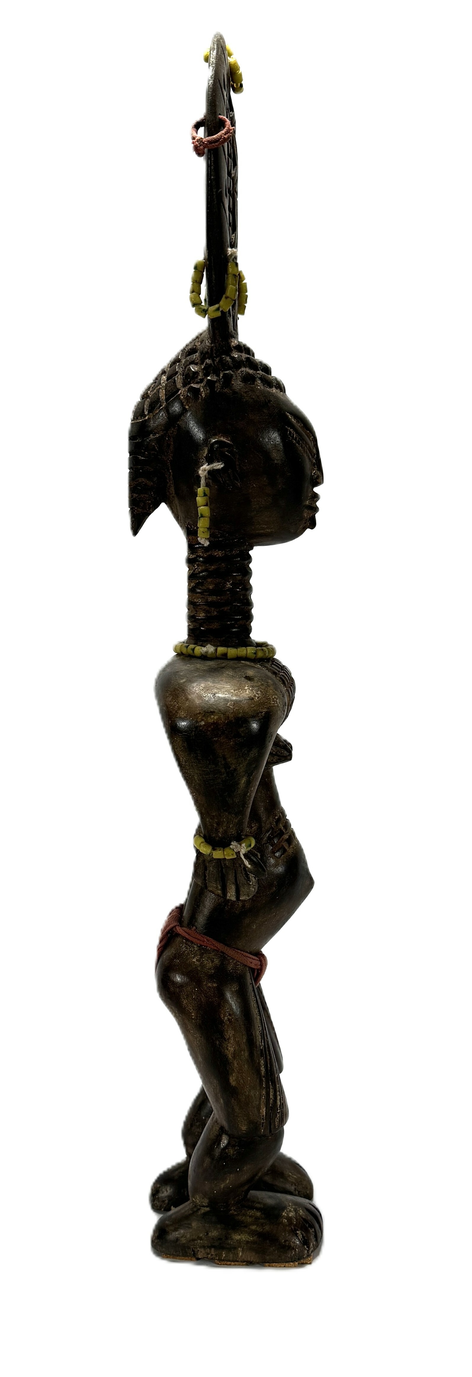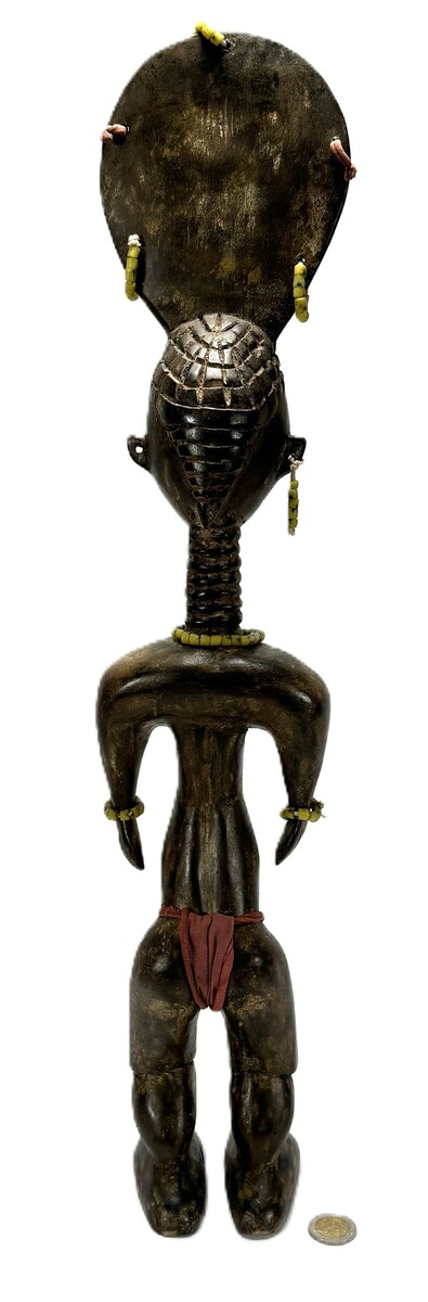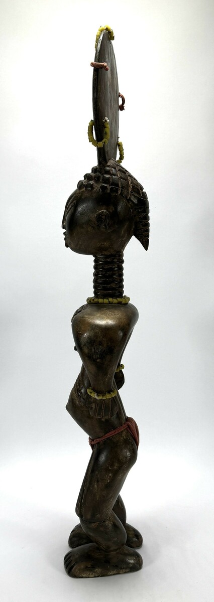 Gesneden houten Baule beeld (Ivoorkust) van een staande vrouwelijke figuur (blolo bla), daterend uit de tweede helft 20e eeuw, vervaardigd door middel van houtsnijwerk en heeft een typische Baule coiffure en gelaatstrekken. De figuur is gedecoreerd met glaskralen en draagt een donkere, glanzende patina, kenmerkend voor ritueel gebruik. De lange nek en de symmetrische, gestileerde vorm zijn representatief voor Baule voorouderbeelden. Geïnteresseerd? Bezoek onze kijkdagen op 28, 29 of 30 november van 11:00 tot 17:00 uur! |