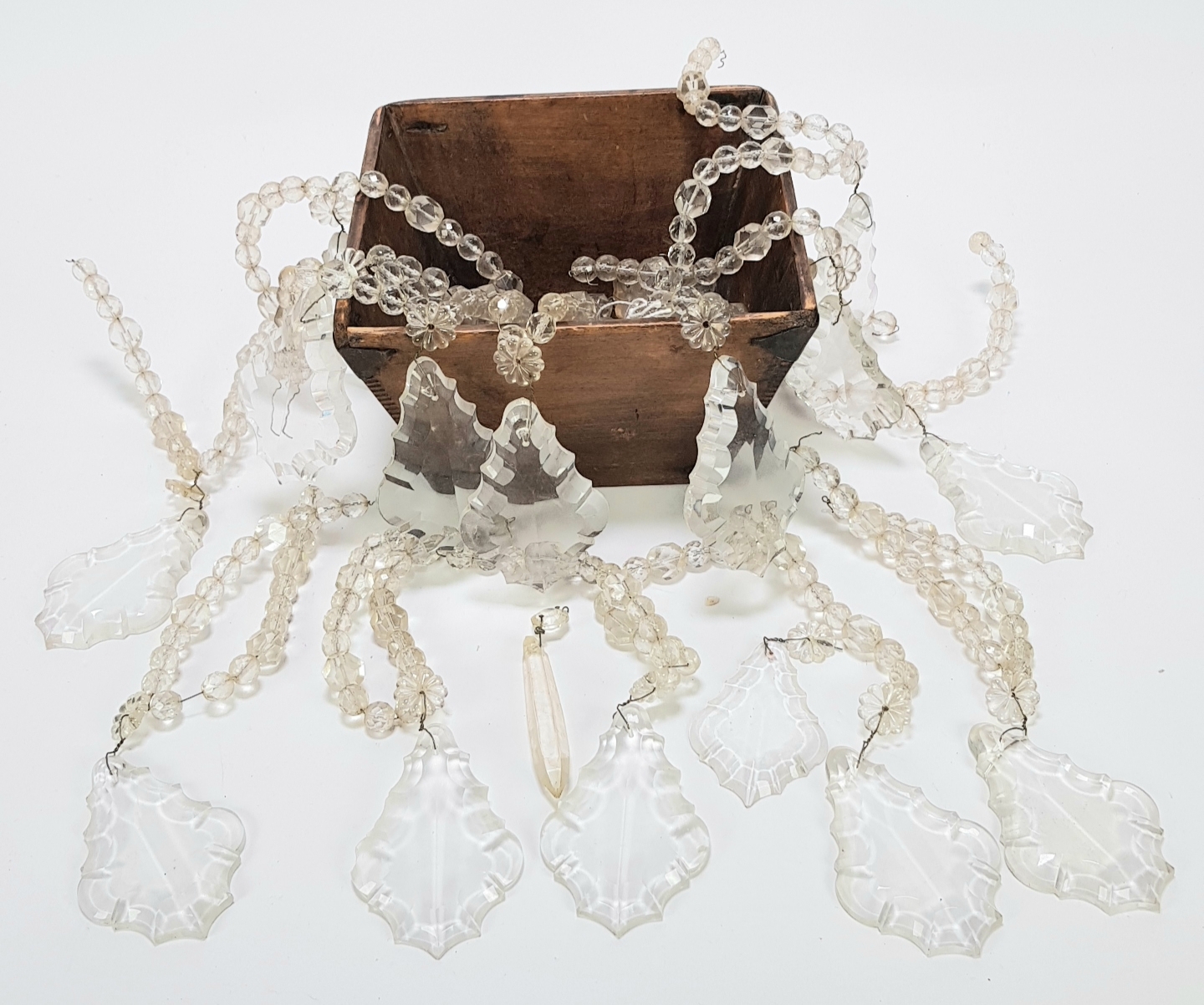 Kristallen kroonluchtpegels en kralensnoeren, daterend uit de periode circa 1880–1920. De pegels en kralen zijn vervaardigd uit helder glas door middel van slijpen en gieten. Het lot bestaat uit lange snoeren van gefacetteerde kralen, afgewisseld met grote, bladvormige pegels met een golvende rand. Eerst deze kristallen pegels zien voordat je biedt? Bezoek onze kijkdagen op 28, 29 en 30 november van 11:00 tot 17:00 uur! |