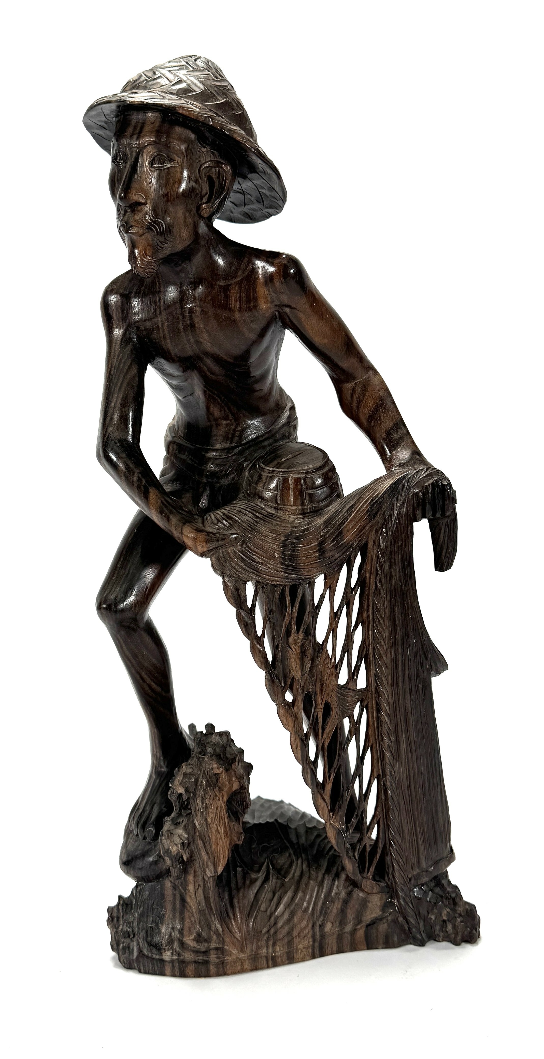 Houten beeld van een Balinese visser, vervaardigd uit massief coromandelhout, tweede helft 20e eeuw. De figuur is weergegeven met een visnet in de handen en draagt een traditionele hoed en lendendoek. Geïnteresseerd? Bezoek onze kijkdagen op 28, 29 of 30 november van 11:00 tot 17:00 uur! |