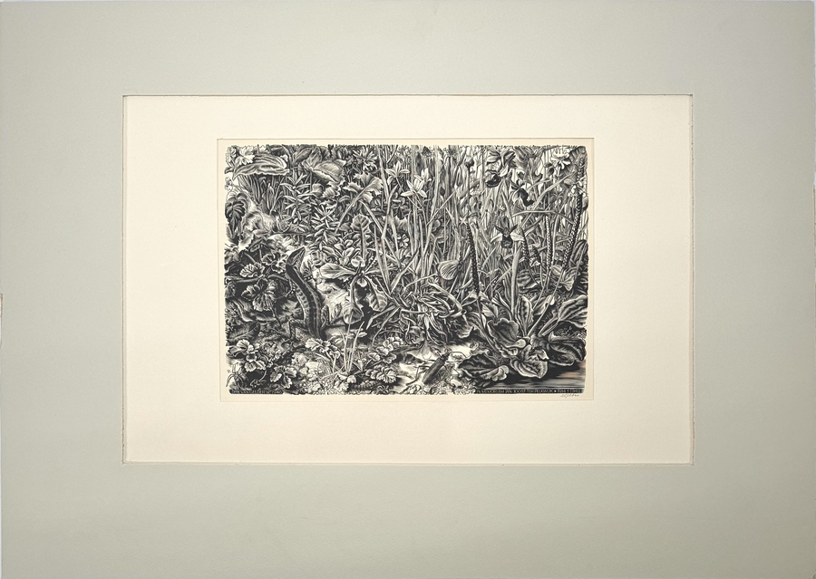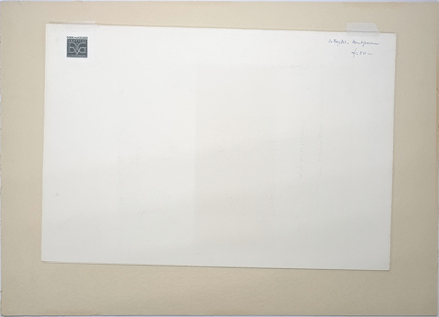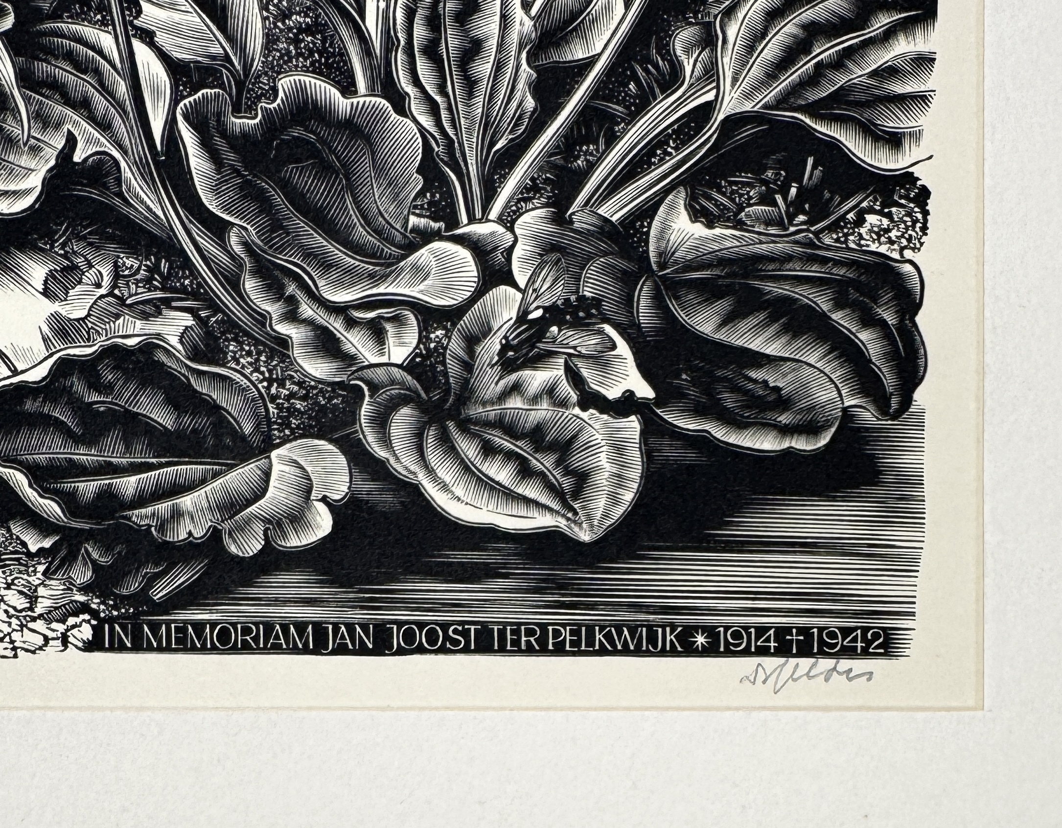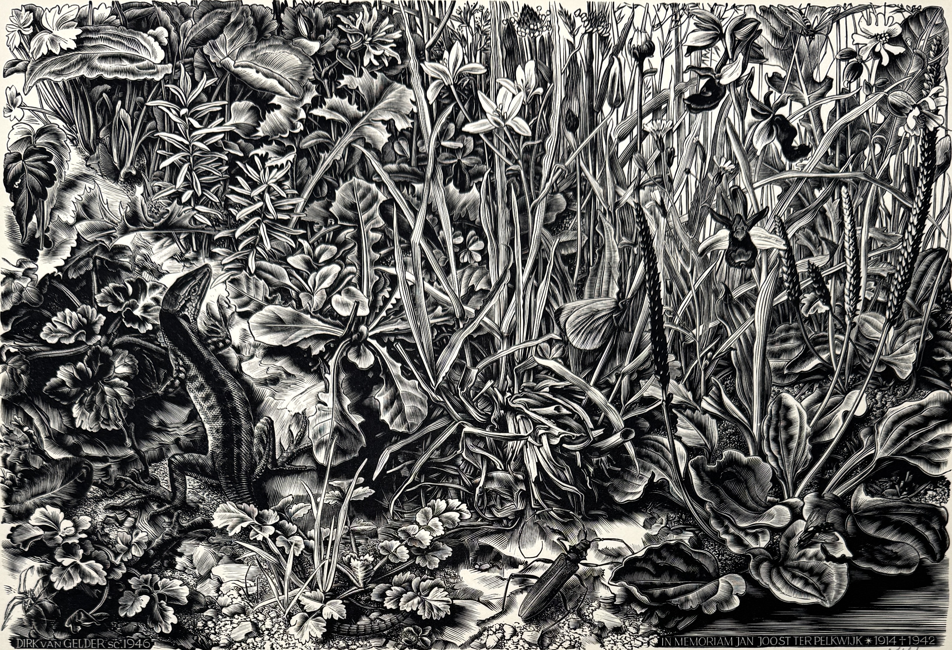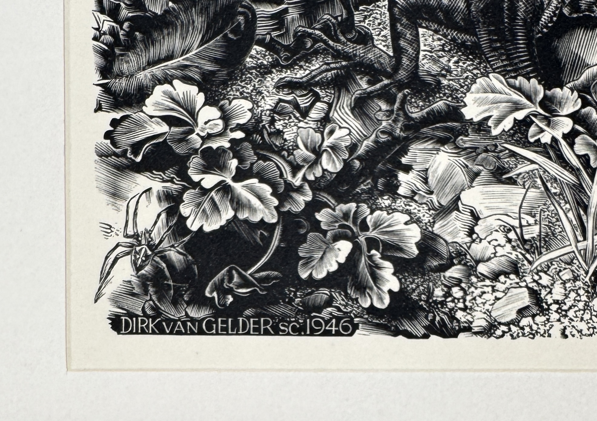Houtgravure op papier van de graficus Dirk van Gelder (1900–1973), gesigneerd en gedateerd 1946. Het werk is uitgevoerd in figuratieve grafiek en toont een dichte, naturalistische weergave van een hagedis en insecten tussen de vegetatie. Met potlood rrechtsonder gesigneerd en verso in inkt titel en techniek. Het is een herdenkingsprent "In Memoriam Jan Joost ter Pelkwijk" en is gedrukt in scherpe zwart-wit contrasten. Klaar om te bieden? Registreer je nu en doe mee aan de veiling! |