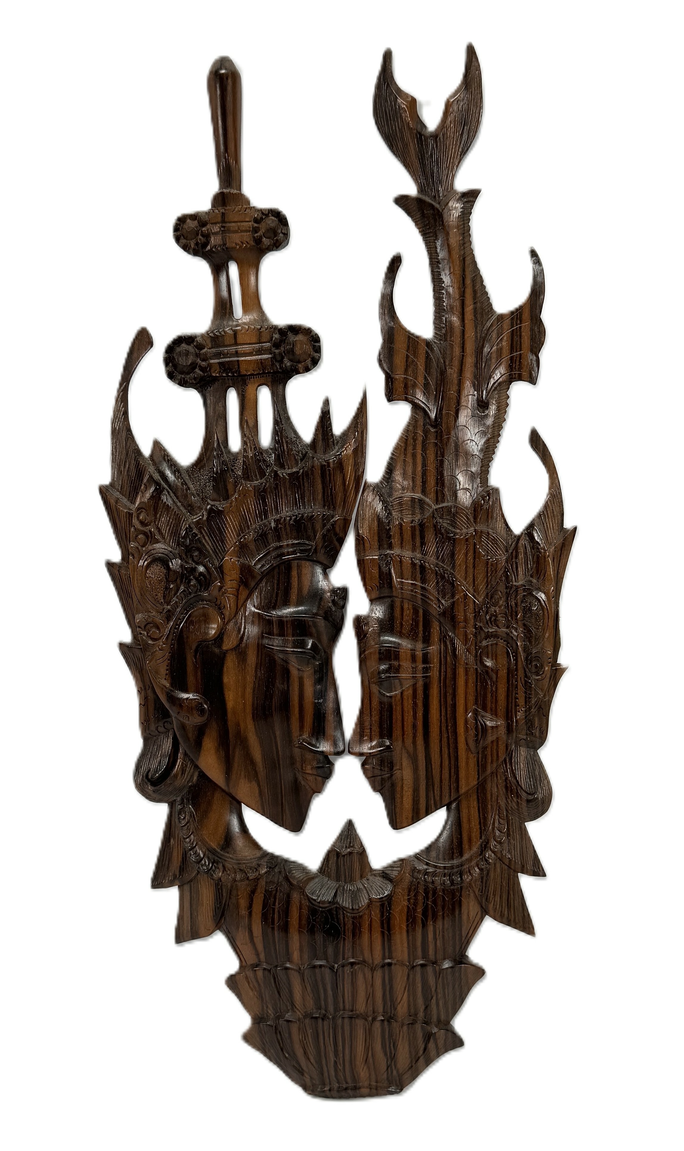 Traditioneel Balinees reliëf houtsnijwerk van coromandel hout, daterend uit het midden tot late 20e eeuw (ca. 1950–1980). Het werk toont een dubbelportret van de figuren Rama en Sita in profiel, omgeven door gedetailleerd snijwerk en kroonwerk. Wil je direct deelnemen? Plaats vanaf 21 november alvast een schriftelijk bod via onze website! |