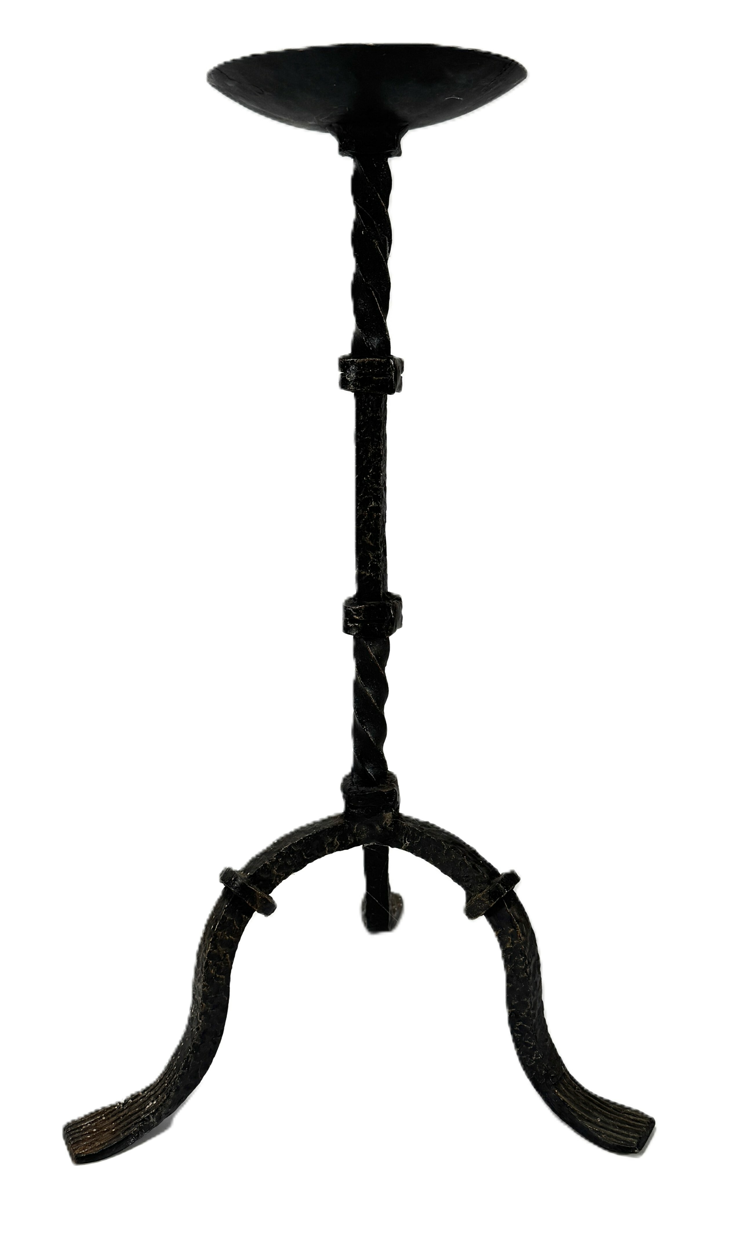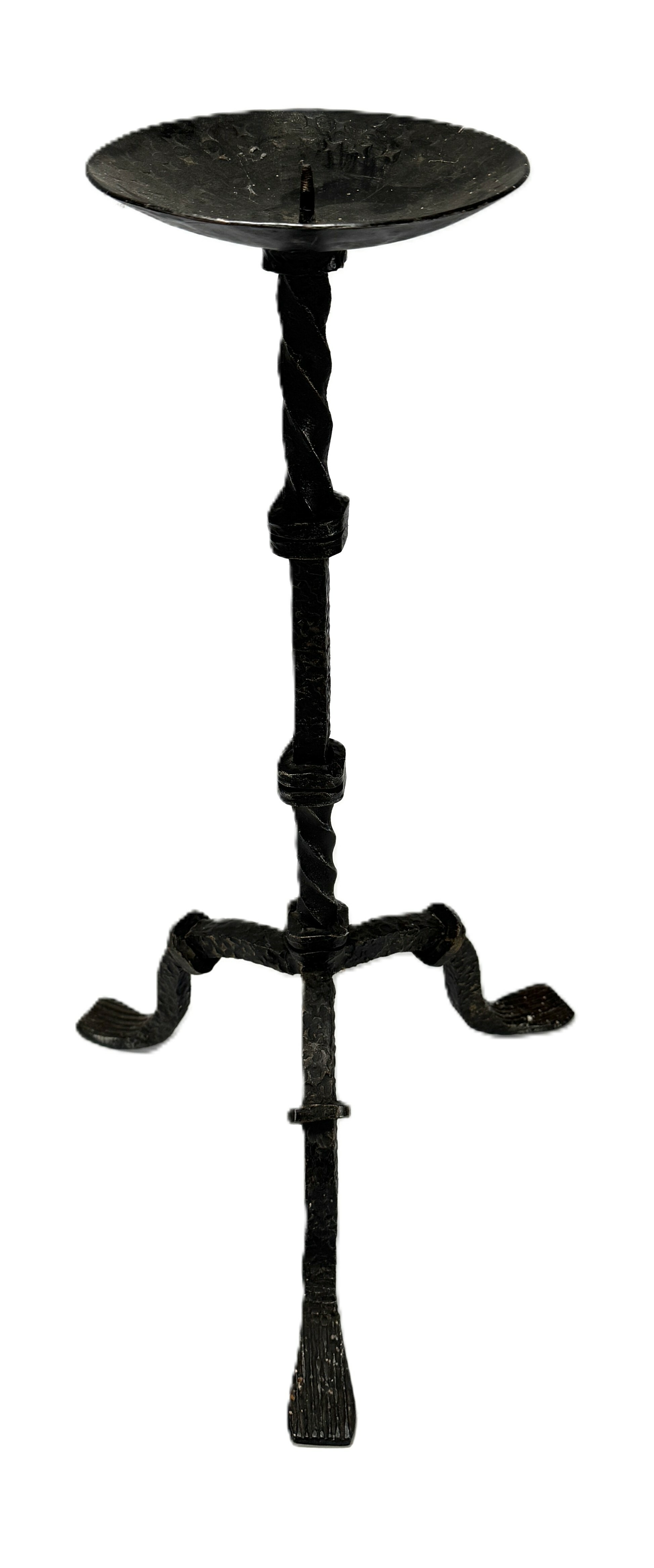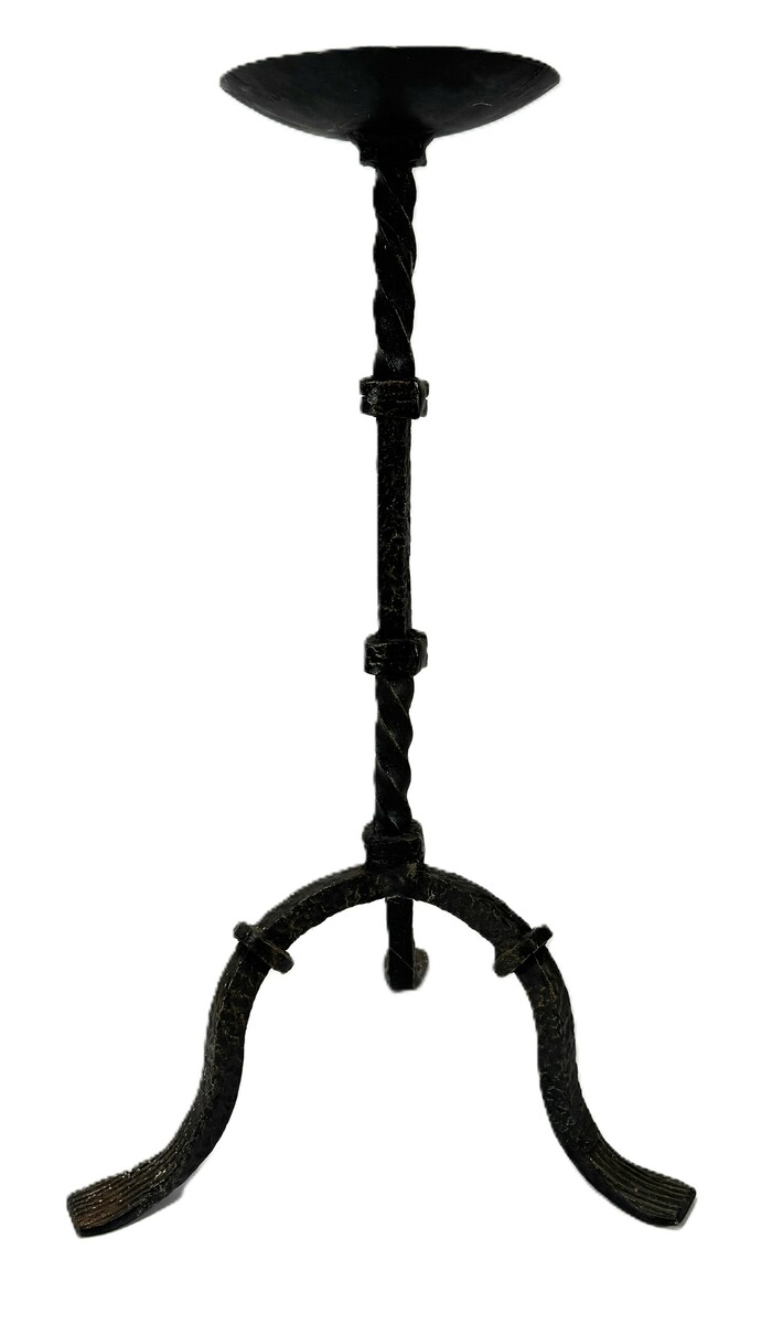 Gesmede ijzeren kandelaar op drie poten met gedraaide stam en ondiepe kaarsenschaal, midden 20e eeuw, Klaar om te bieden? Registreer je nu en doe mee aan de veiling! |