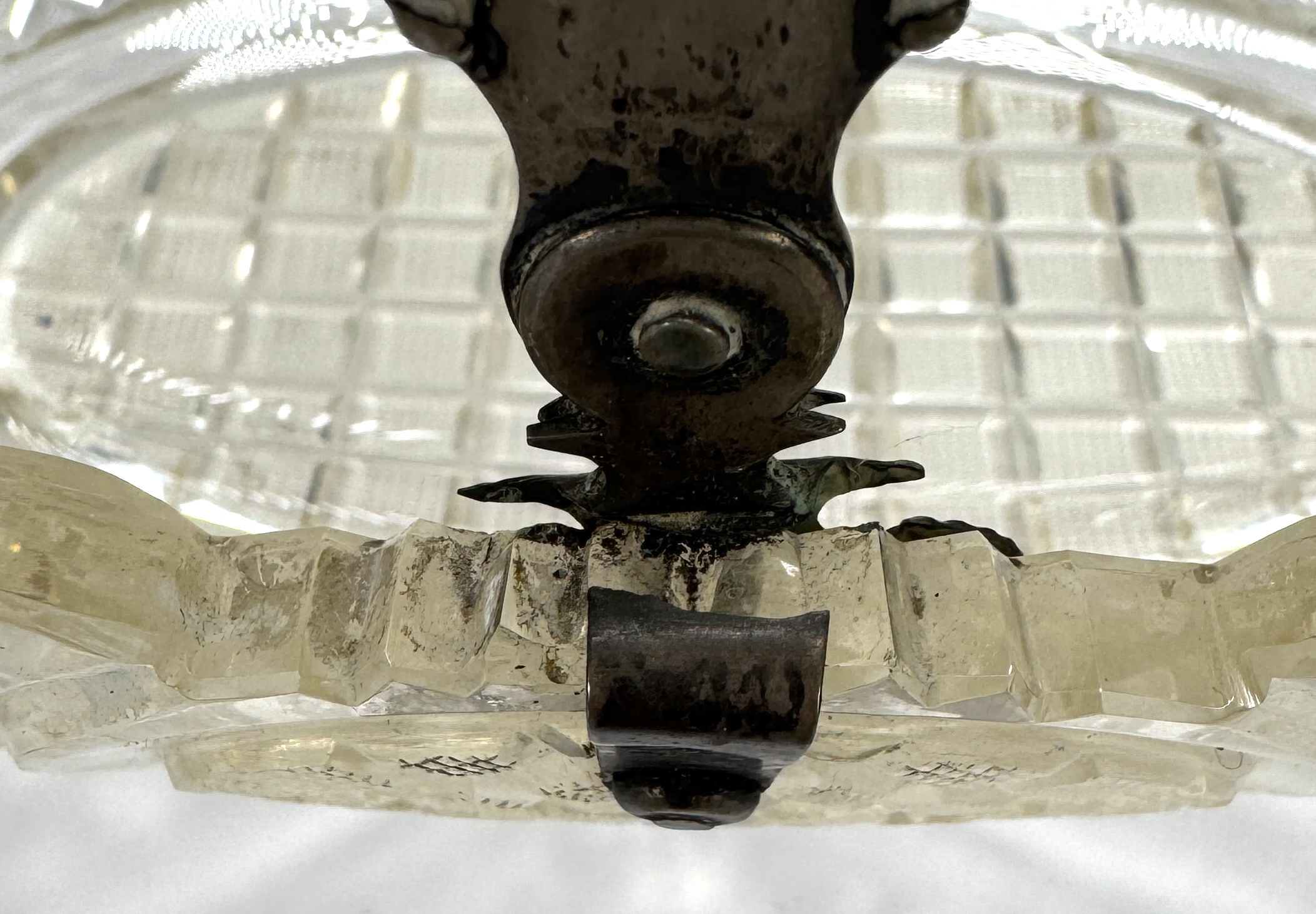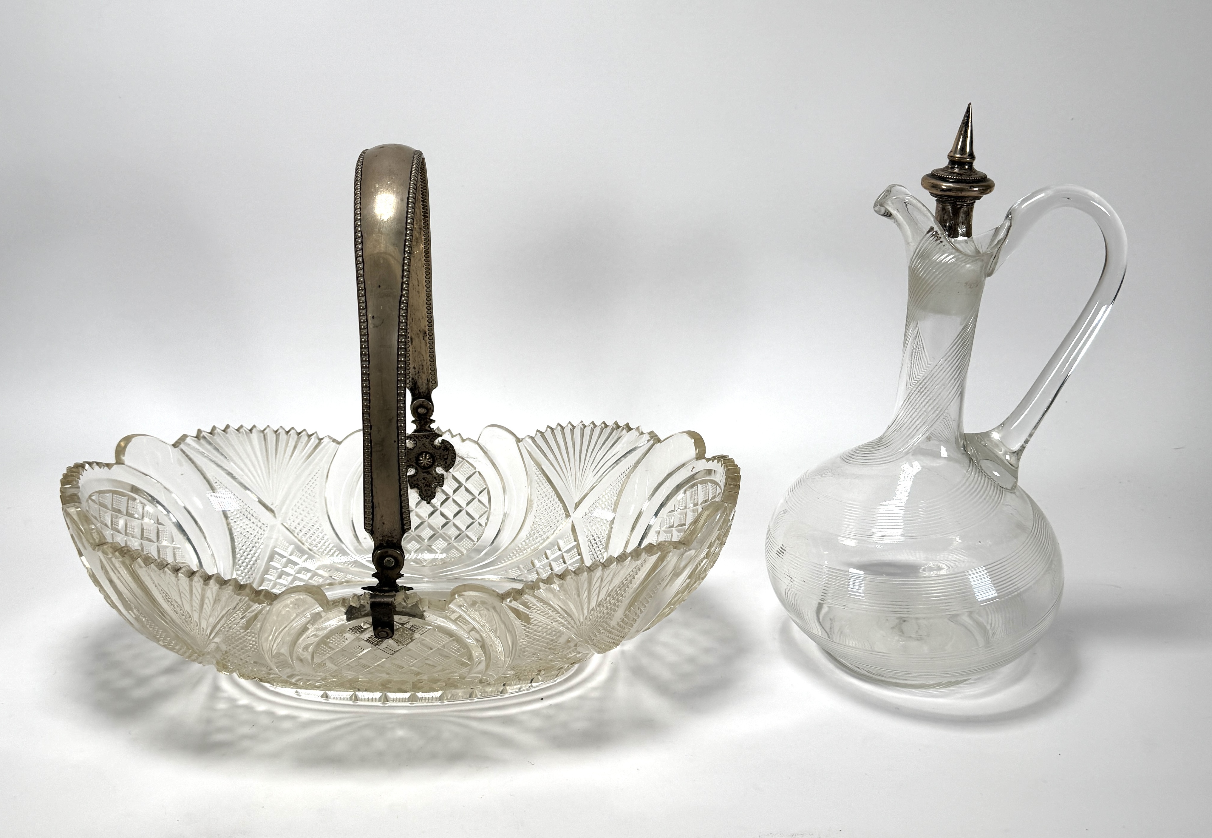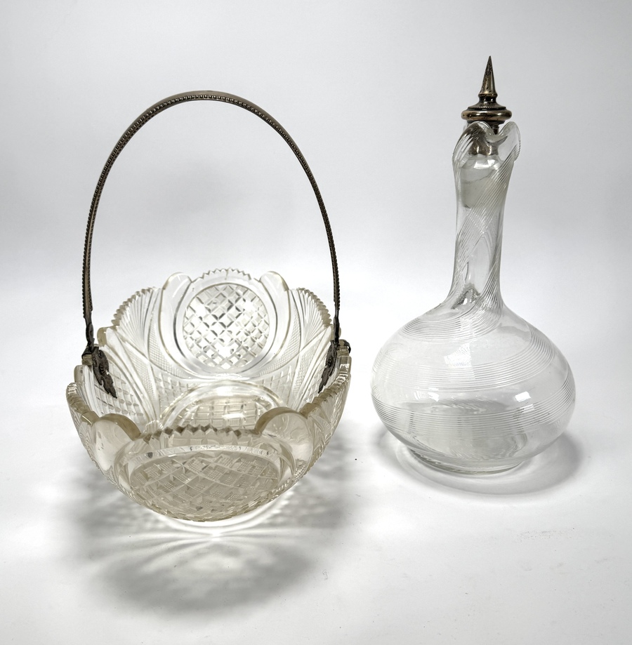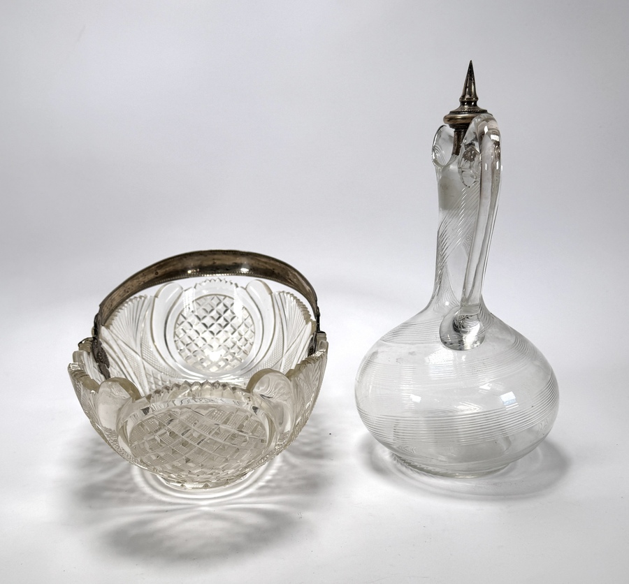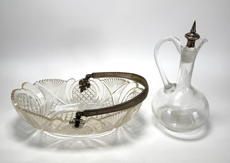 Een geslepen glazen schaal met een bewerkt hengsel en geschulpte rand en een karaf met gravures en een metalen montuur bij stop. Begin 1900, afkomstig uit West-Europa. Registreer nu en bied eenvoudig online mee op deze objecten! |