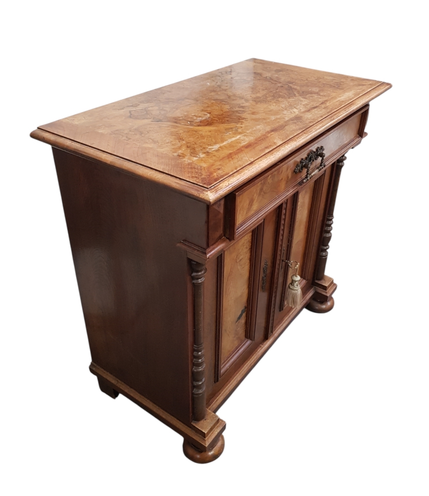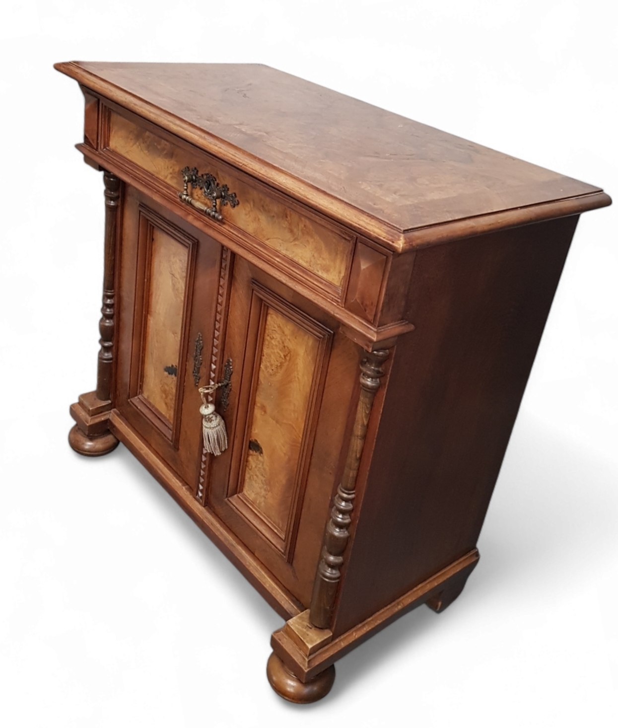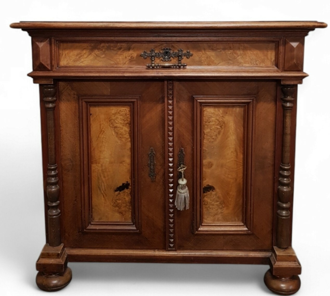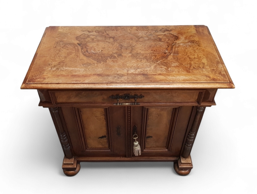 Penantkast uit de Gründerzeit, daterend uit de tweede helft van de 19e eeuw. De constructie is van massief hout en uitgevoerd met wortelnoten fineerwerk op de twee deuren en de lade. Kenmerkend zijn de gedraaide pilaren en bolpoten, het tandlijstwerk en het decoratieve metalen beslag in donker metaal. Zeker zijn van deelname? Plaats vanaf 21 november een schriftelijk bod online! |