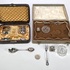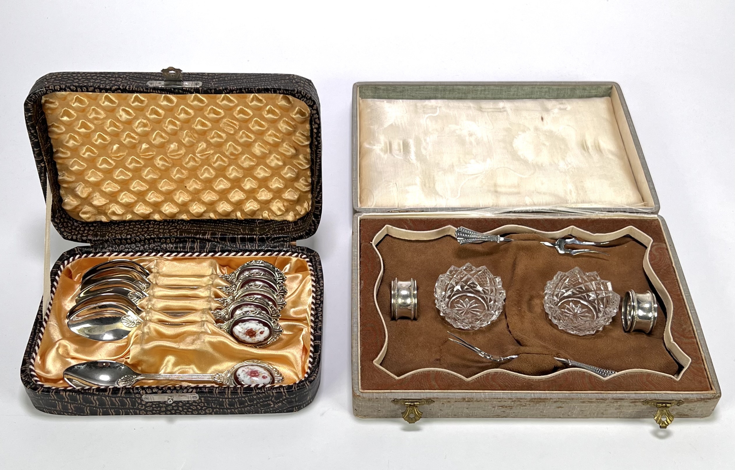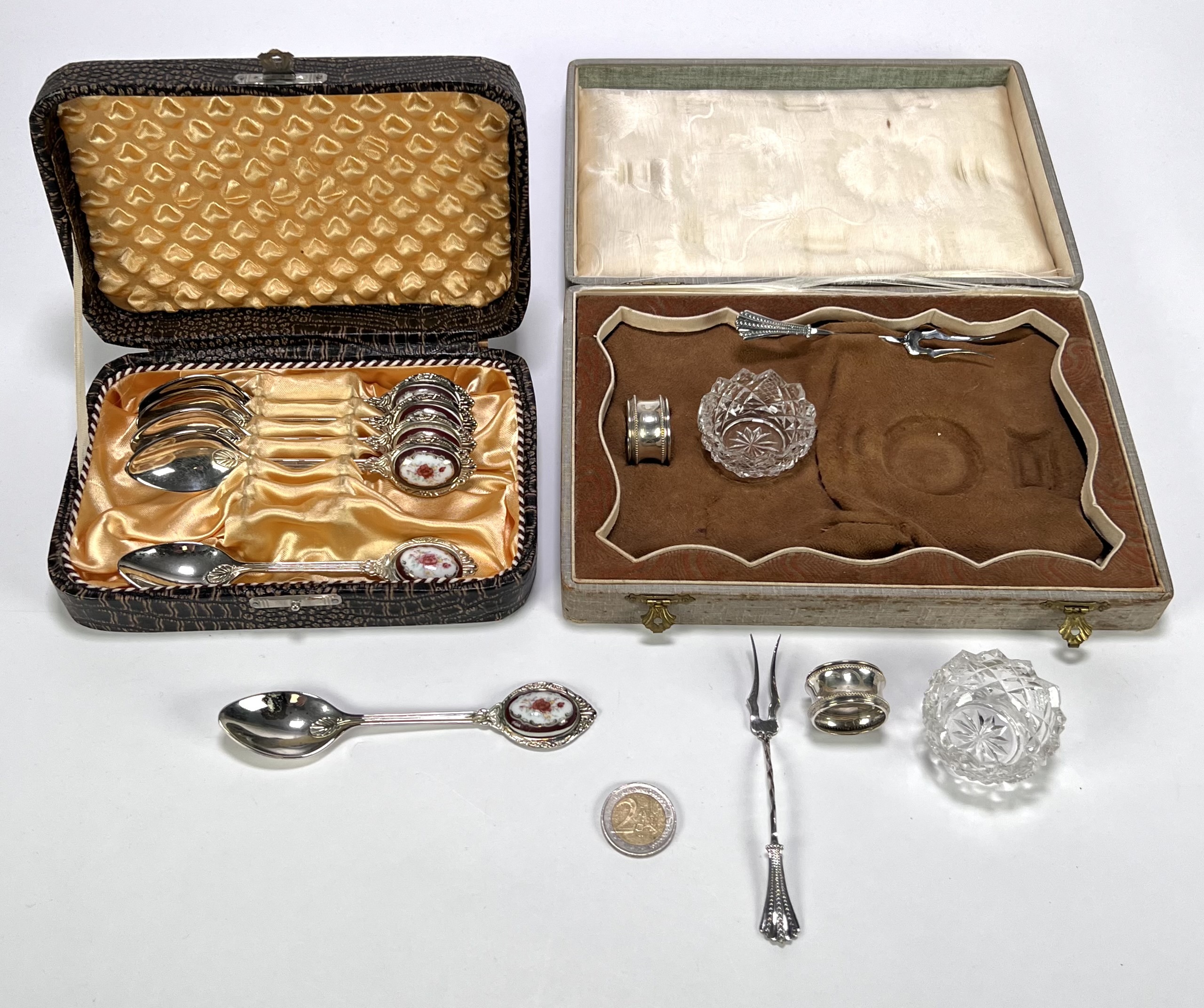 Twee Art Nouveau sets van zilver en verzilverd metaal, circa 1890–1920, een kaviaarset bestaande uit geslepen kristalglas zoutvaatjes, zilveren vorkjes en zilveren servetringen. Daarnaast een set verzilverde theelepels met emaille decoratie. In de originele etuis. Geïnteresseerd? Bezoek onze kijkdagen op 28, 29 of 30 november van 11:00 tot 17:00 uur! |