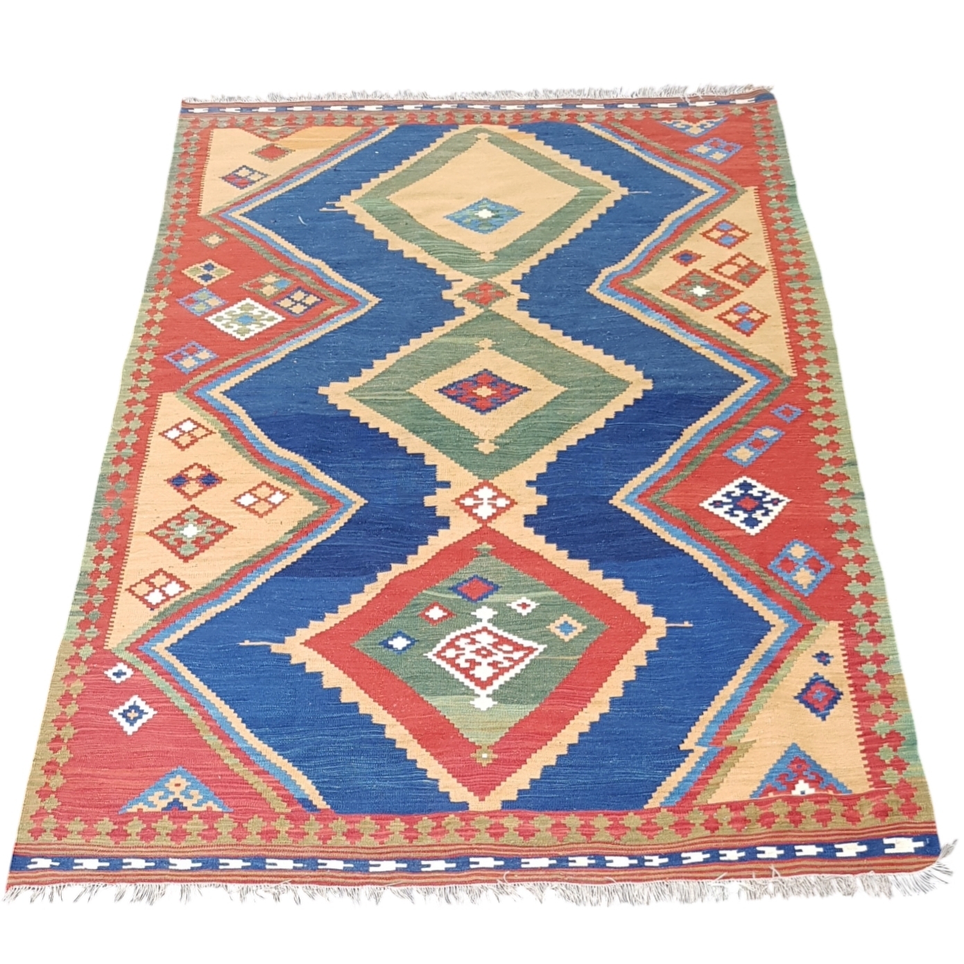 Handgeweven kelim vervaardigd uit wol met behulp van de slit-tapestry techniek. De datering is eind 20e eeuw. De stijl is Anatolisch gekenmerkt door een centraal repetitief motief van grote ruitvormige medaillons in geometrische stijl. De dominante kleuren zijn intens blauw, rood, groen en oker, met brede geometrische randen en witte franjes. Klaar om te bieden? Registreer je nu en doe mee aan de veiling! |