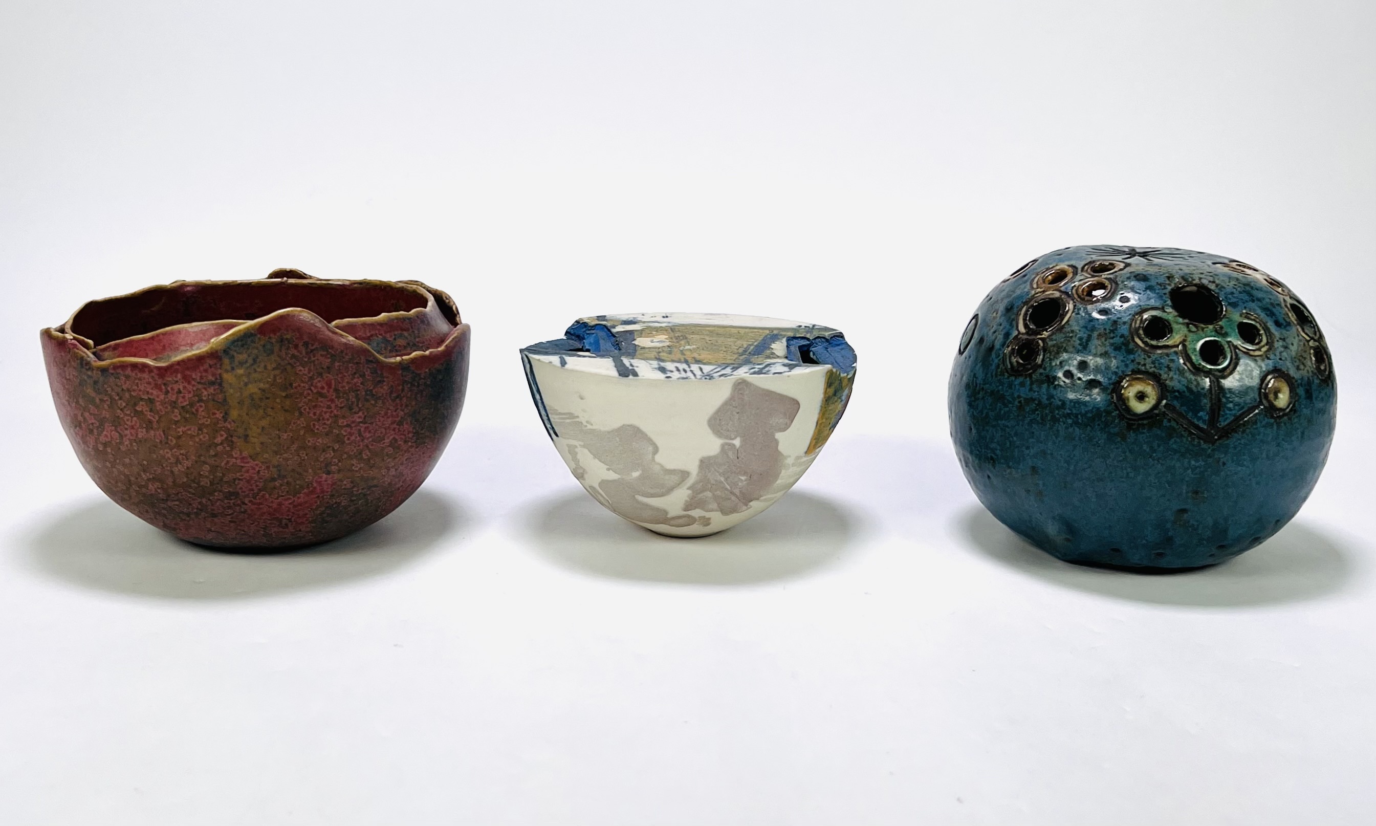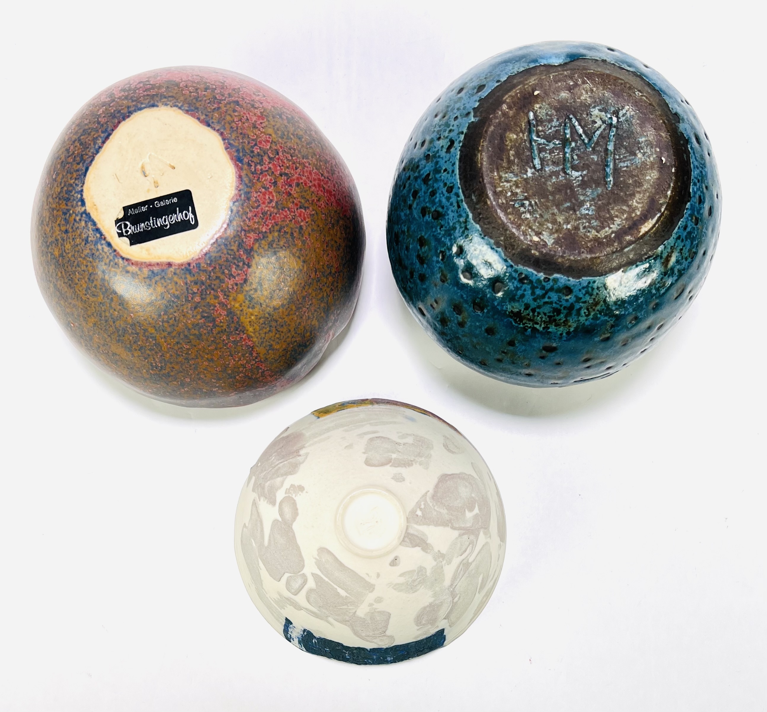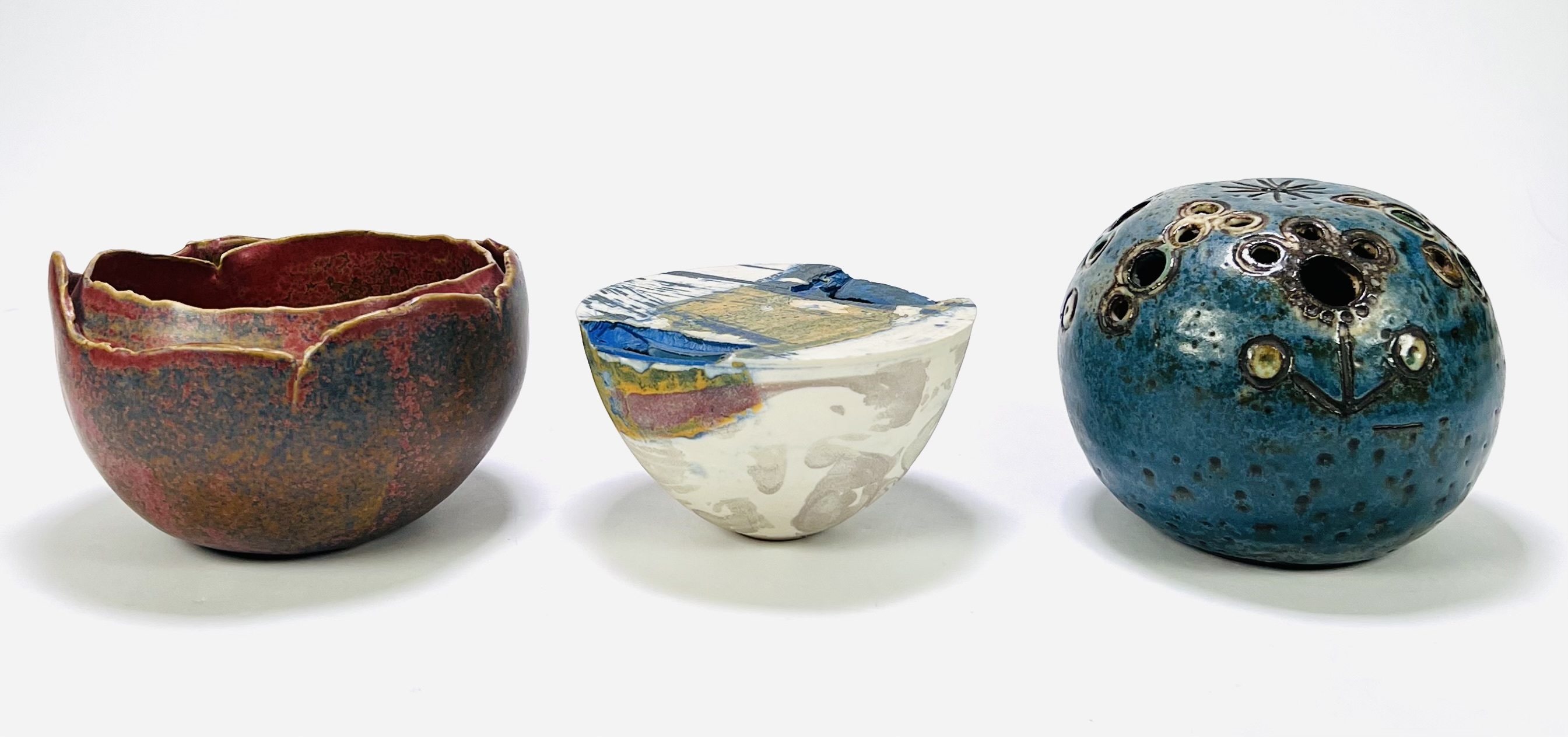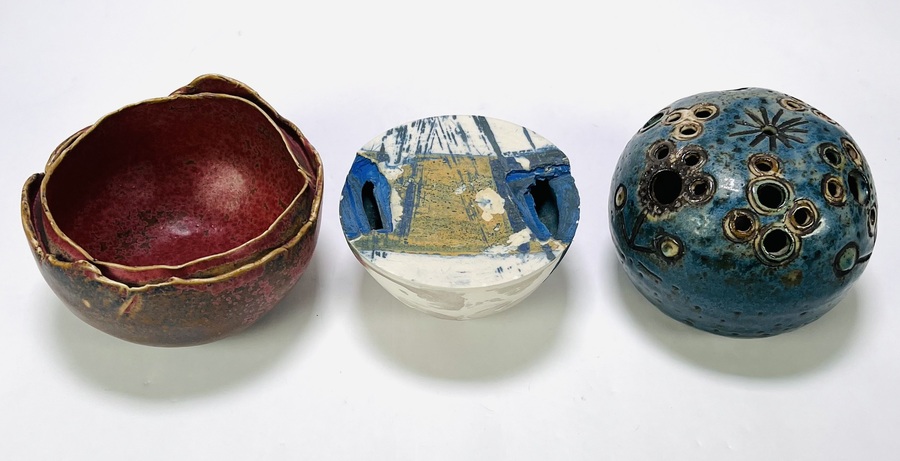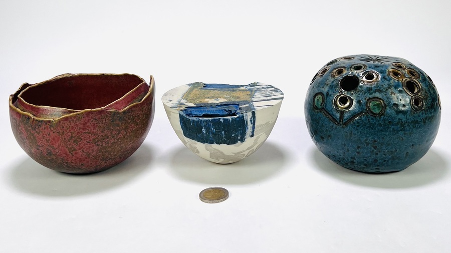 Lot van drie objecten van keramiek, uitgevoerd in diverse expressieve stijlen uit het derde kwart 20e eeuw. Het lot omvat een handgevormde schaal met roodbruin glazuur, een abstract object en een bloemensteker door Hannie Mein (1933-2003). De bolvormige bloemensteker in blauw druipglazuur en perforaties is gesigneerd 'HM' en is kenmerkend voor haar Nederlandse atelierkeramiek. Wil je dit object in het echt bekijken? Kom naar de kijkdagen op 28, 29 en 30 november! |