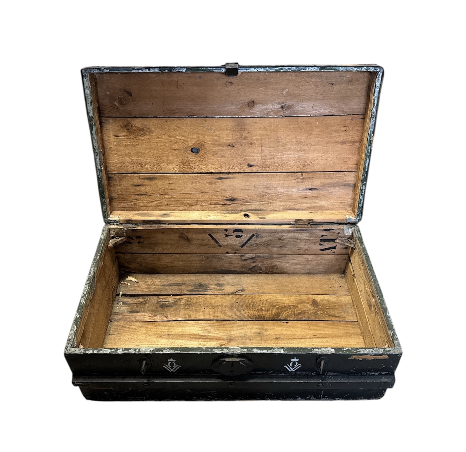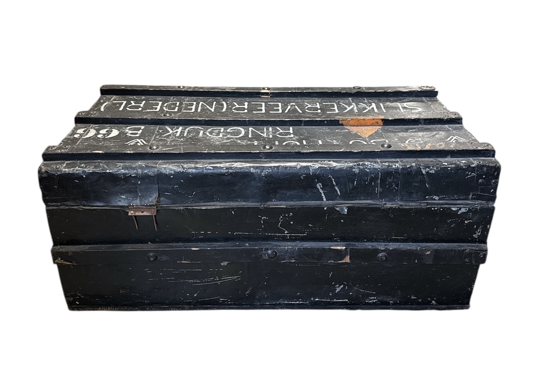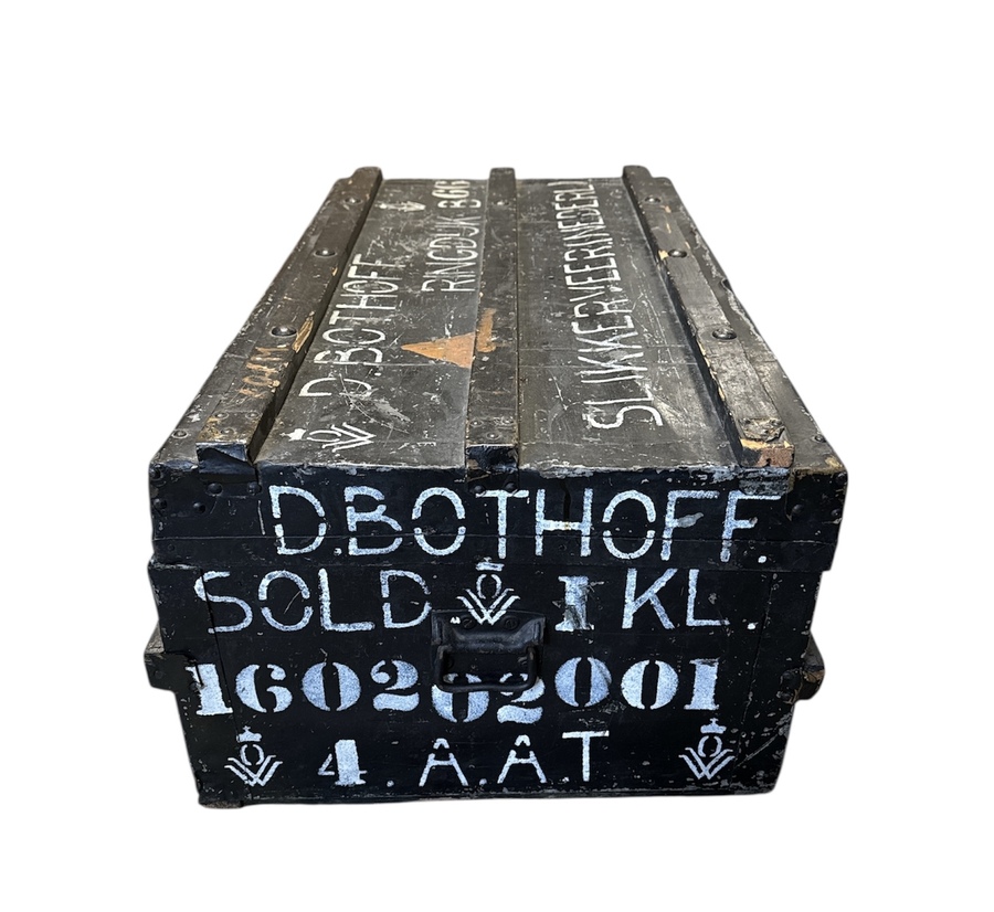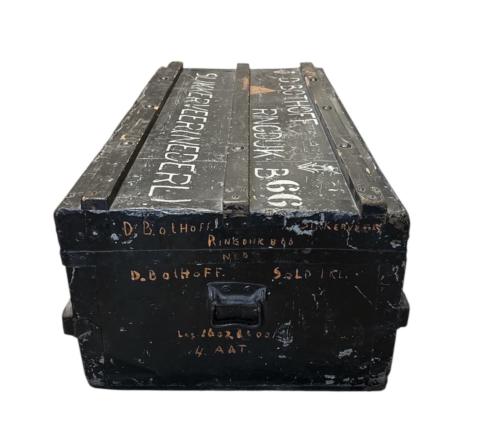 Militaire reiskist van hout bekleed met blik, daterend uit de eerste helft van de 20e eeuw, Nederland. De kist is zwart geschilderd en voorzien van handgeschilderde witte markeringen, waaronder de naam "D. BOTHOFF", de rang "SOLD. 1 KL." en de eenheidsaanduiding "4. A.A.T.". De kist heeft een gewelfd deksel en een robuuste utilitaire constructie. Registreer nu en bied eenvoudig online mee op dit object! |