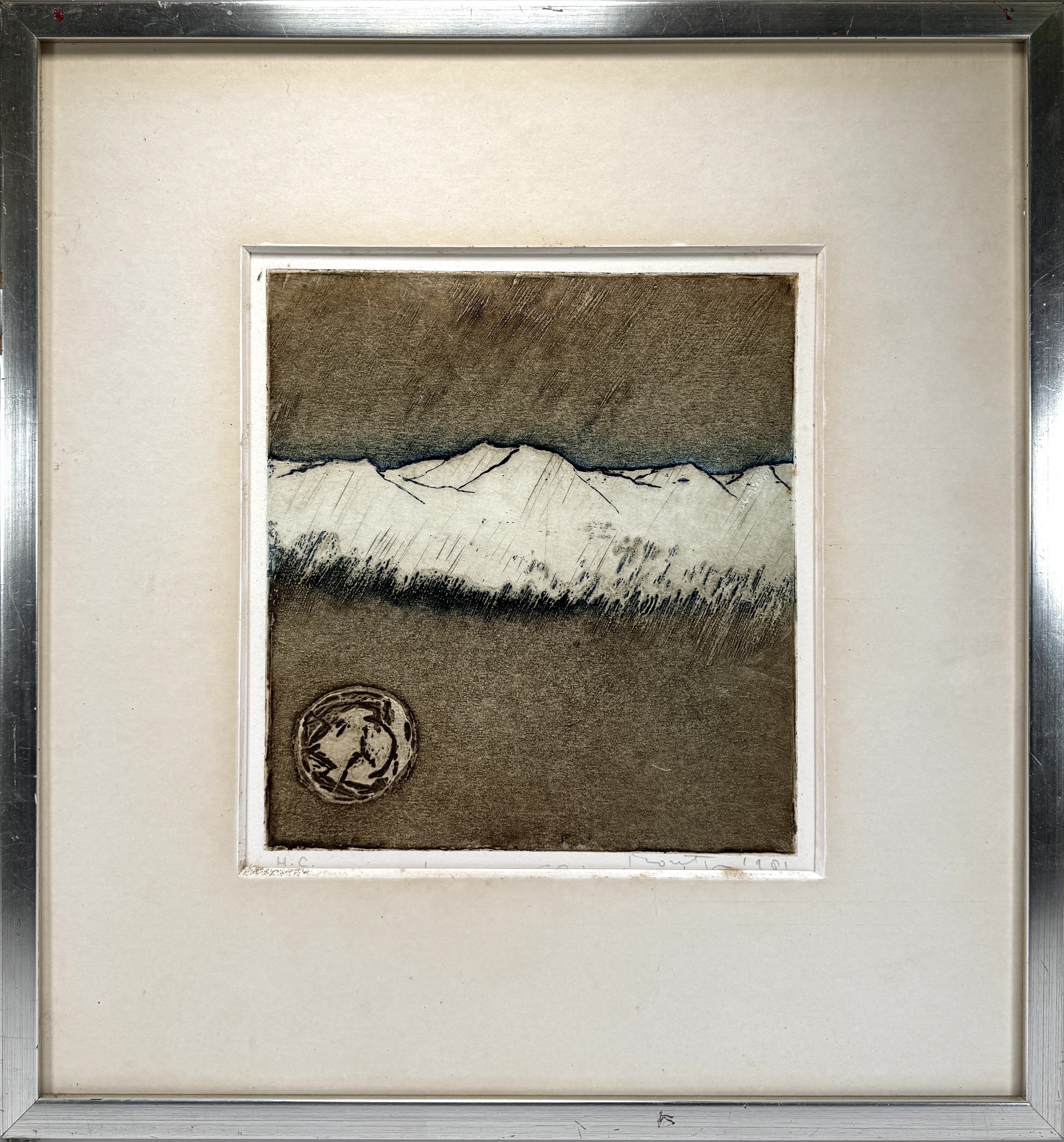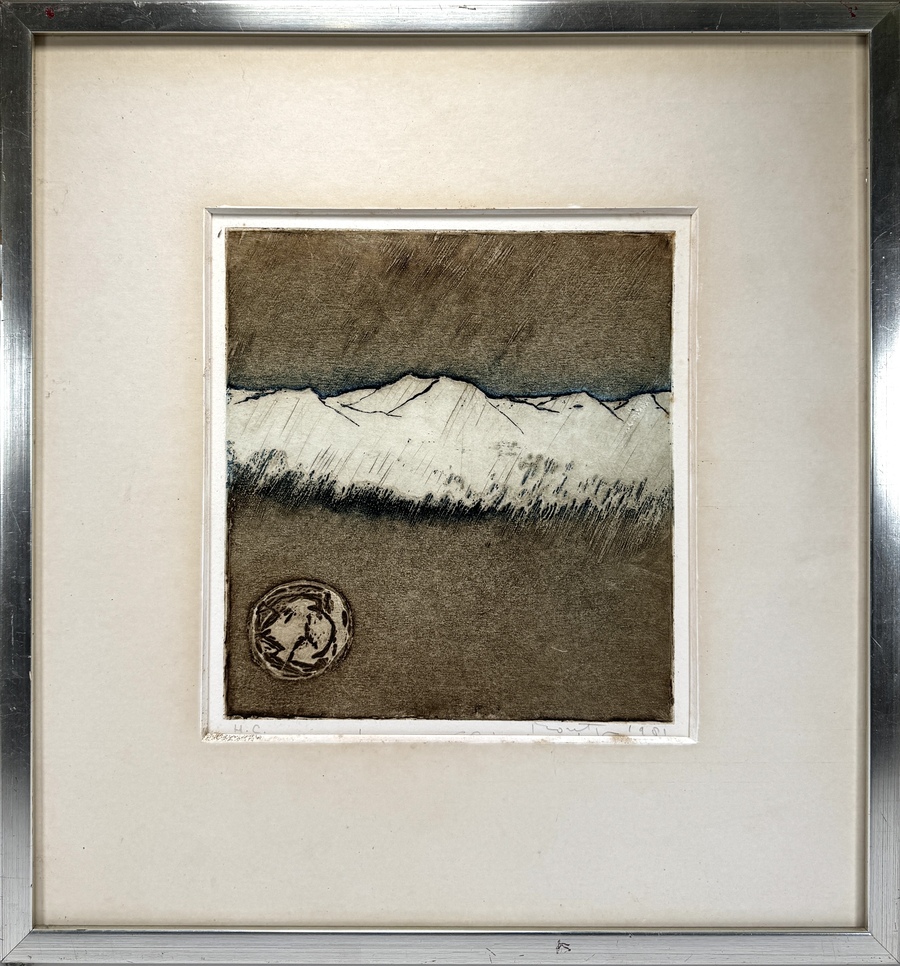Kleurets door Jan Montyn (1924–2015), uitgevoerd in aquatint op papier. Het werk toont een geabstraheerd berglandschap in aardetinten en blauw. Rechtsonder met potlood gesigneerd en gedateerd 1981, linksonder gemarkeerd als H.C. (Hors Commerce). De grafiek bevindt zich in een aluminium lijst met passe-partout. Geïnteresseerd? Bezoek onze kijkdagen op 28, 29 of 30 november van 11:00 tot 17:00 uur! |