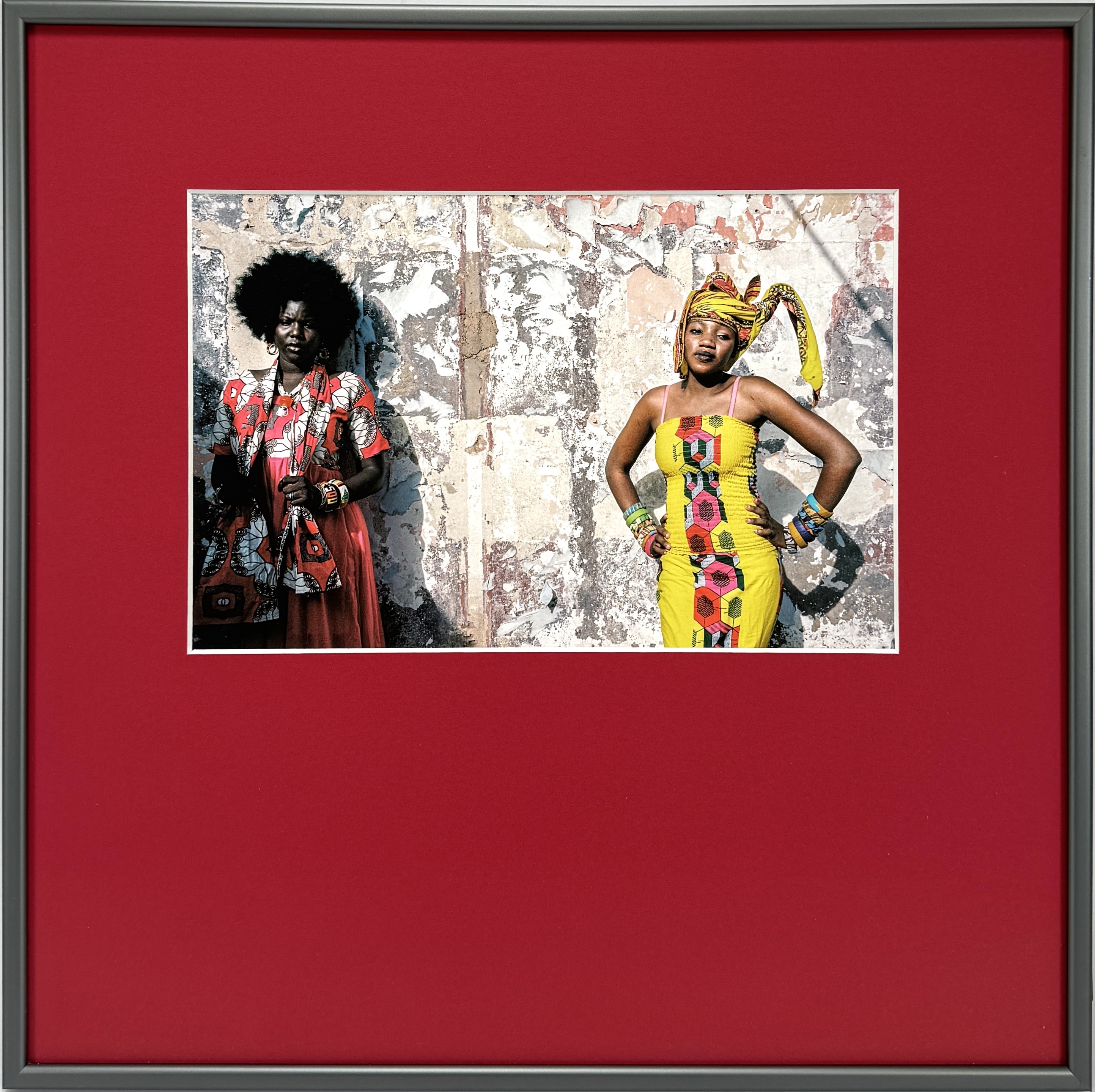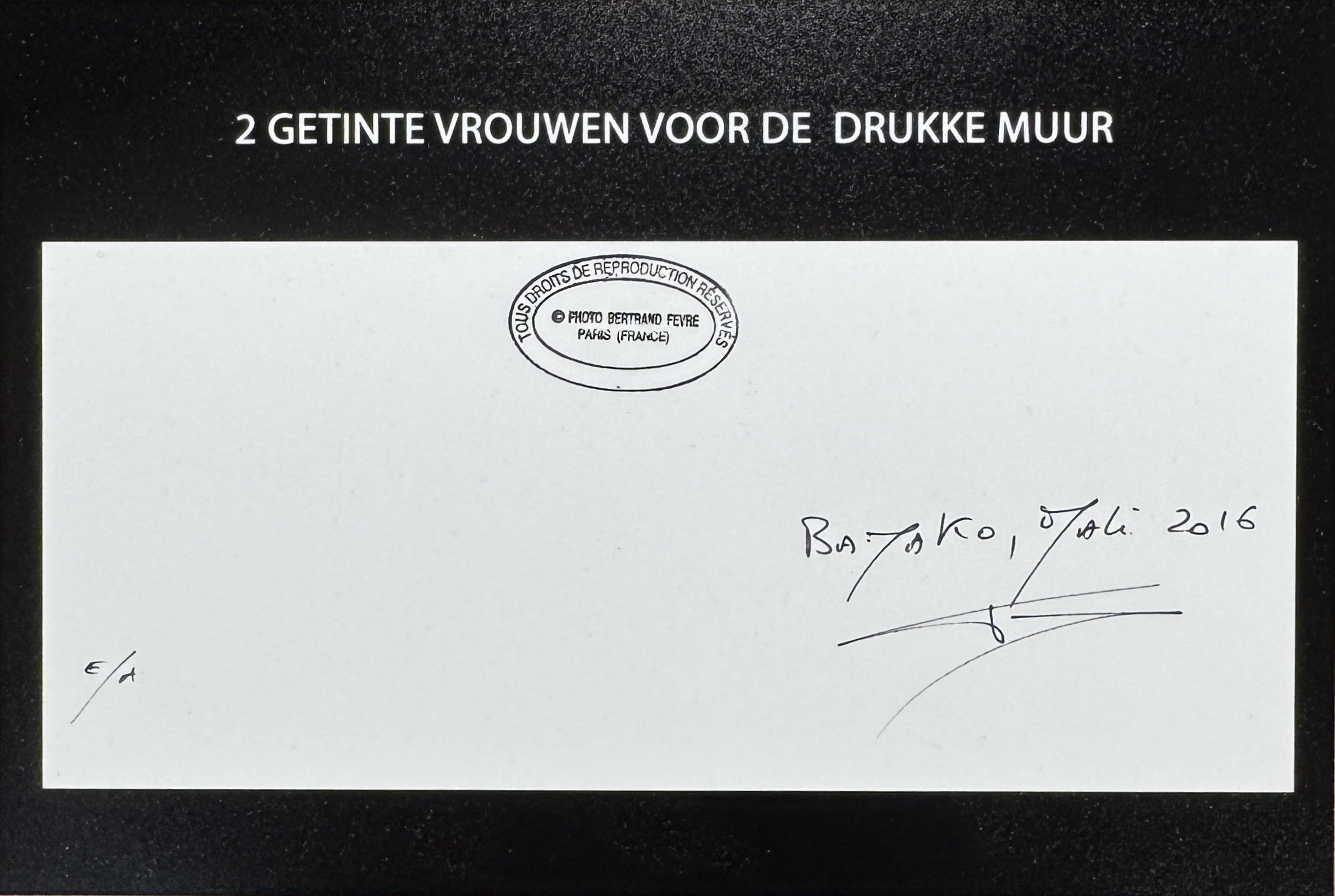 Hedendaagse kleurenfoto met de titel "2 getinte vrouwen voor de drukke muur" van de Franse fotograaf Bertrand Fèvre (1957). De foto uit 2016 toont twee vrouwen in felgekleurde Afrikaanse kleding tegen een verweerde muur. Verso informatie, gesigneerd en vermelding e.a. (épreuve d'artiste). De foto zelf beoordelen? Je bent welkom op onze kijkdagen op 28, 29 en 30 november! |