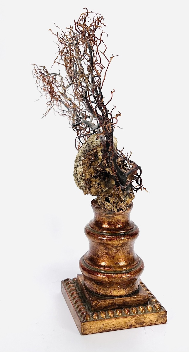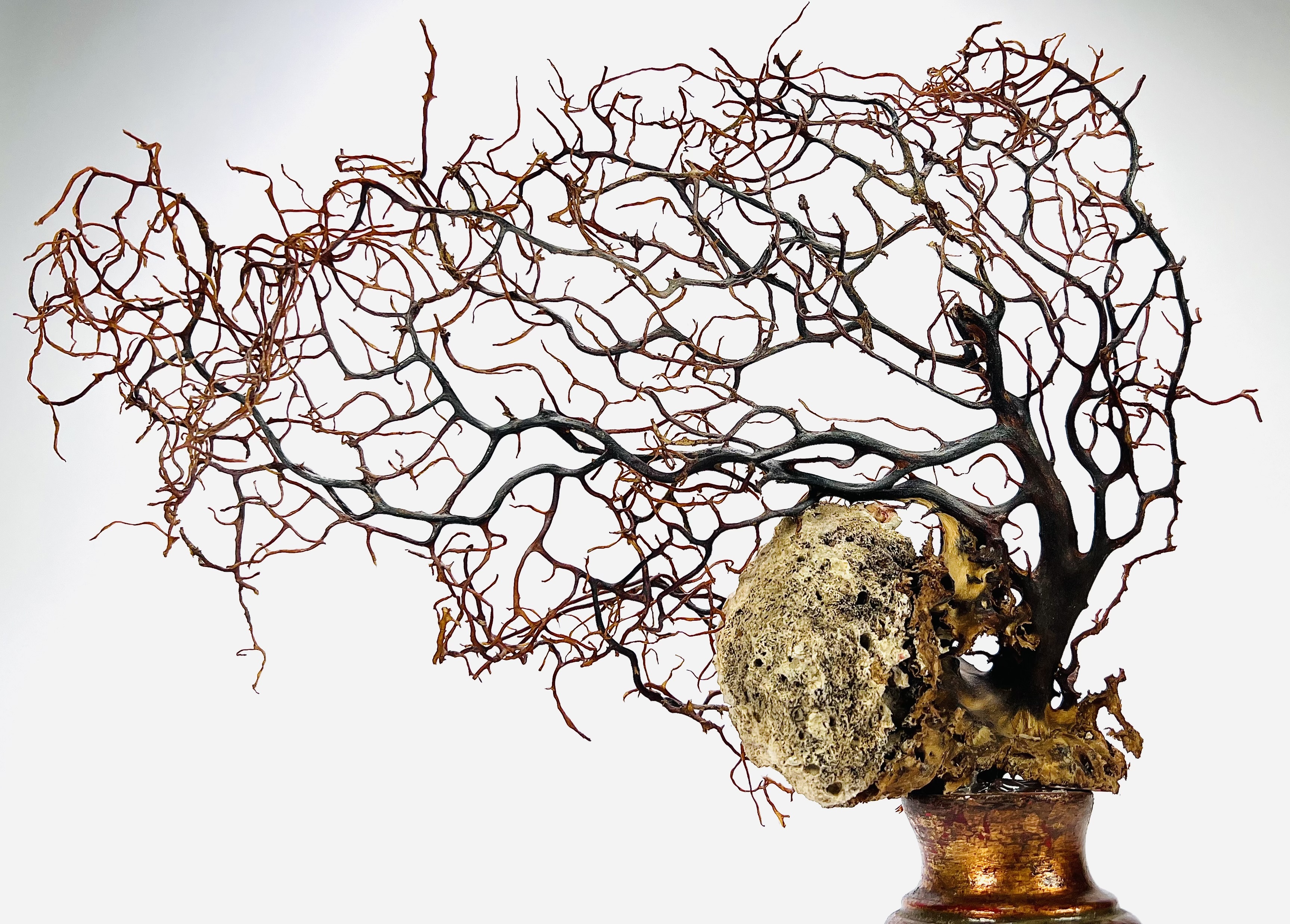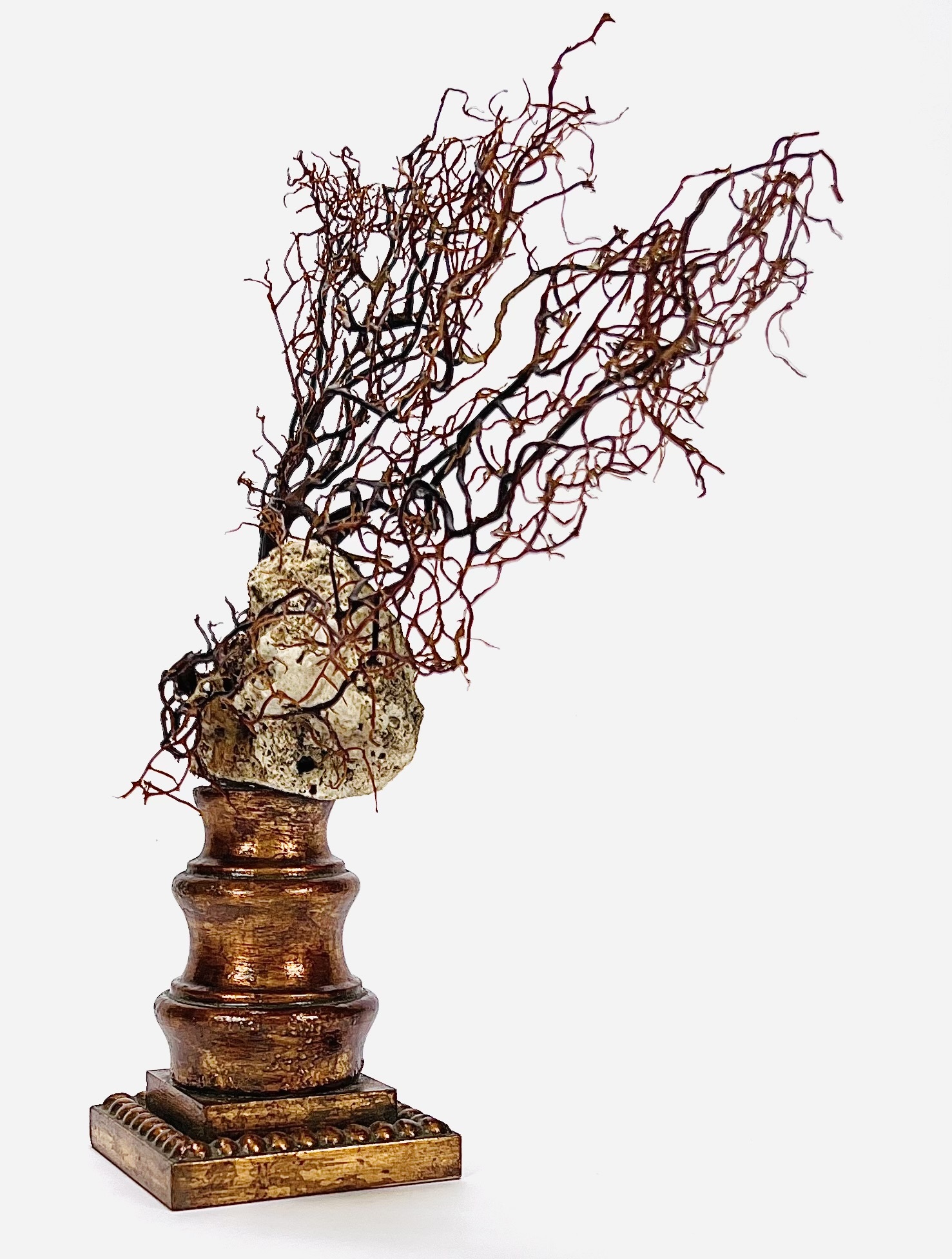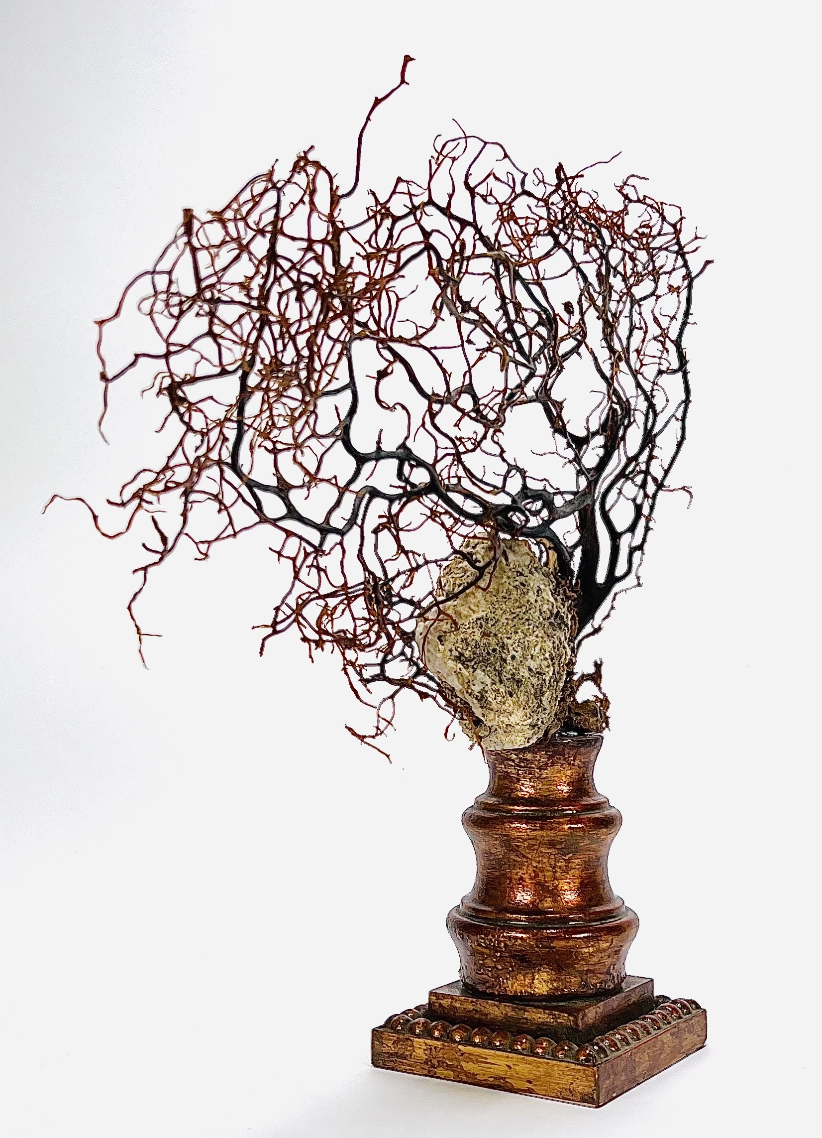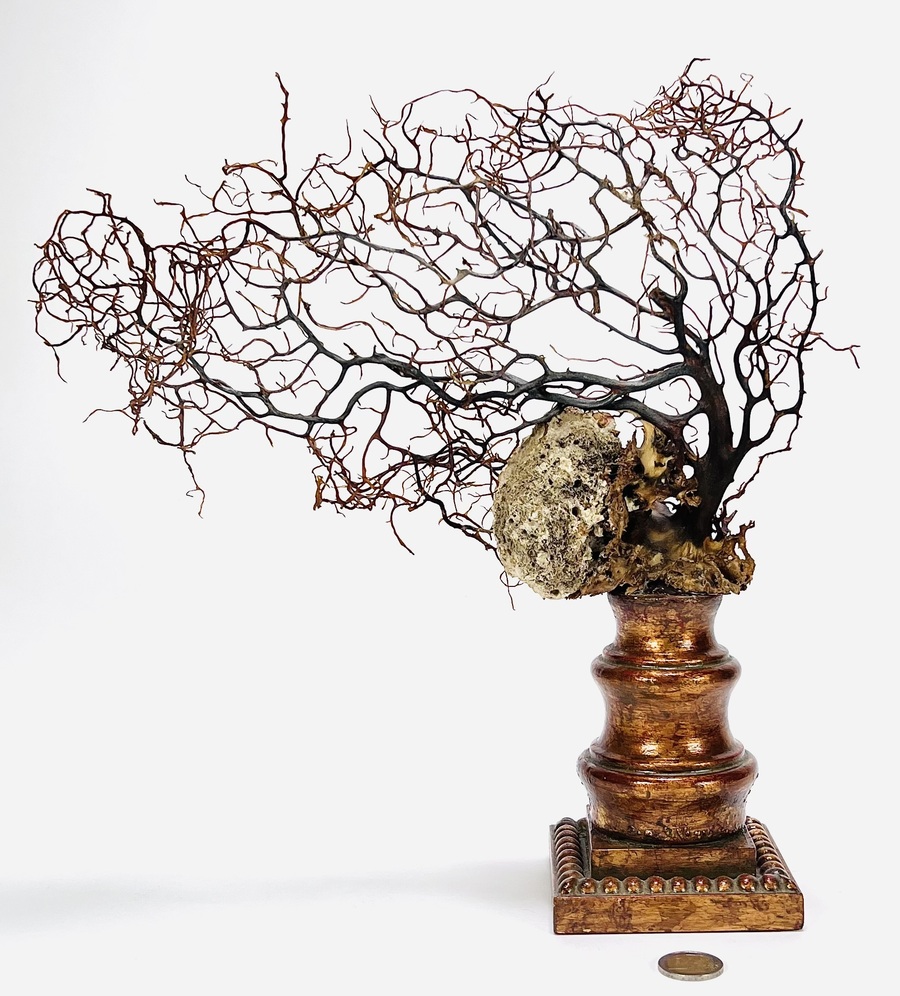 Decoratieve assemblage van een zeewaaier (gorgonian) op een basis van ruwe kalksteen, gemonteerd op een gedraaide houten sokkel, daterend het vierde kwart van de 20e eeuw. De sokkel heeft een neobarokke vormgeving met een metallic bronskleurige afwerking en contrasteert met de organische structuur. Klaar om te bieden? Registreer je nu en doe mee aan de veiling! |