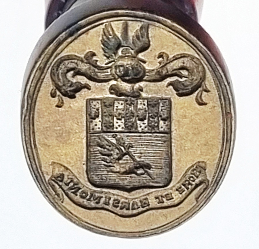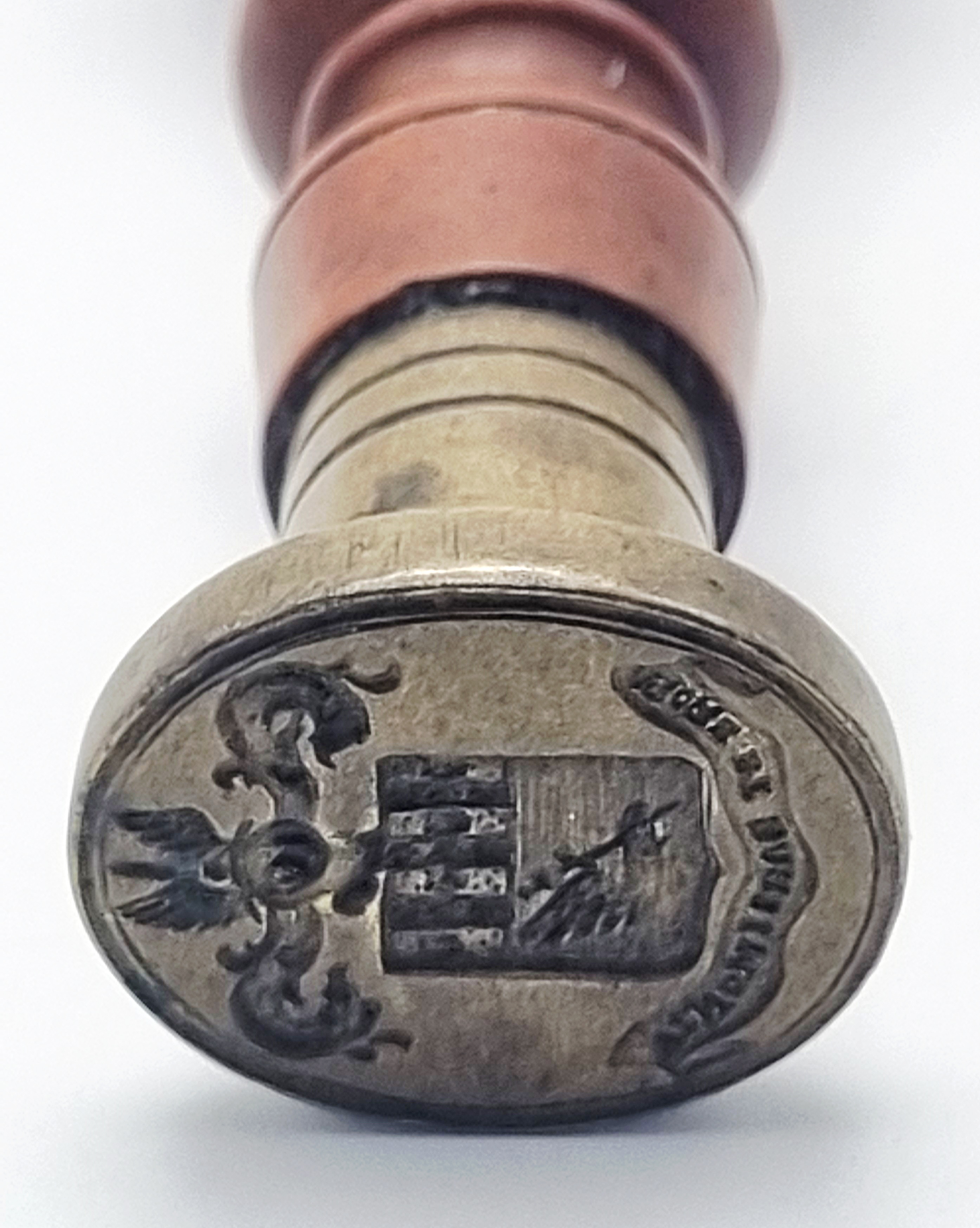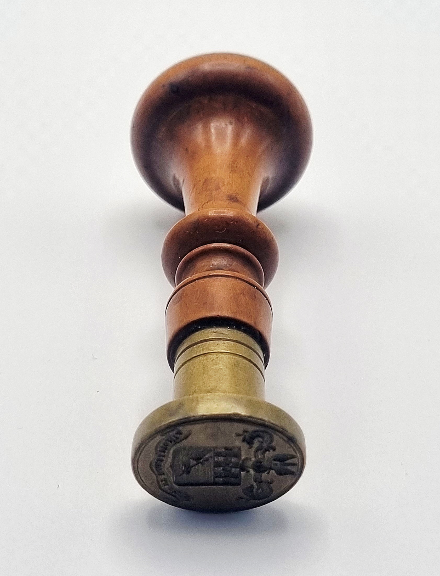 Deze antieke lakstempel uit de eerste helft 19e eeuw is uitgevoerd in een utilitaire Biedermeier en bestaat uit een gedraaid houten handvat en een ovale messing stempelplaat. De plaat is met de hand gegraveerd met een heraldisch familiewapen, inclusief een helmteken en de spiegelbeeldige spreuk "ATHUMICHTE TE EROH" aan de onderzijde. Wil je dit object in het echt bekijken? Kom naar de kijkdagen op 28, 29 en 30 november! |