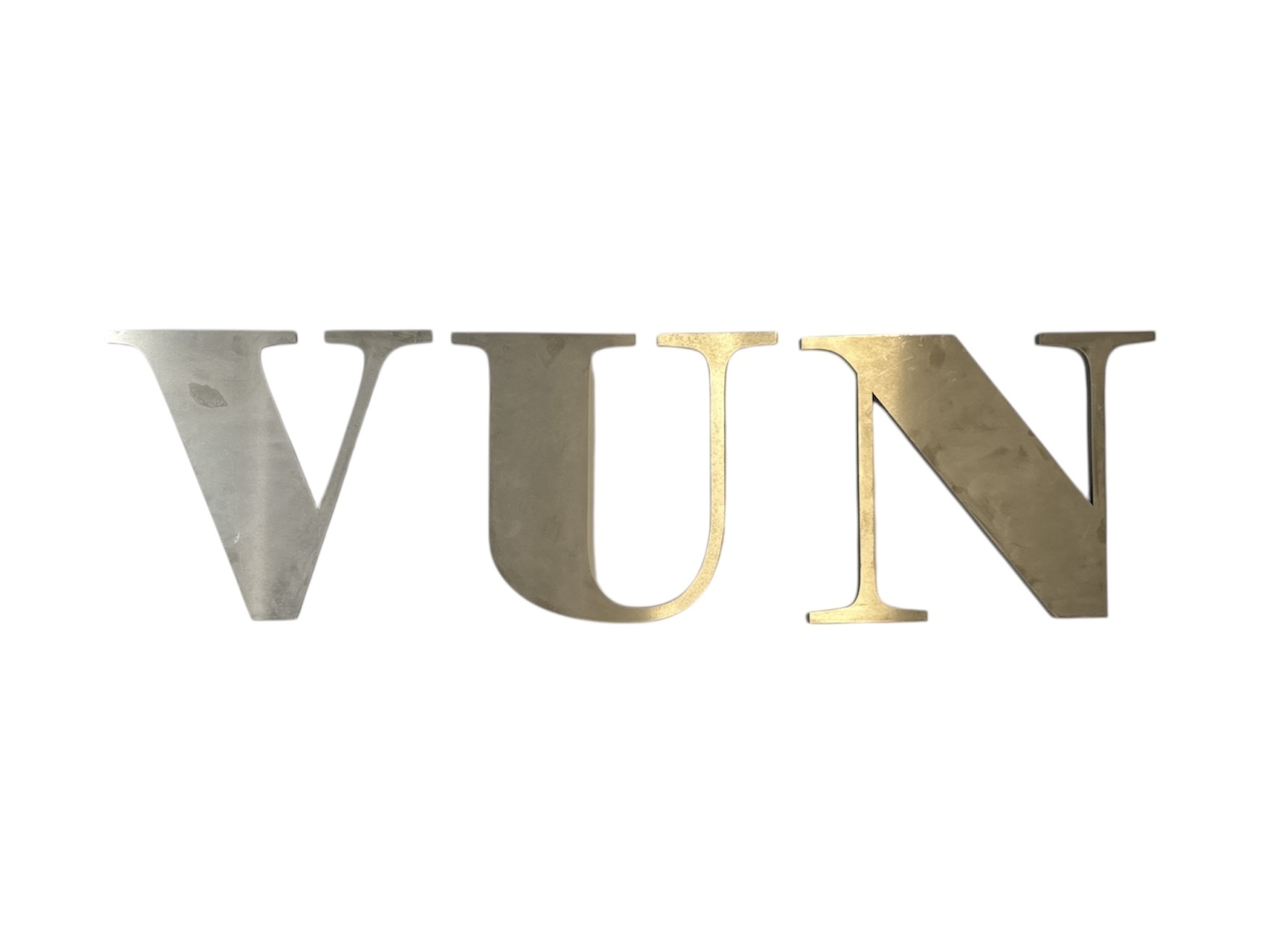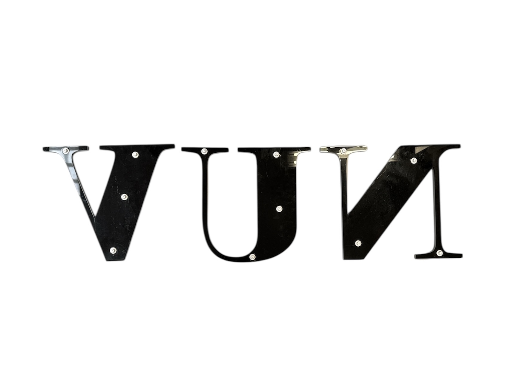 Drie design gevelreclame letters die het woord "VUN" vormen, gemaakt van roestvrij staal en kunststof, circa 2000–2025. De moderne letters zijn uitgevoerd in een strak sans-serif lettertype. Dit letters diende als driedimensionale winkelreclame. Kom langs tijdens de kijkdagen (28 t/m 30 november) en ontdek deze gevelreclame letters zelf! |