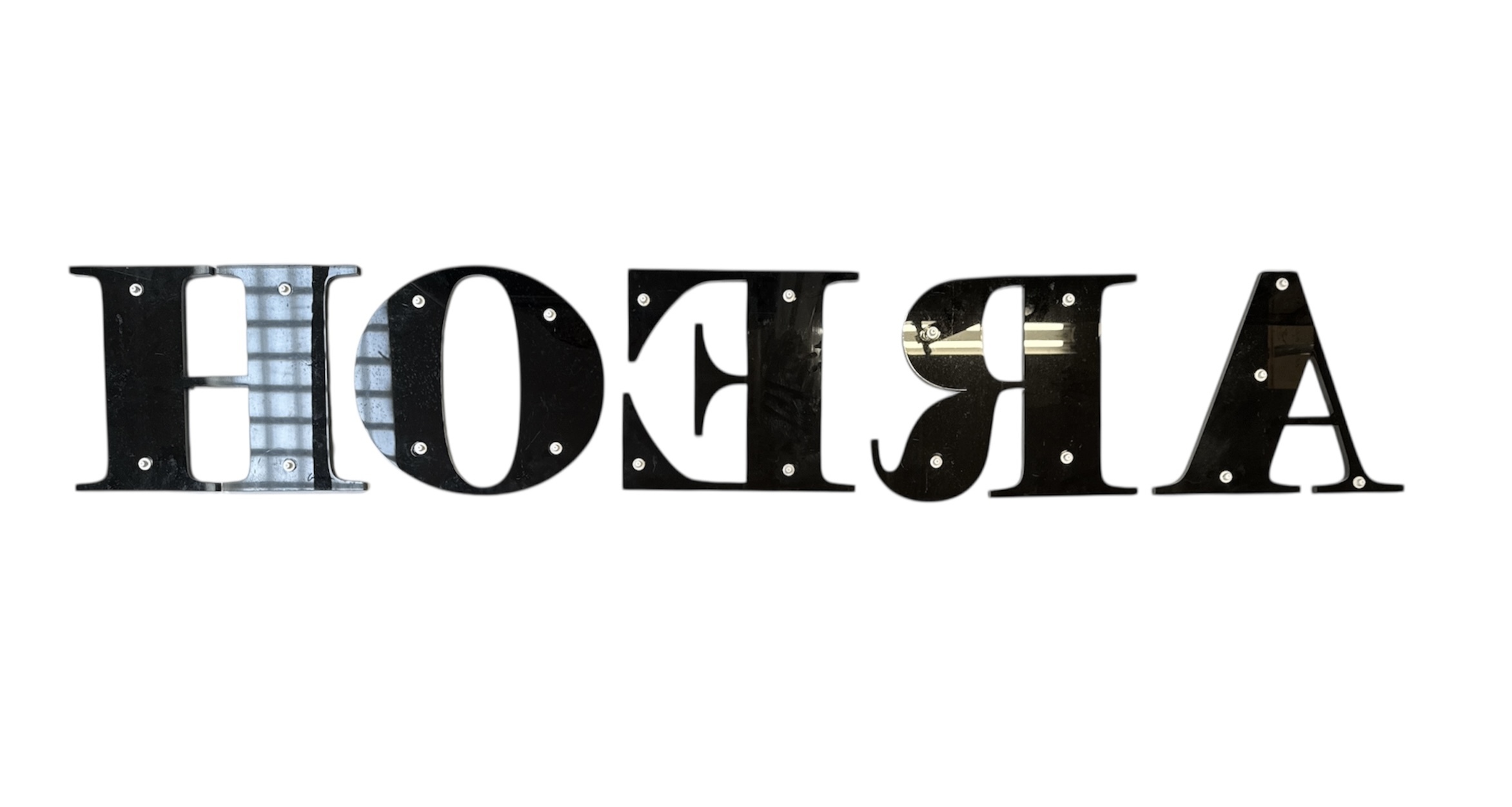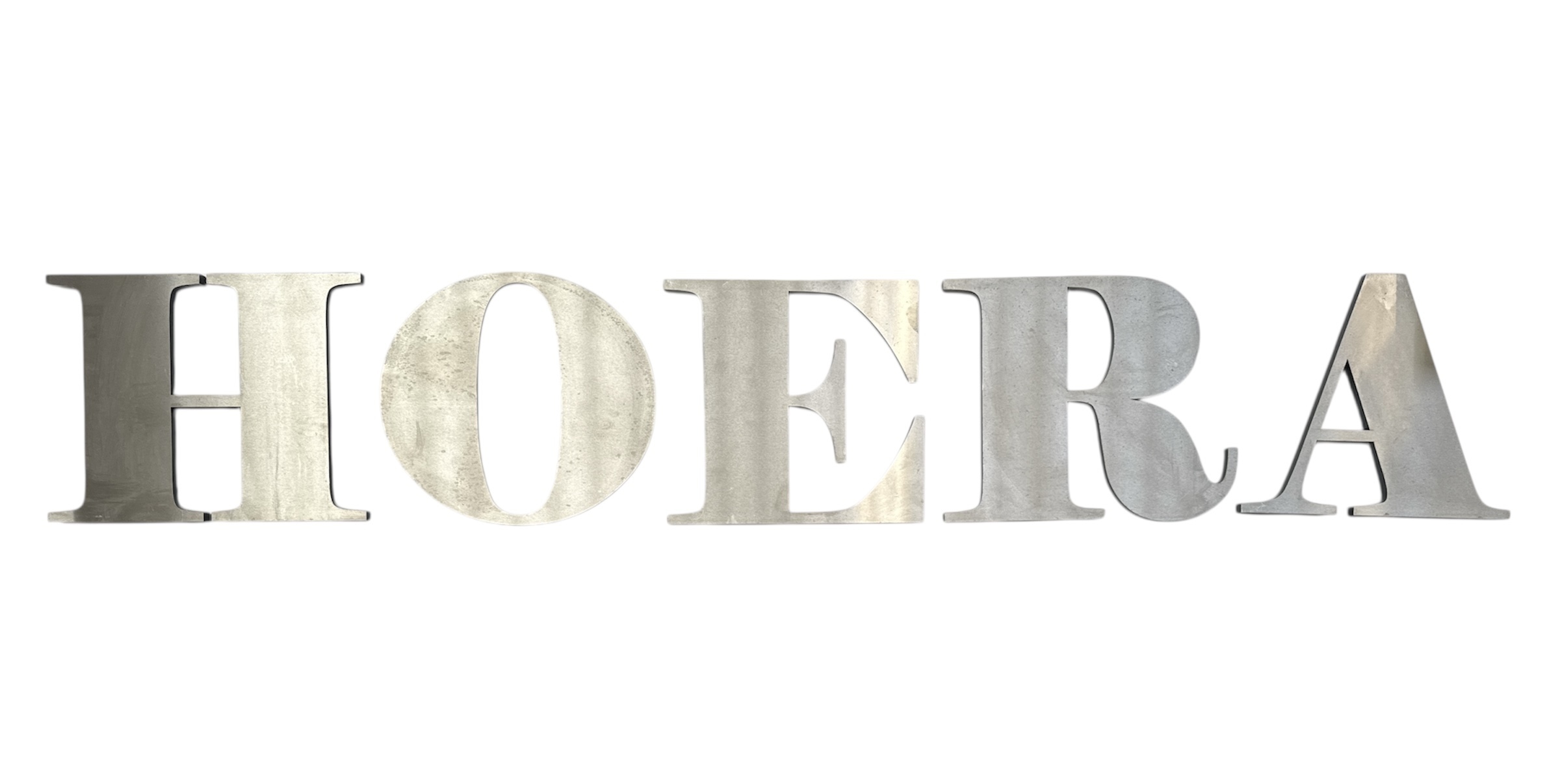 Vijf design gevelreclame letters die het woord "HOERA" vormen, gemaakt van roestvrij staal en kunststof, circa 2000–2025. De moderne letters zijn uitgevoerd in een strak sans-serif lettertype. Dit letters diende als driedimensionale winkelreclame. Kom langs tijdens de kijkdagen (28 t/m 30 november) en ontdek deze gevelreclame letters zelf! |