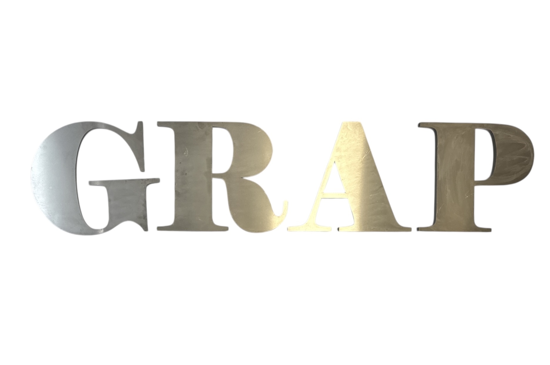 Vier design gevelreclame letters die het woord "GRAP" vormen, gemaakt van roestvrij staal en kunststof, circa 2000–2025. De moderne letters zijn uitgevoerd in een strak sans-serif lettertype. Dit letters diende als driedimensionale winkelreclame. |