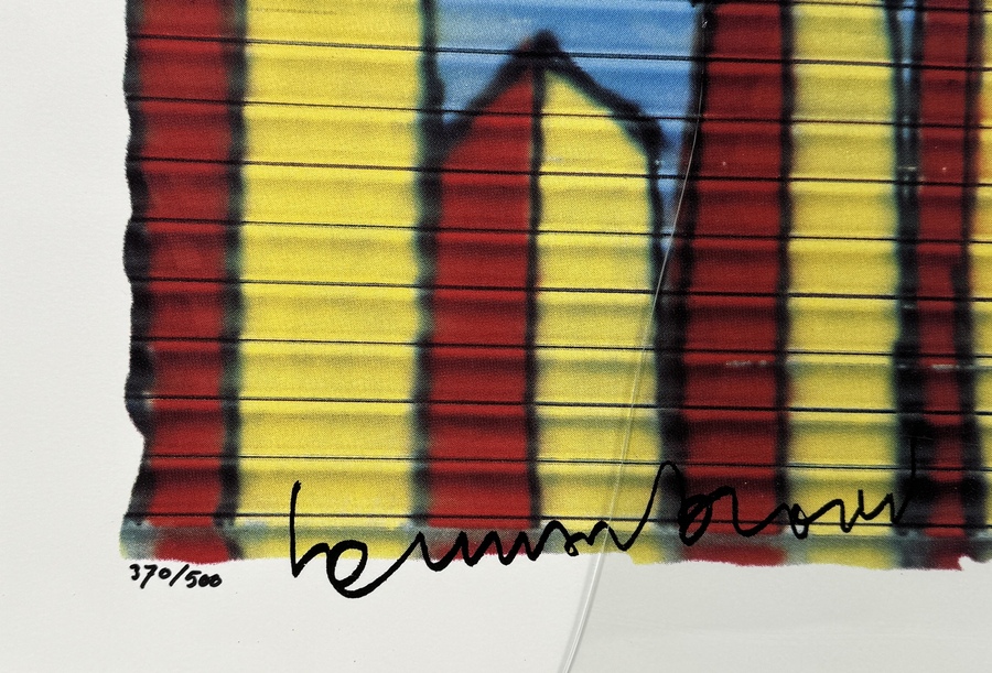 Zeefdruk, getiteld "Vliegtuig", door de Nederlandse kunstenaar Herman Brood (1946–2001). Het werk in neo-expressionistische stijl met popart invloeden toont een vliegtuig boven gestileerde gebouwen in rood en geel. Linksonder oplagenummer 370/500 en signatuur. Geïnteresseerd? Bezoek onze kijkdagen op 28, 29 of 30 november van 11:00 tot 17:00 uur! |