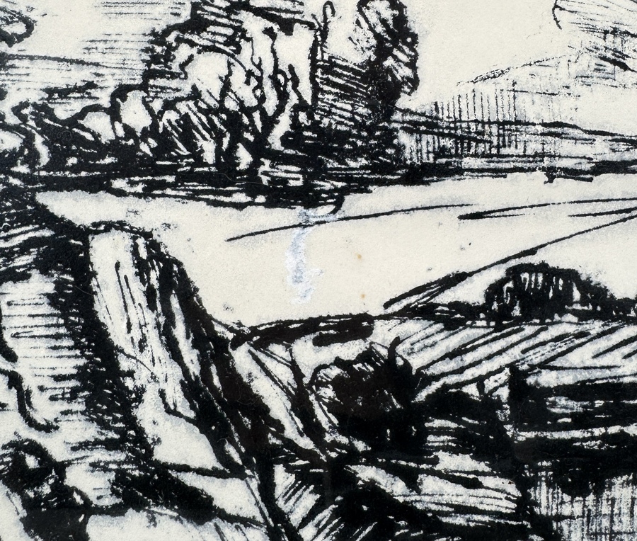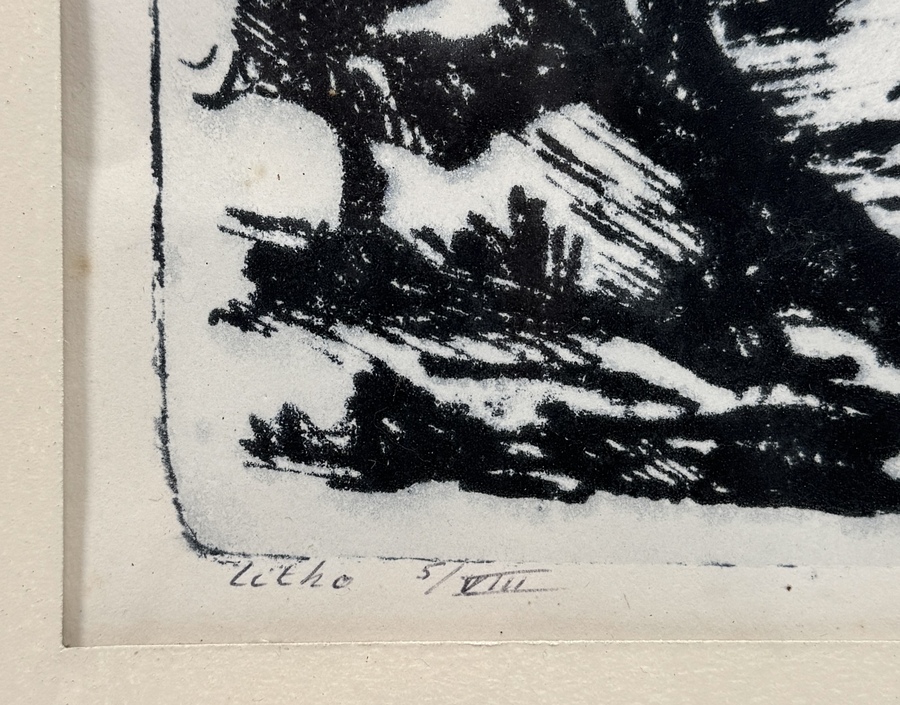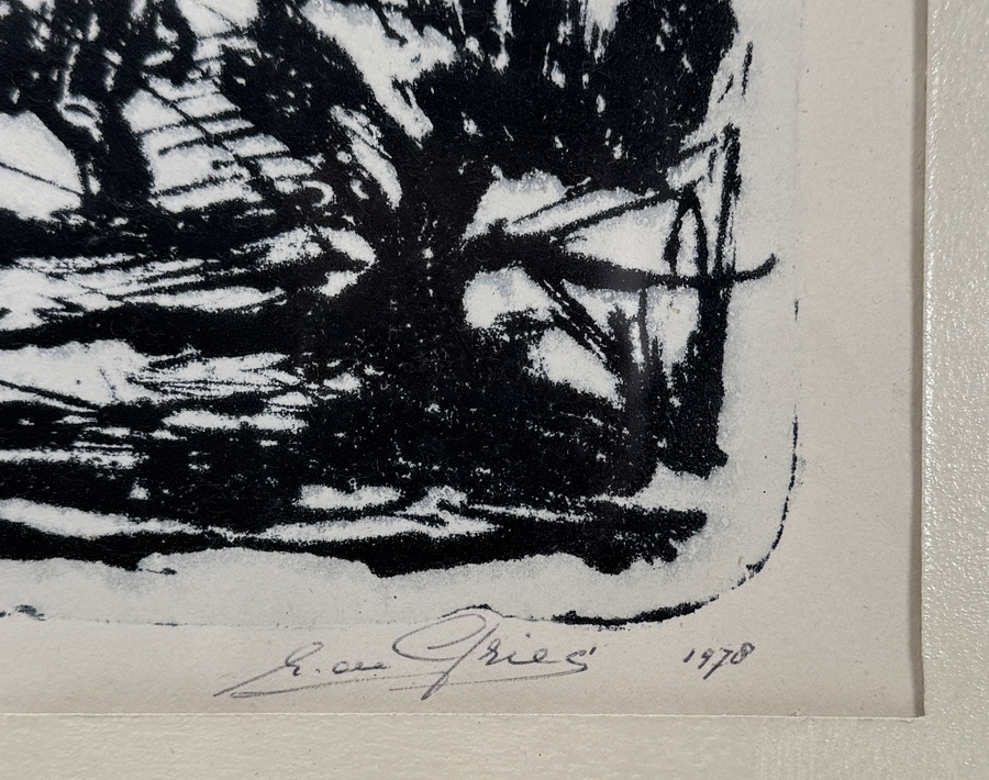 Litho op papier door Groningse kunstenaar Egbert de Gries (1933-2012), getiteld “Landschap met bron”, 1970. Genummerd 5/XII en rechtsonder gesigneerd. Het werk toont een expressionistisch landschap met centraal een bron, omlijst door bomen en rotsformaties, in krachtige lijnvoering uitgevoerd. Afkomstig uit de gemeentelijke artotheek Hefshuizen, Groningen. Geïnteresseerd? Bezoek onze kijkdagen op 28, 29 of 30 november van 11:00 tot 17:00 uur! |