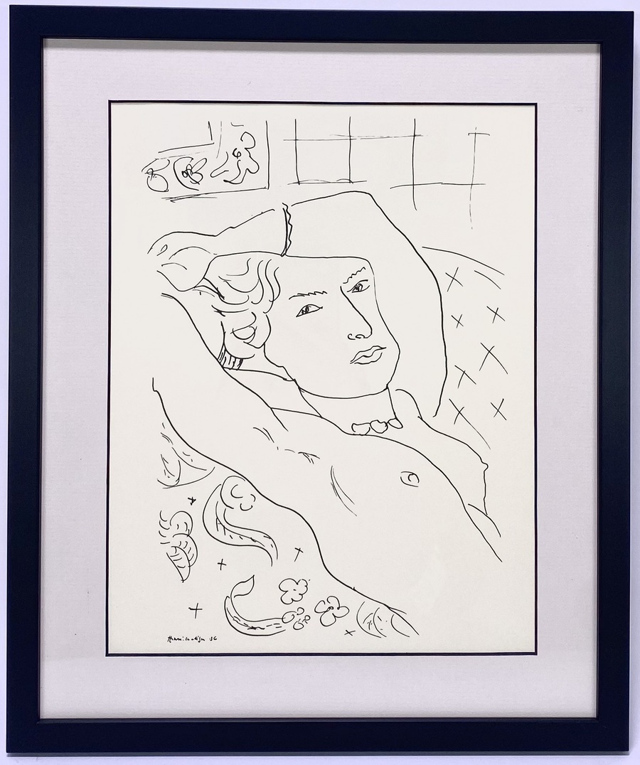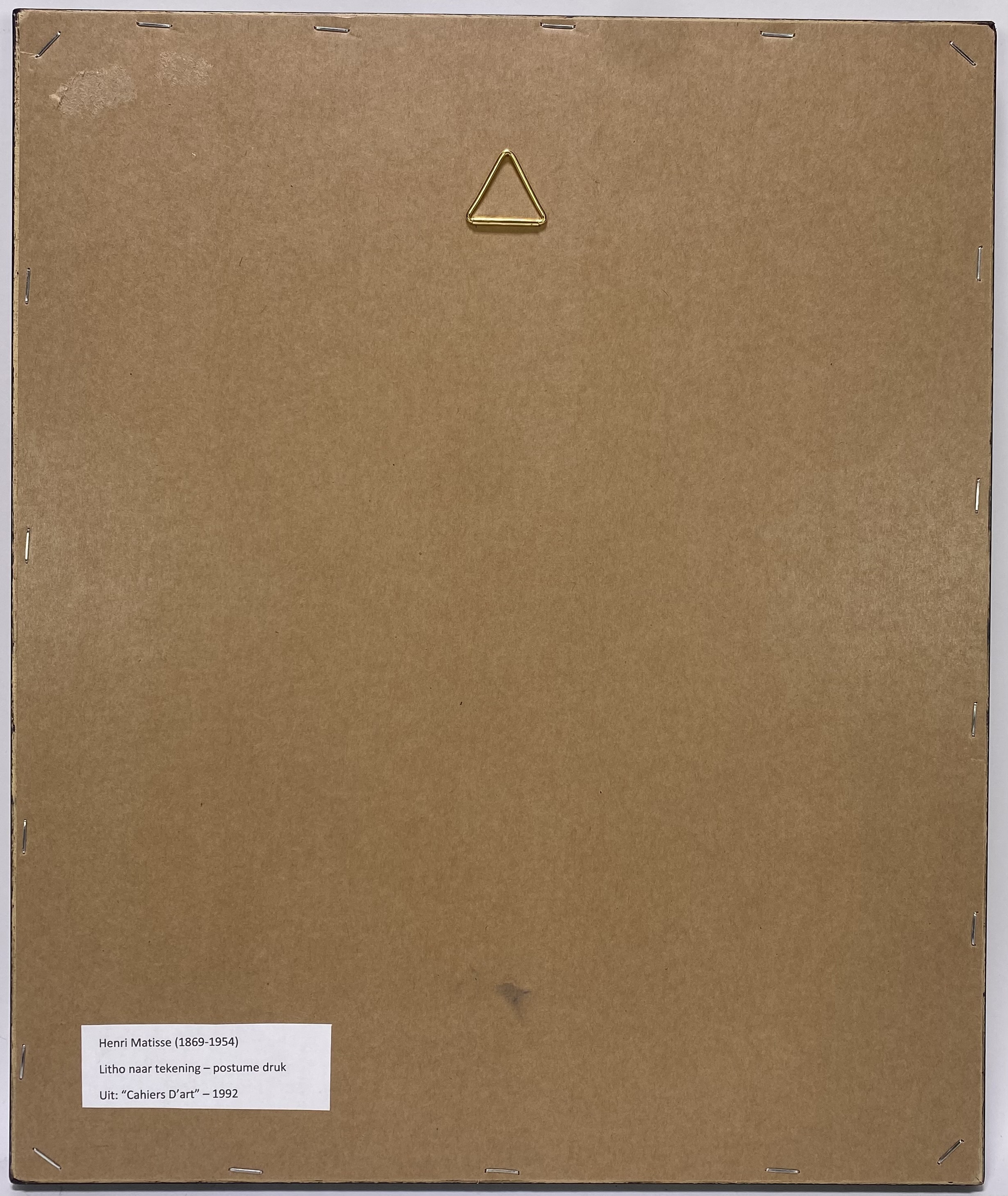 Litho naar een tekening van Henri Matisse (1869–1954), gesigneerd en gedateerd in de plaat met 'Henri.Matisse 36'. Dit werk toont een liggend vrouwelijk naakt, uitgevoerd in de minimalistische contourlijn van de kunstenaar. Het is een postume litho op papier, afkomstig uit een uitgave van het kunsttijdschrift Cahiers d'Art van 1992. Het werk is ingelijst in een eenvoudige, zwarte lijst. Zeker zijn van deelname? Plaats vanaf 21 november een schriftelijk bod online! |