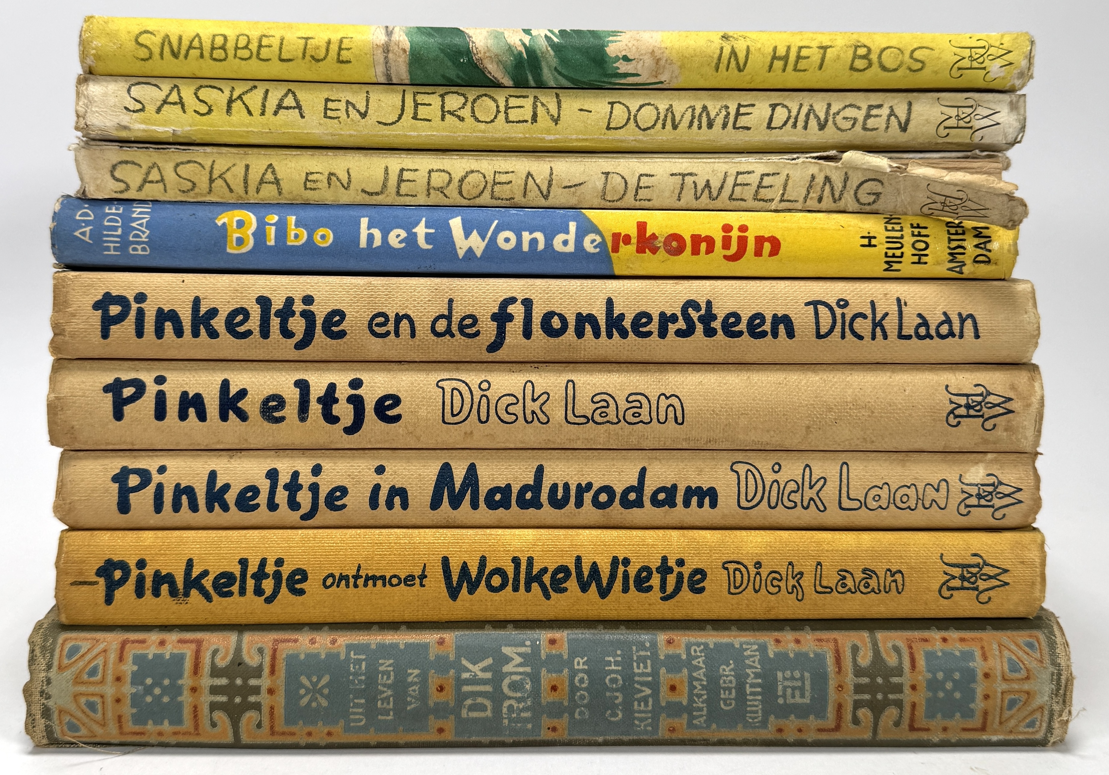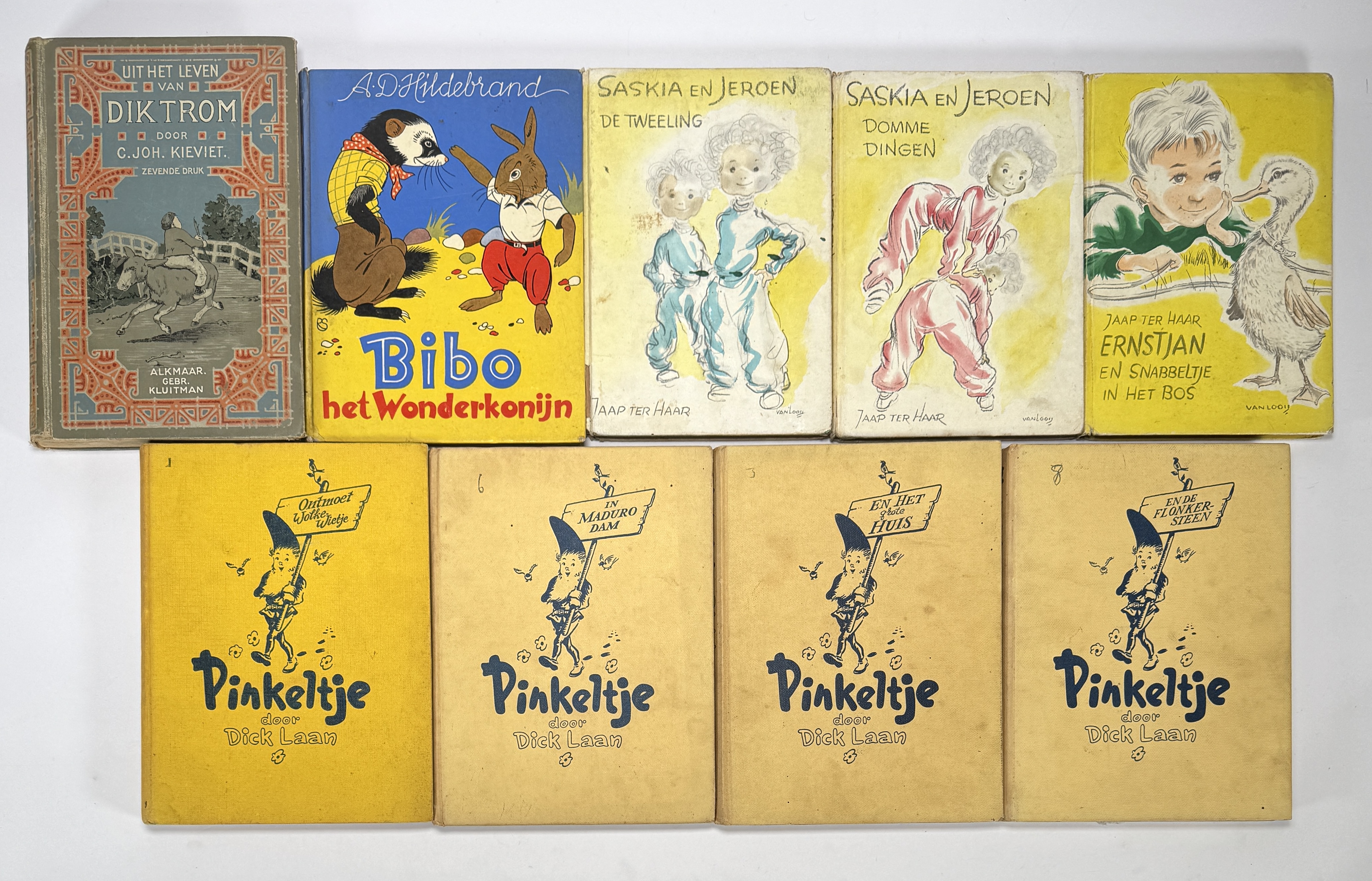 Negen Nederlandse kinderboeken uit de jaren vijftig en zestig; vier delen van de serie 'Pinkeltje' door Dick Laan, twee delen van 'Saskia en Jeroen' door Jaap ter Haaren, een deel van 'Dik Trom' door C. Joh. Kieviet, een deel Ernstjan en Snabbeltje door Jaap ter Haaren en een deel van 'Bibo' door A.D. Hildebrand. Eerst deze boeken zien voordat je biedt? Bezoek onze kijkdagen op 28, 29 en 30 november van 11:00 tot 17:00 uur! |