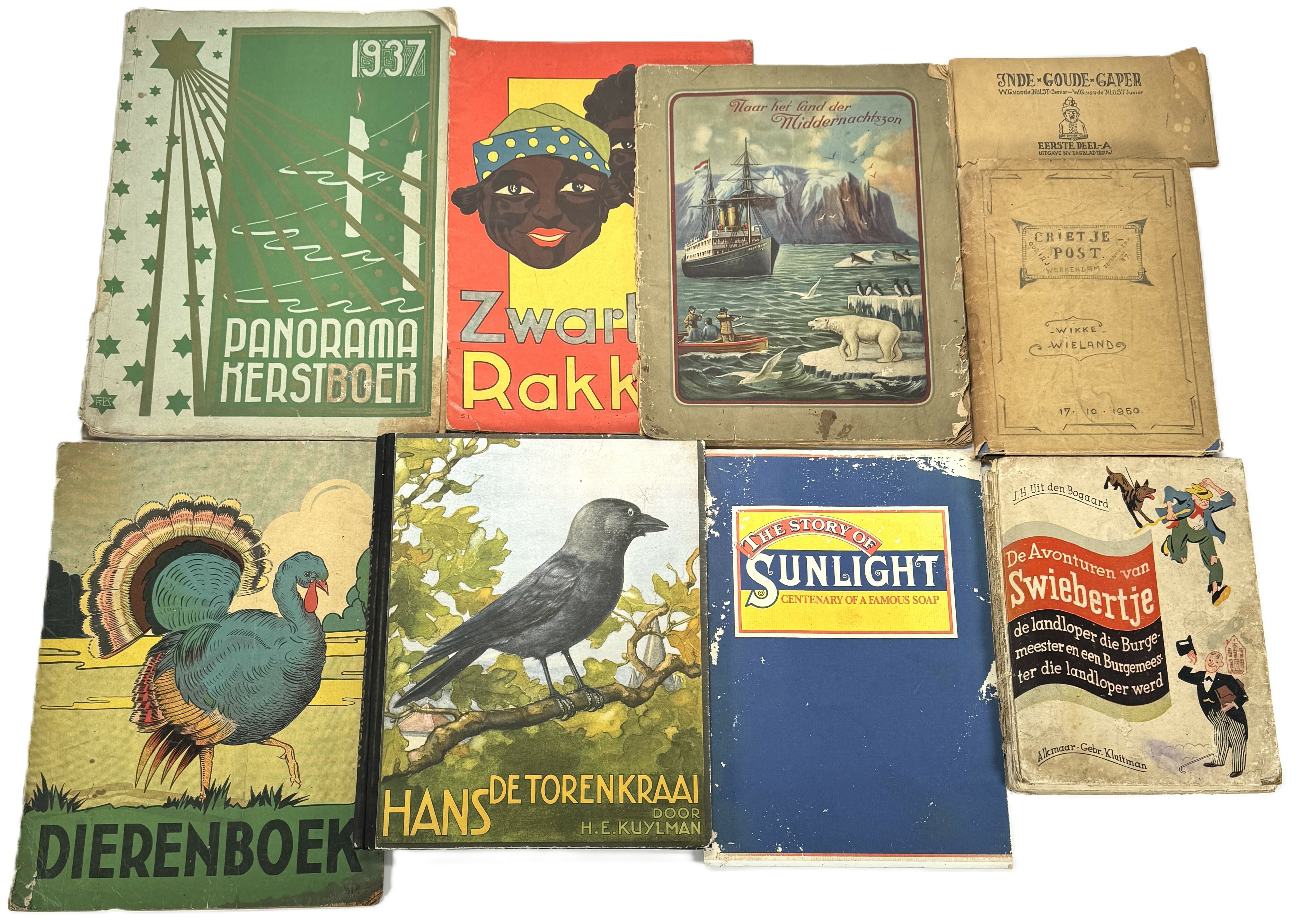 Nederlandse kinder-, school- en promotieboeken uit de eerste helft tot midden 20e eeuw, bestaande uit o.a. Panorama Kerstboek 1937, De avonturen van Swiebertje, Hans de Torenkraai en The Story of Sunlight. Overwegend gedrukt in offset en lithografie, met geïllustreerde omslagen, reclame- en educatieve thema’s. Papier en karton, diverse uitgeverijen. Wil je direct deelnemen? Plaats vanaf 21 november alvast een schriftelijk bod via onze website! |