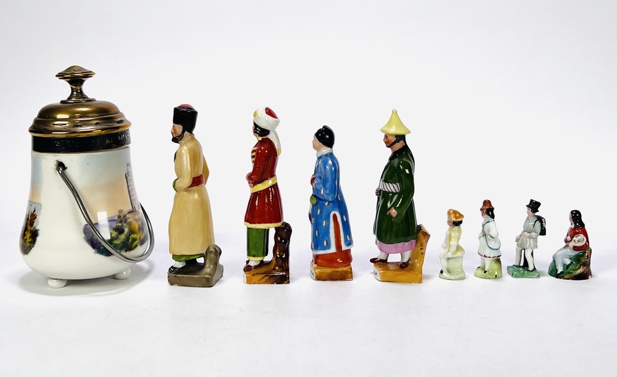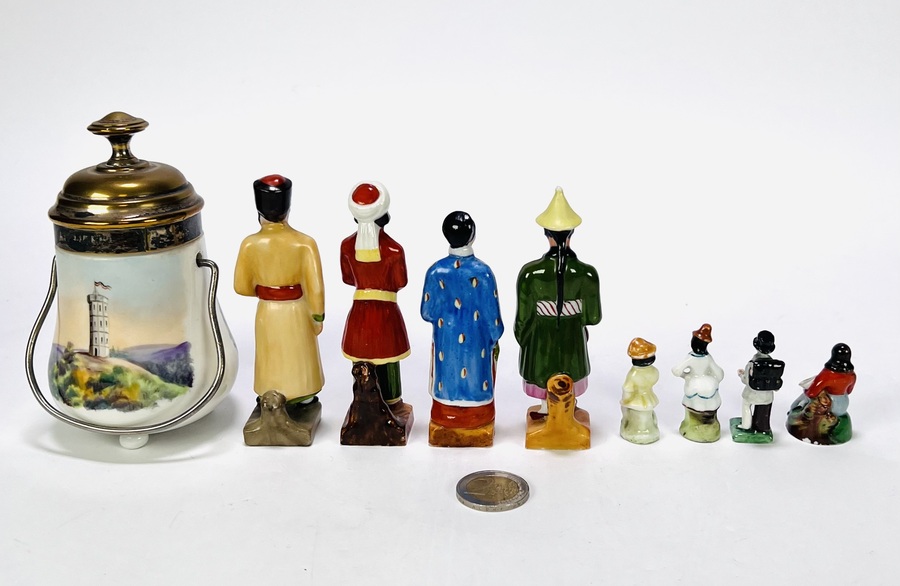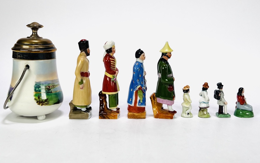 Porseleinen pot met metalen beugel en deksel en een acht porseleinen figuren. De pot is handbeschilderd met een landschap, de figuren met diverse klederdracht zijn polychroom beschilderd. De herkomst is Centraal-Europa, begin 20e eeuw. Klaar om te bieden? Registreer je nu en doe mee aan de veiling! |