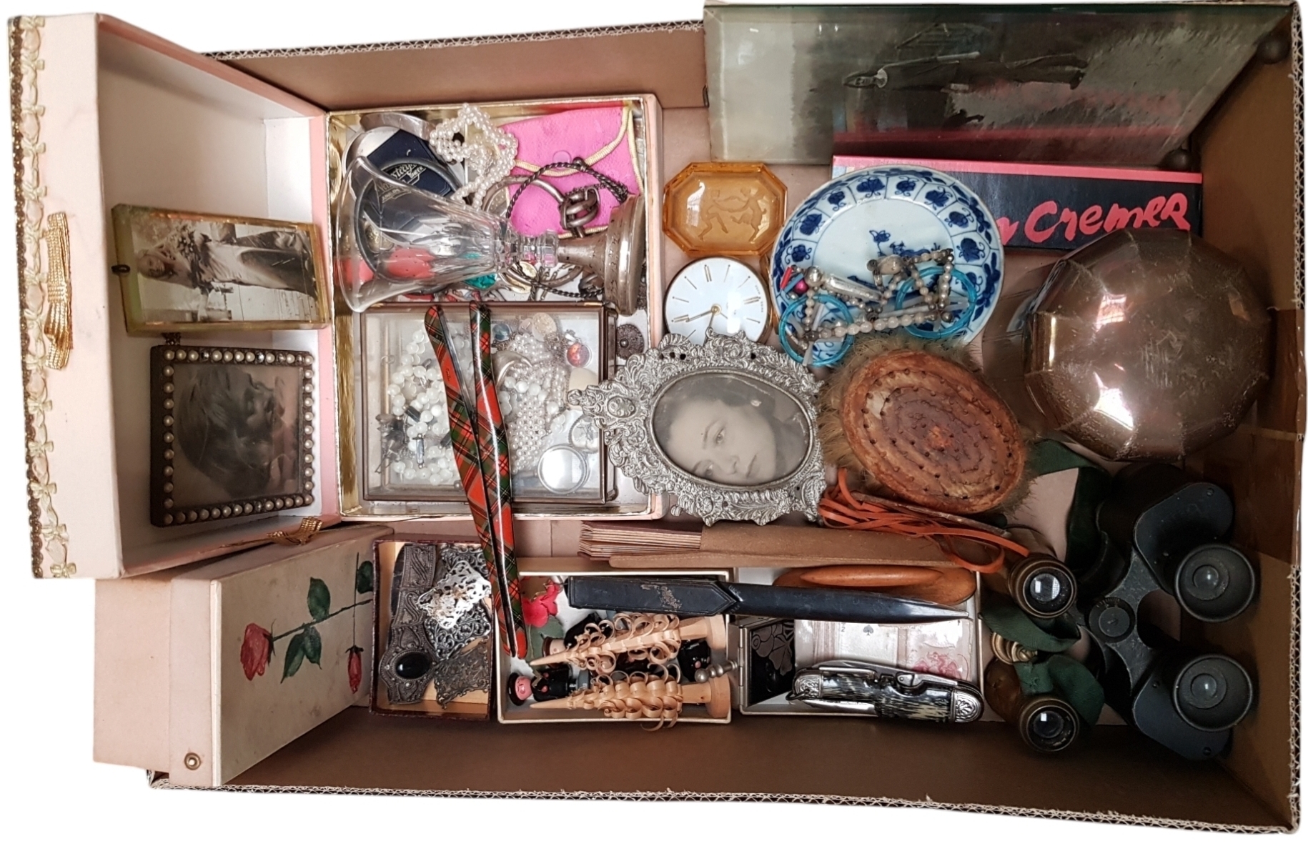 Verzameling curiosa in diverse stijlen en materialen, waaronder sieraden, een verrekijker, glaswerk en een ovaal portret in lijst, dateren uit de periode circa 1880 tot 1970. Het ensemble is van Europese herkomst en vervaardigd door middel van metaalgieten, glasslijpen en handsnijwerk. Registreer nu en bied eenvoudig online mee op dit kavel. |