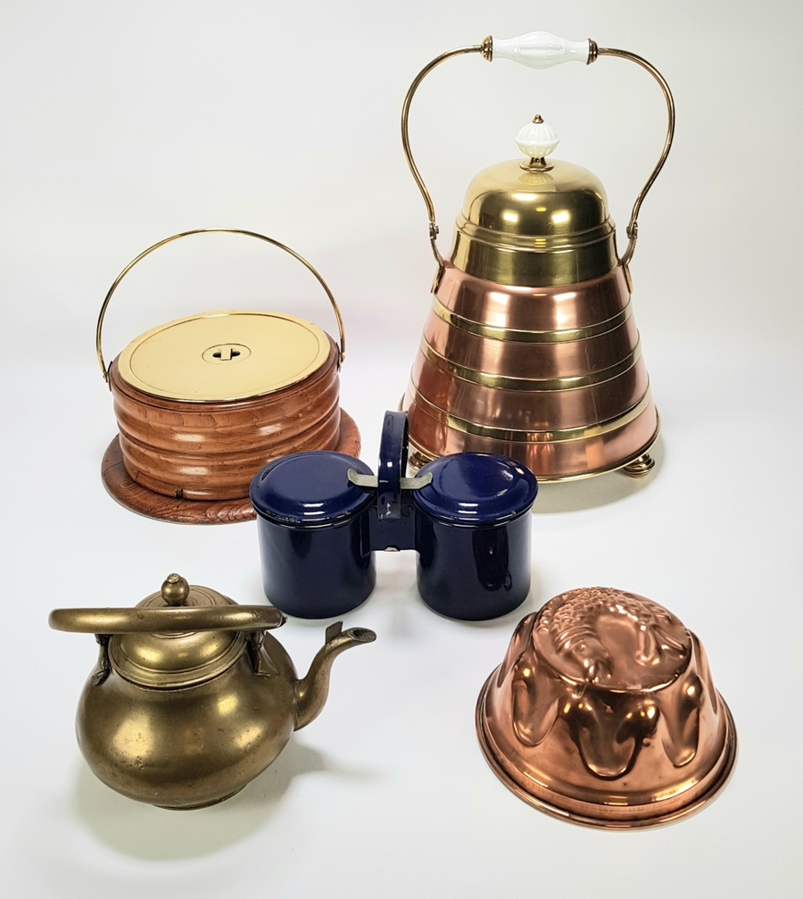 Diverse lot huishoudelijke voorwerpen uit begin 20e eeuw, circa 1900–1930. Het kavel omvat een groot koperen doofpot met porseleinen handgreep, een stoof, een messing theeketel, een kobaltblauw geëmailleerd setje en een visvormige koperen vorm. Klaar om te bieden? Registreer je nu en doe mee aan de veiling! |