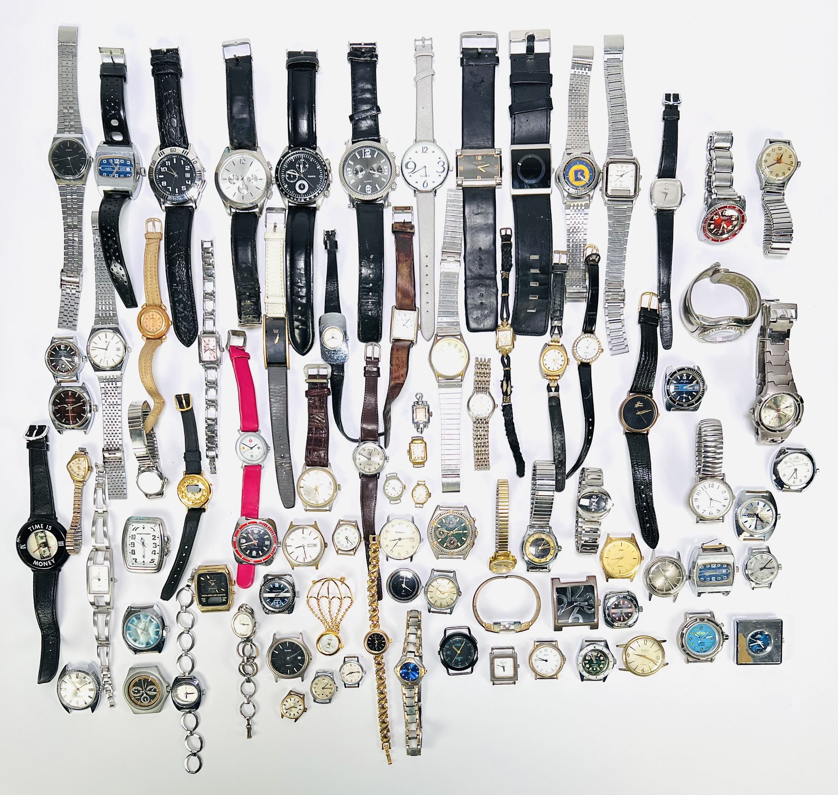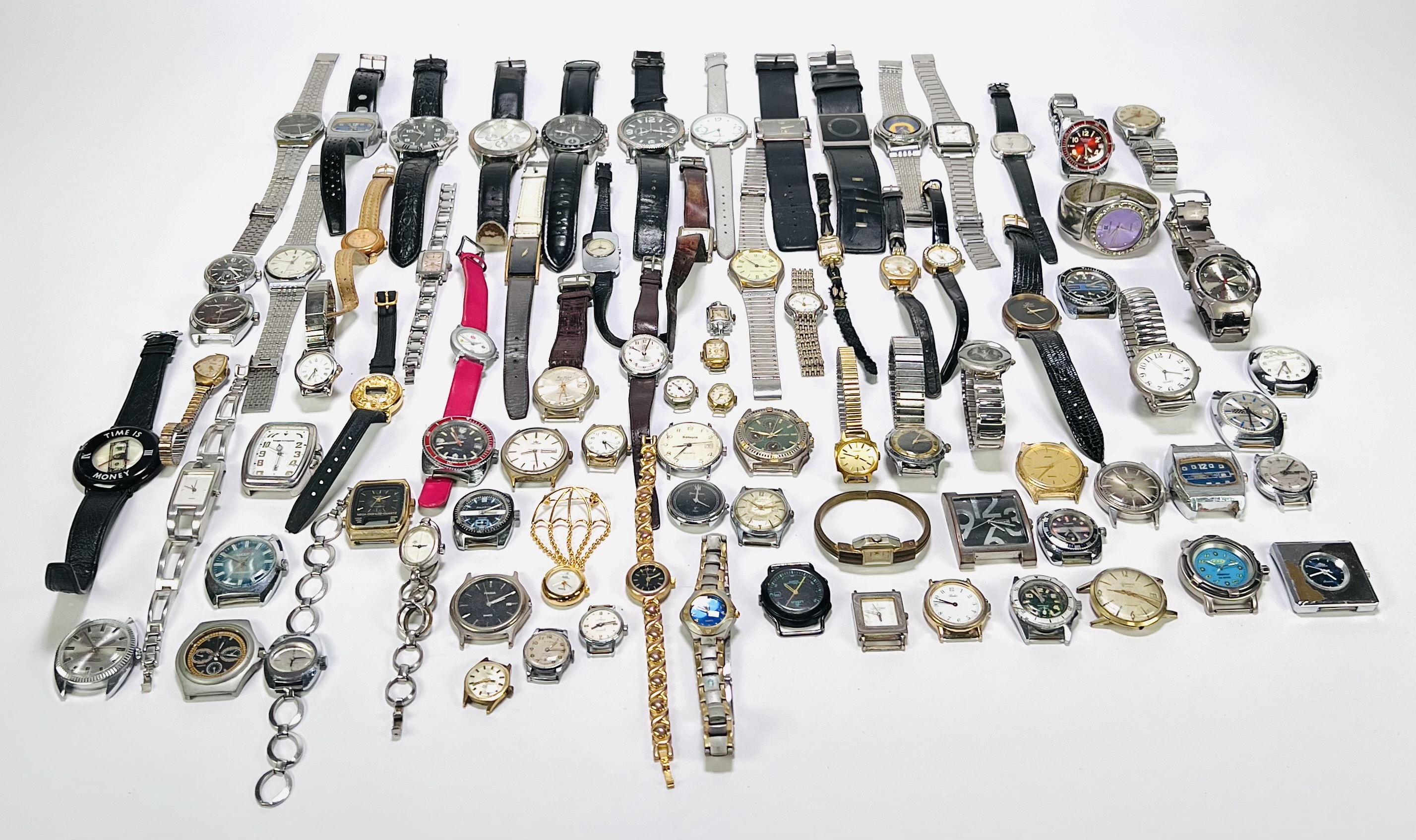 Lot met een omvangrijke verzameling van circa tachtig vintage polshorloges en banden, daterend uit de tweede helft 20e eeuw. De horloges zijn uitgevoerd in een mix van stijlen, van Mid-century modern tot de jaren 70 Space Age design. De materialen zijn metaal, leer en glas, met zowel mechanische als quartz uurwerken. Geïnteresseerd? Bezoek onze kijkdagen op 28, 29 of 30 november van 11:00 tot 17:00 uur! |