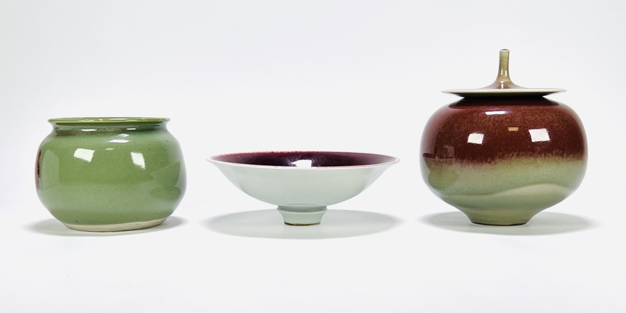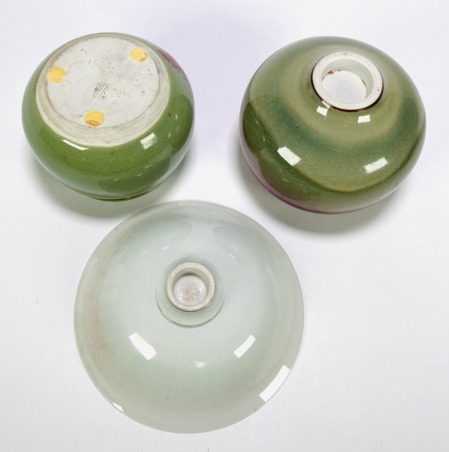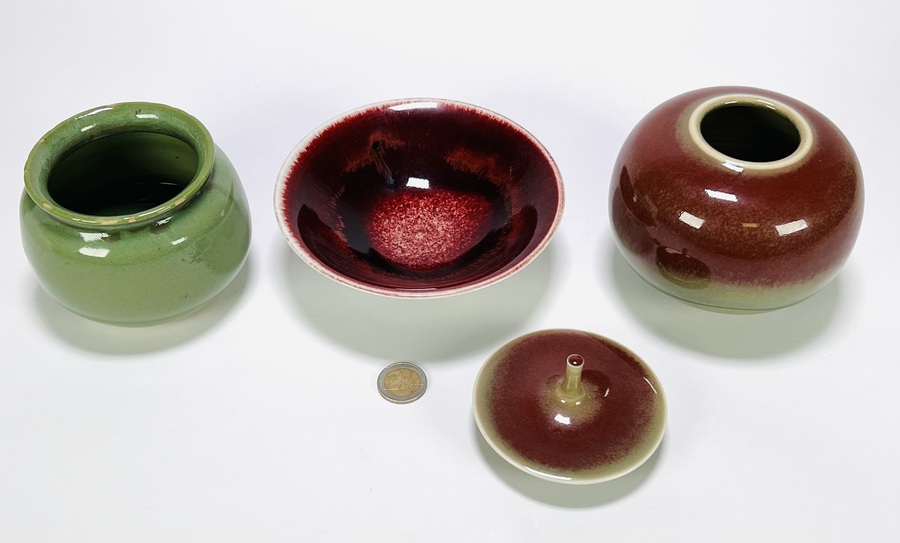 Een dekselpot, kom en schaal in modernistische stijl, Nederland, eind 20e eeuw. De kom is gesigneerd door Boerrigter, de dekselpot en schaal dragen onbekende signaturen. Gedraaid steengoed met hoogglanzende glazuren in rood en groen overgangen. Wil je direct deelnemen? Plaats vanaf 21 november alvast een schriftelijk bod via onze website! |