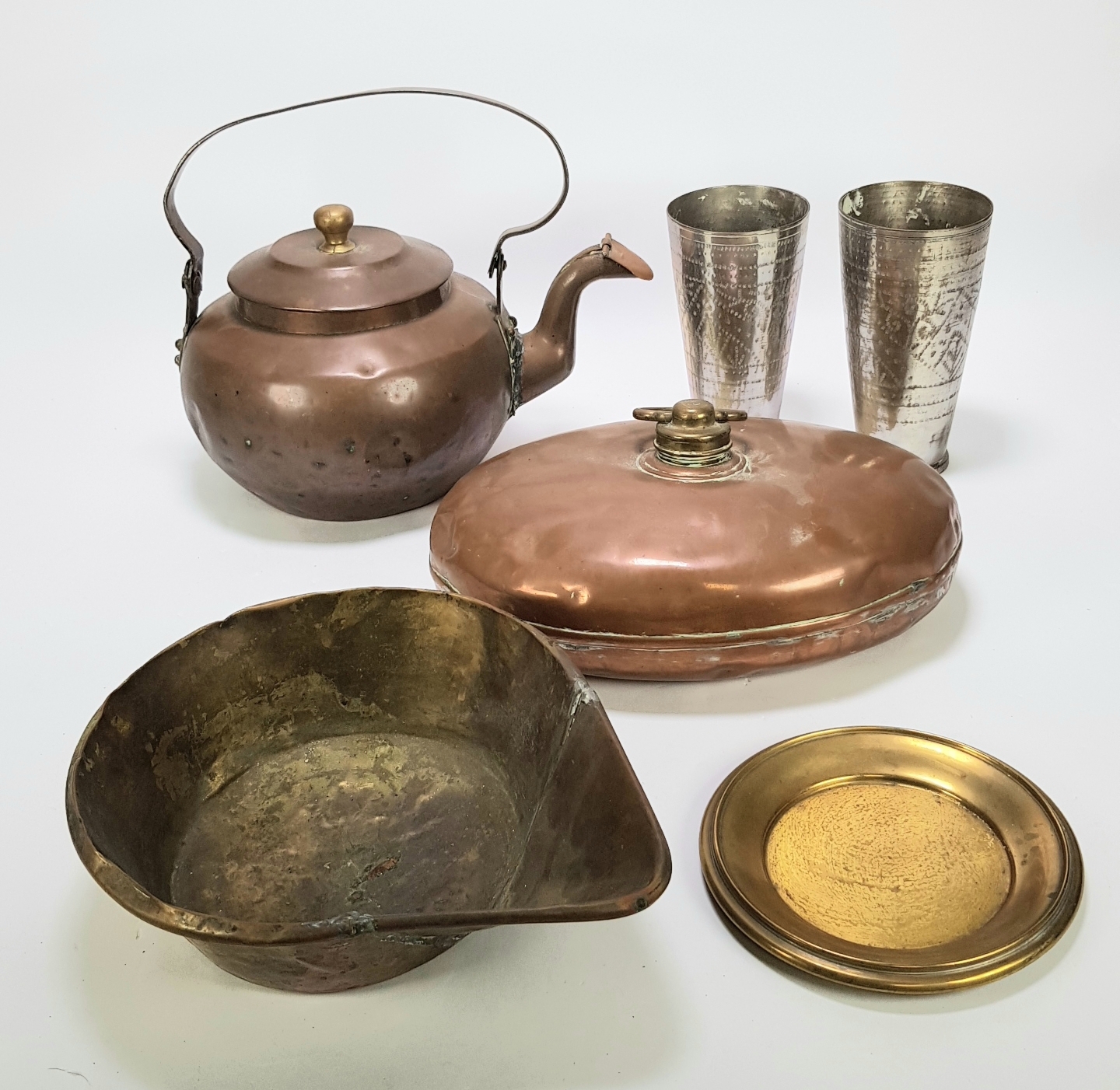 Vijf metalen gebruiksvoorwerpen waaronder een koperen ketel, een koperen warmwaterkruik en een messing wasbekken. Vervaardigd middels metaalbewerking, kloppen en solderen. De datering ligt in de periode van de late 19e tot vroege 20e eeuw. Geïnteresseerd? Bezoek onze kijkdagen op 28, 29 of 30 november van 11:00 tot 17:00 uur! |