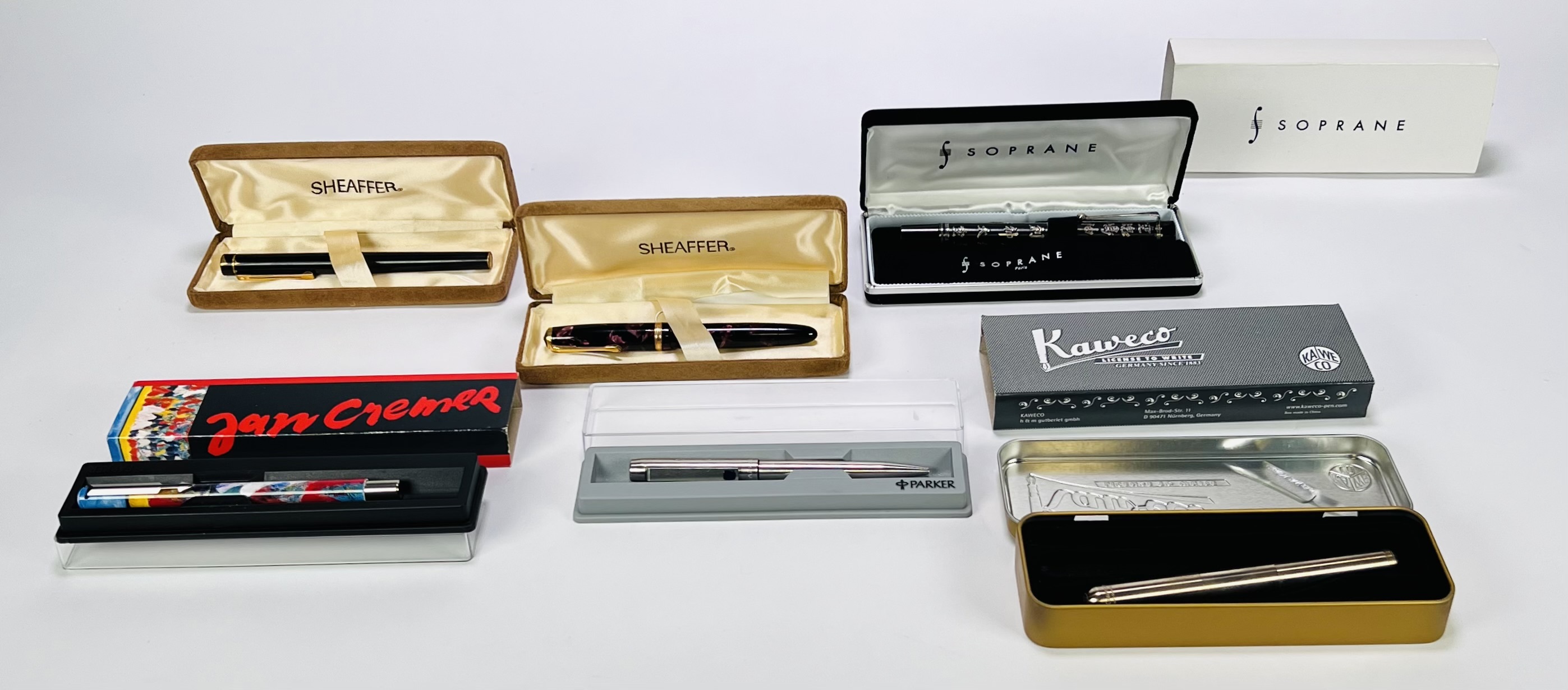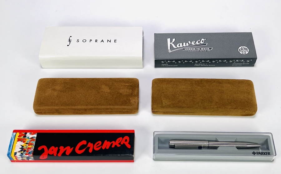 Vulpennen en balpennen van onder andere Sheaffer, Parker en Kaweco, daterend uit de periode 1950–2000. Het lot bevat vulpennen in klassieke stijl, een Aziatische vulpen met ingegraveerde karakters en een Jan Cremer Art pen. De pennen zijn vervaardigd uit hars en metaal met goud plated accenten. Wil je direct deelnemen? Plaats vanaf 21 november alvast een schriftelijk bod via onze website! |