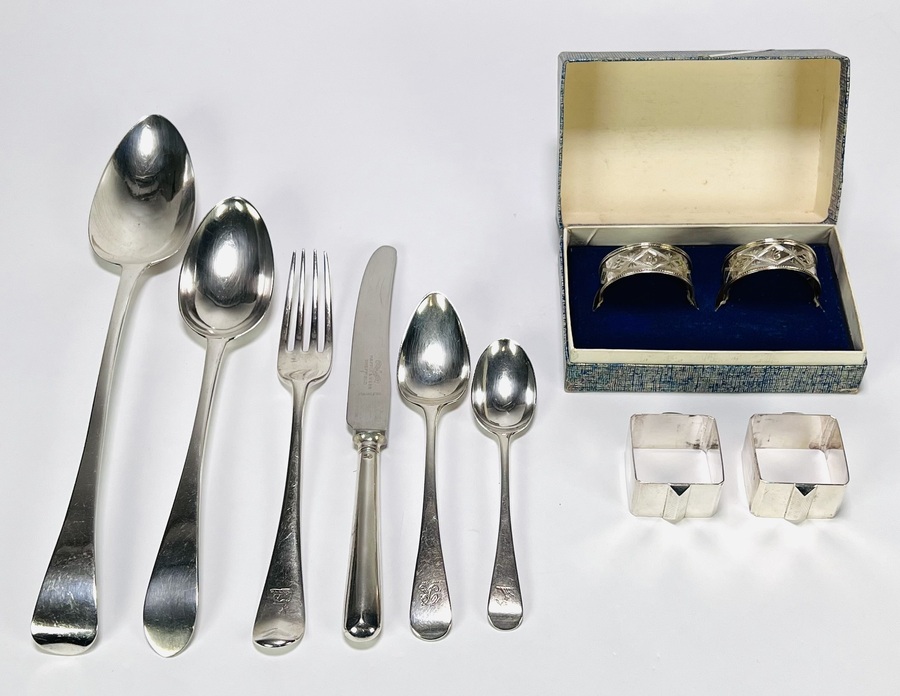 Een omvangrijk lot zilver bestek en servetringen, bestaande circa zevenenvijftig delen uit midden 20e eeuw, voornamelijk uit het Verenigd Koninkrijk. Het merendeel van het bestek is tweede gehalte zilver (835/1000) met diverse zilverkeurmerken, vervaardigd door stansen en walsen in een klassieke stijl met initialen. Het lot bevat onder andere dertien vorken, vierentwintig lepels, elf messen met stalen lemmet en vier servetringen. Wil je direct deelnemen? Plaats vanaf 21 november alvast een schriftelijk bod via onze website! |