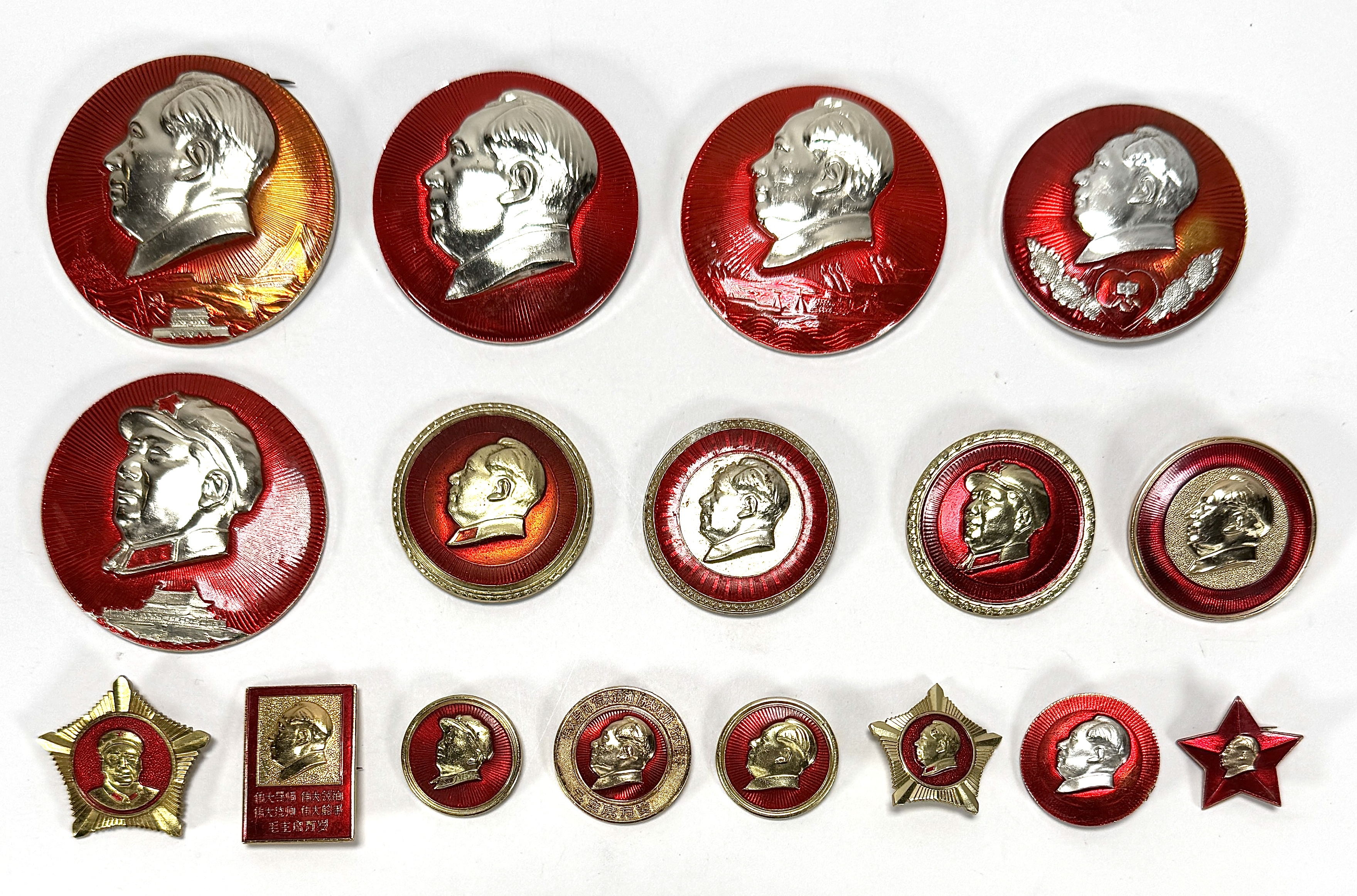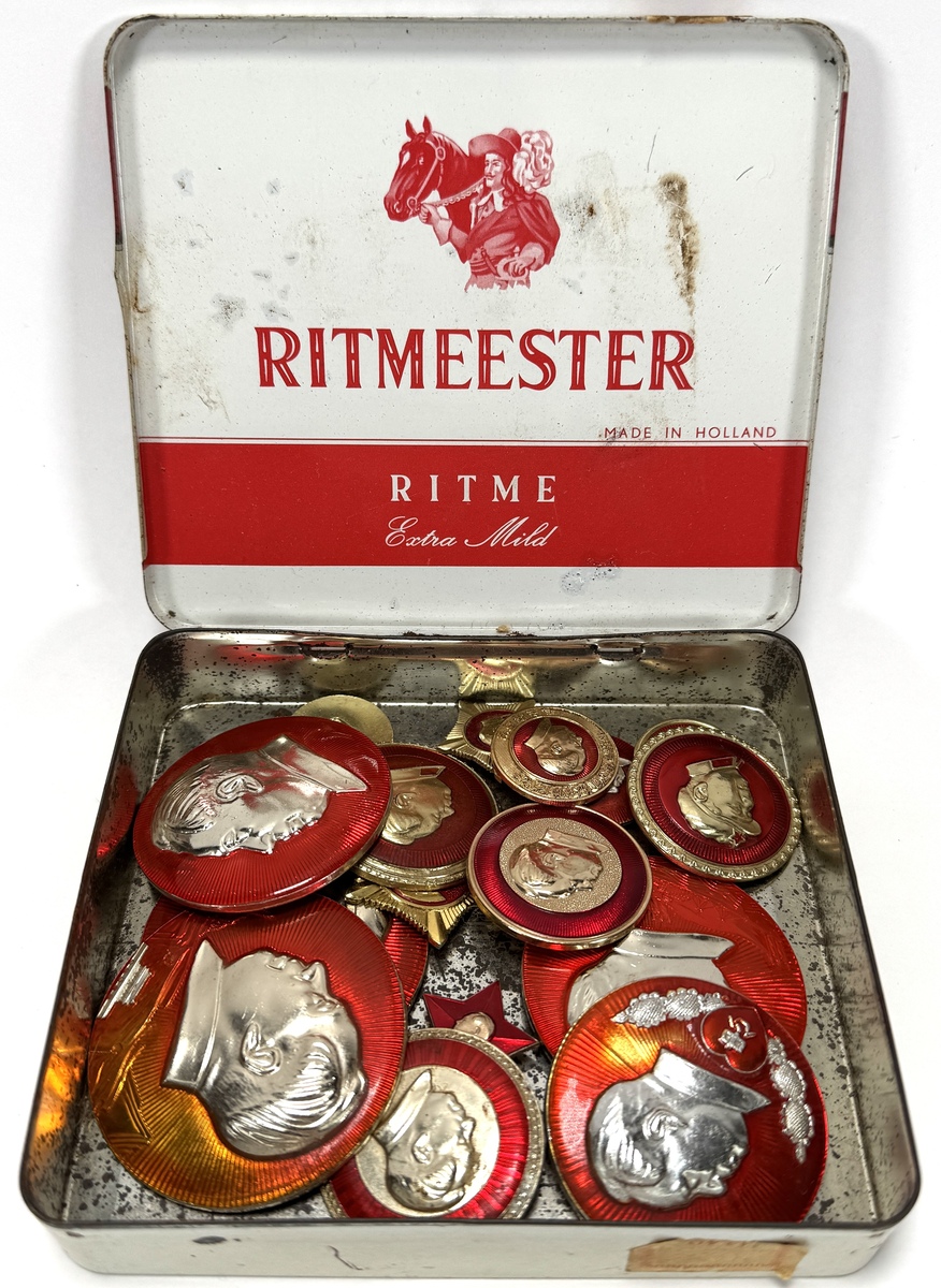 Collectie Mao speldjes, bewaard in een vintage Ritmeester sigarenkistje, dateert uit de Chinese Culturele Revolutie (1966-1976). De set bevat diverse aluminium en geëmailleerde spelden met het profiel van Mao Zedong, uitgevoerd in socialistisch realistische stijl. De badges variëren in vorm, waaronder rond en stervormig, en dragen aan de achterzijde Chinese inscripties. Klaar om te bieden? Registreer je nu en doe mee aan de veiling! |