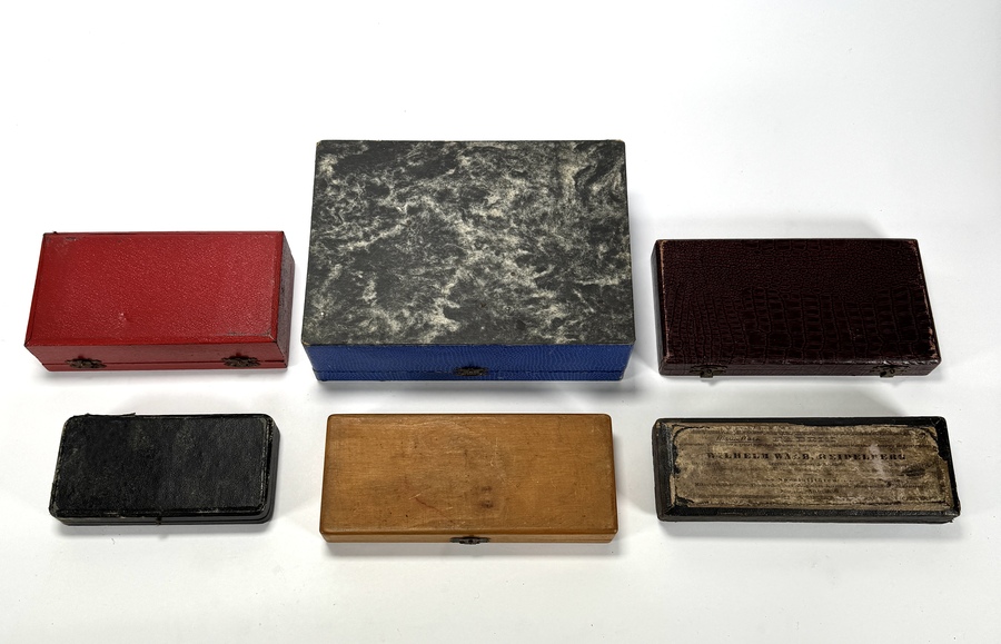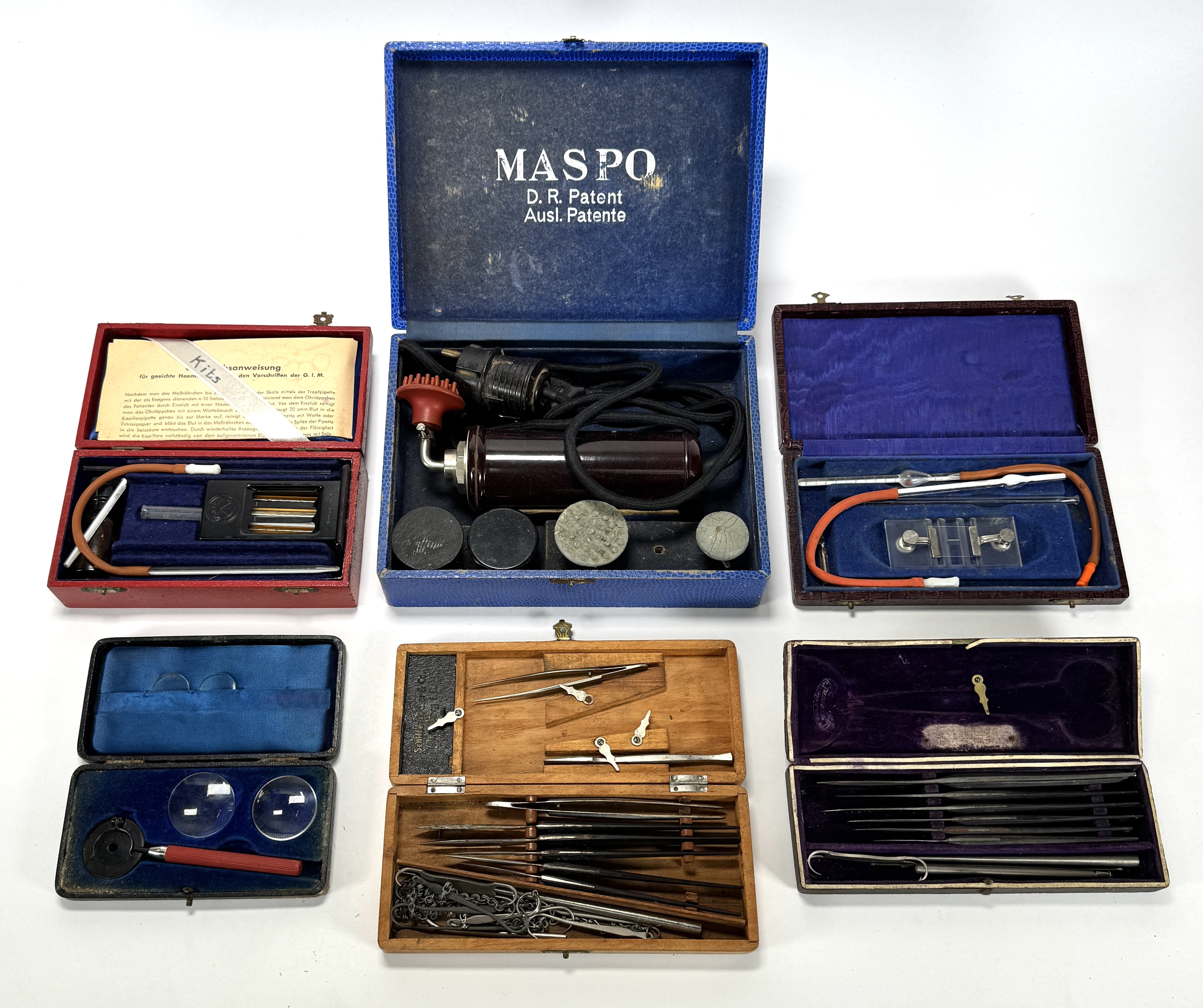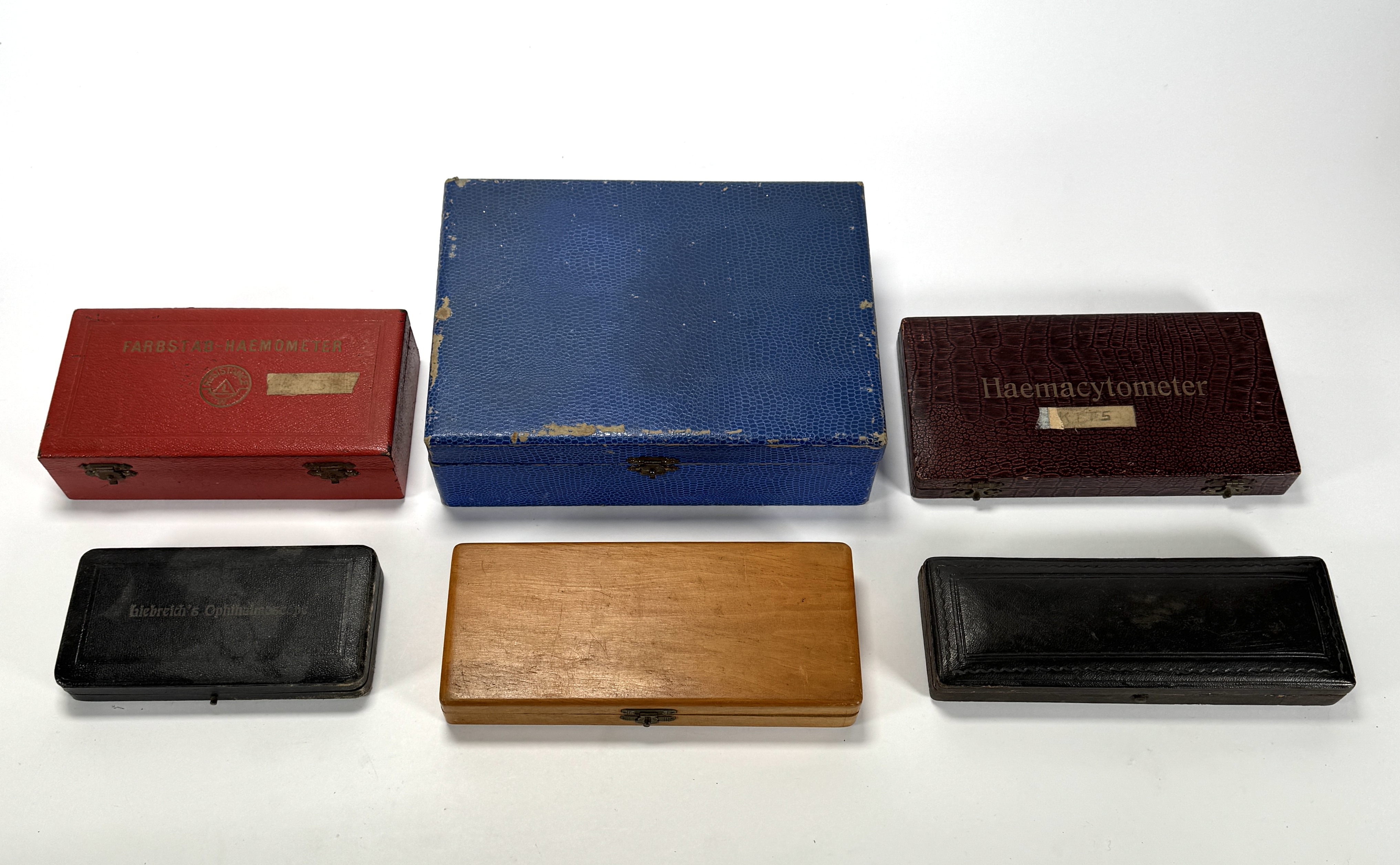 Zes utilitaire medische instrumentenkisten van hout met leer-en papierbekleding en metalen instrumenten. Daterend uit de late 19e/vroege 20e eeuw, diverse stukken gemerkt met namen als "MASPO" en "Eichbrecht's Ophthalmoskop". De kisten bevatten gespecialiseerde optische, bloed analytische en algemene diagnostische apparatuur. Registreer nu en bied eenvoudig online mee op deze instrumenten! |