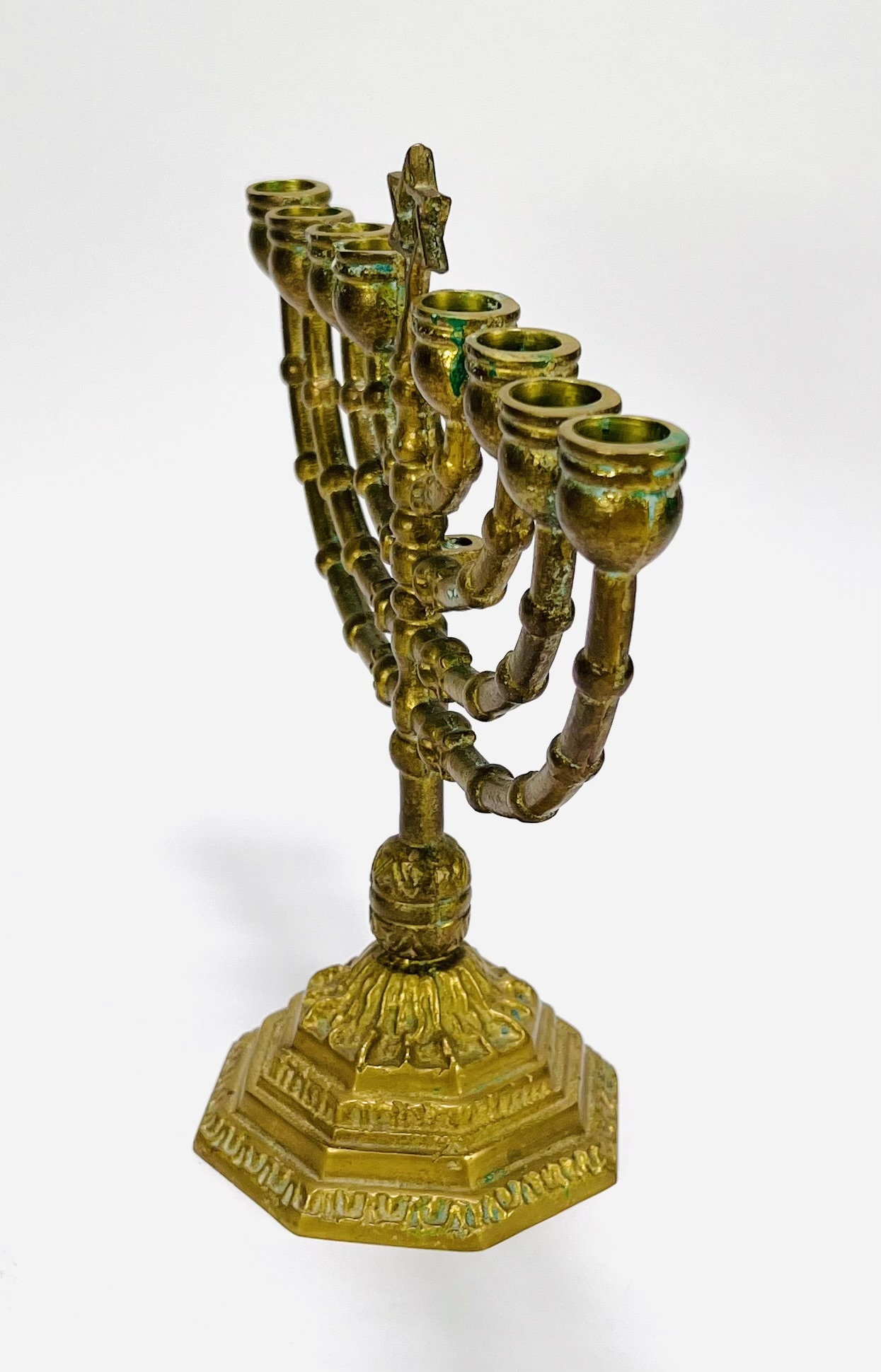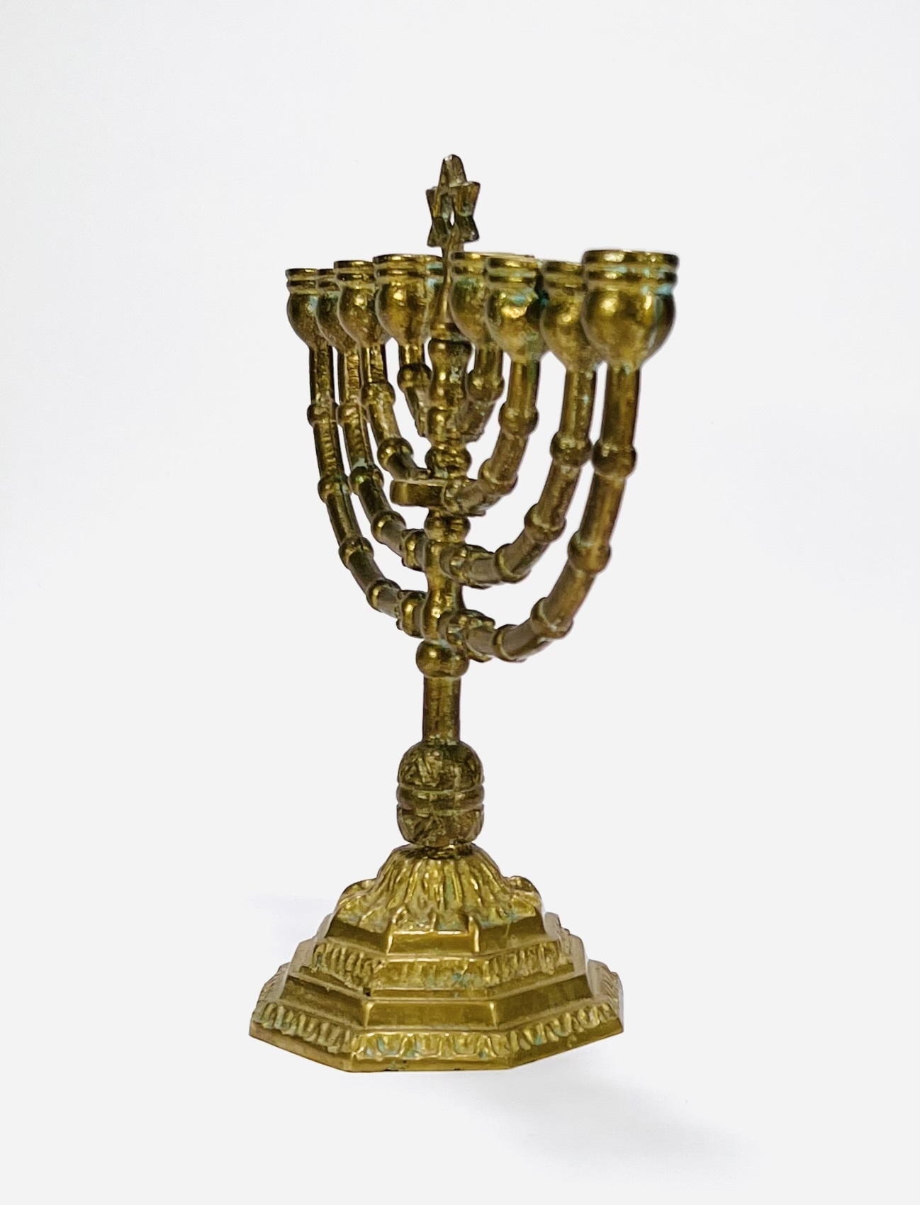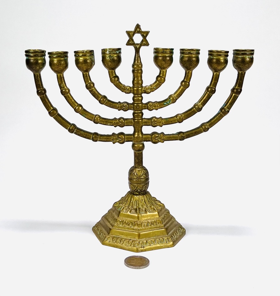 Achtarmige kandelaar, Menora stijl, vervaardigd uit gegoten messing en gedateerd 2e helft 20e eeuw (circa 1970). De kandelaar heeft een symmetrische vorm met gebogen armen en een achthoekige basis met reliëfdecoratie, de centrale shamash-houder eindigt in een Davidster (Magen David). Ontdek deze kandelaar en voeg het toe aan jouw collectie! Registreer nu voor de veiling. |