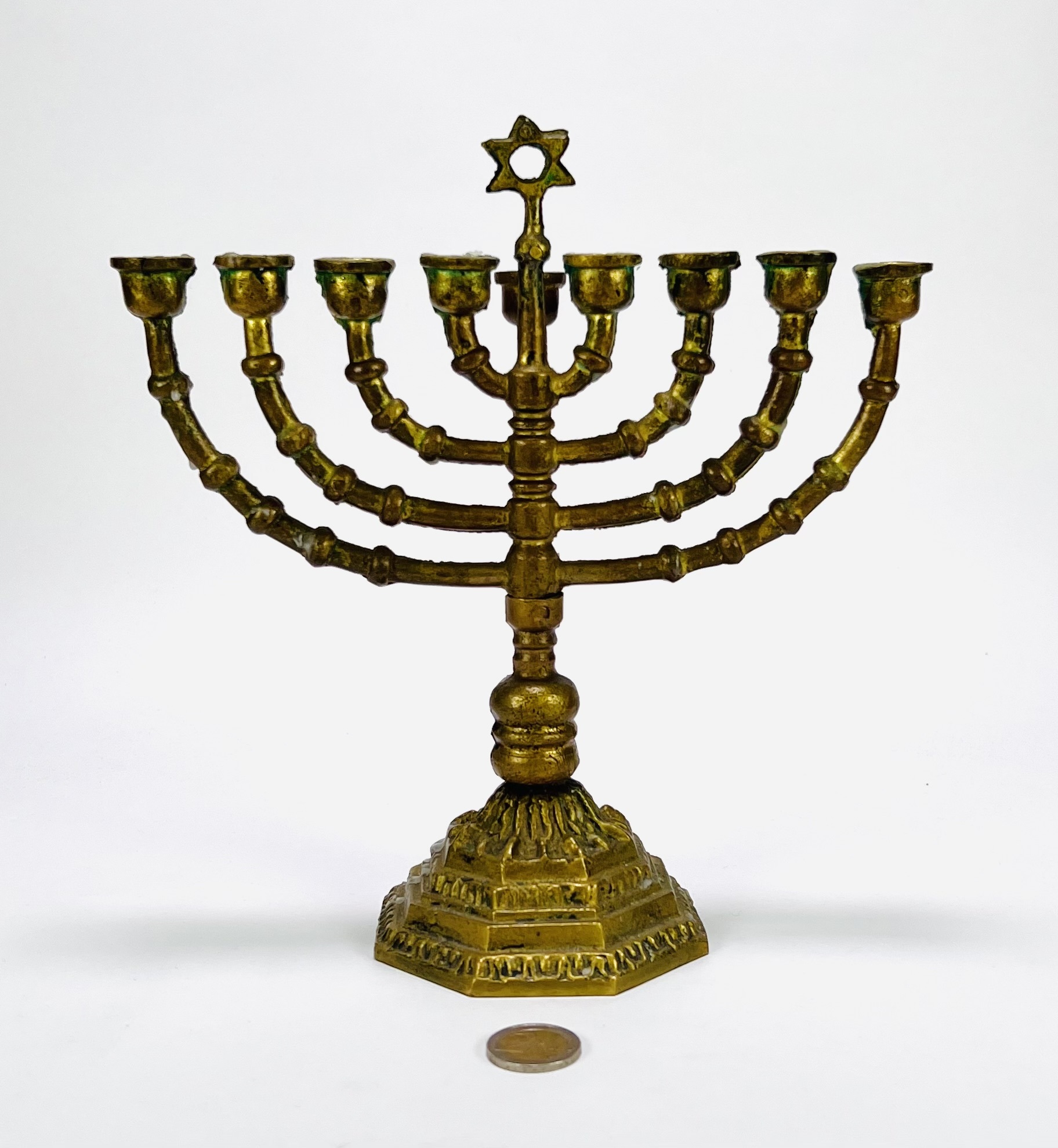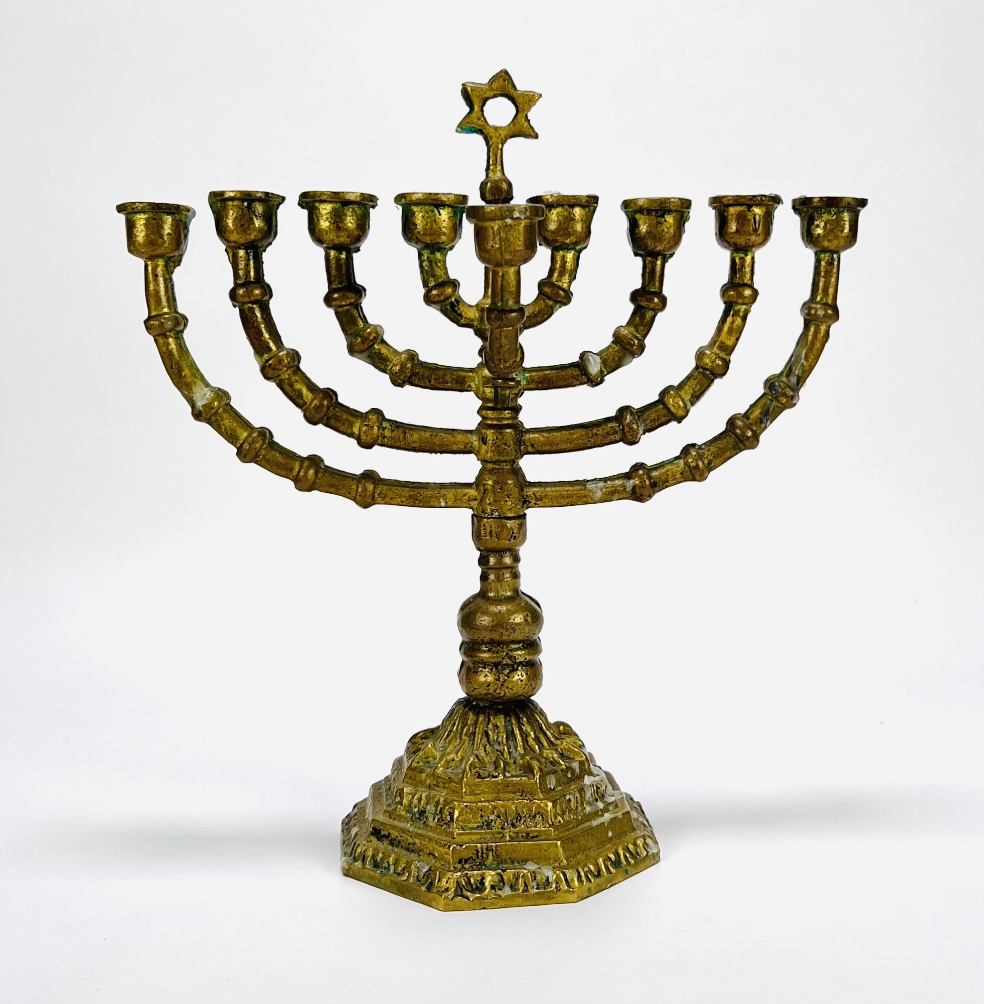 Negenarmige menora (Chanukiah) vervaardigd uit gegoten messing en gedateerd in de vroege 20e eeuw. De kandelaar heeft een symmetrische vorm met gebogen armen en een achthoekige basis met reliëfdecoratie. De centrale shamash-houder eindigt in een Davidster (Magen David). Voeg deze Menora toe aan je verzameling en doe een bod! |