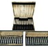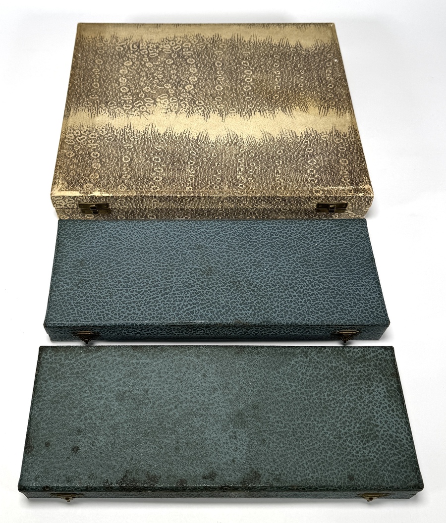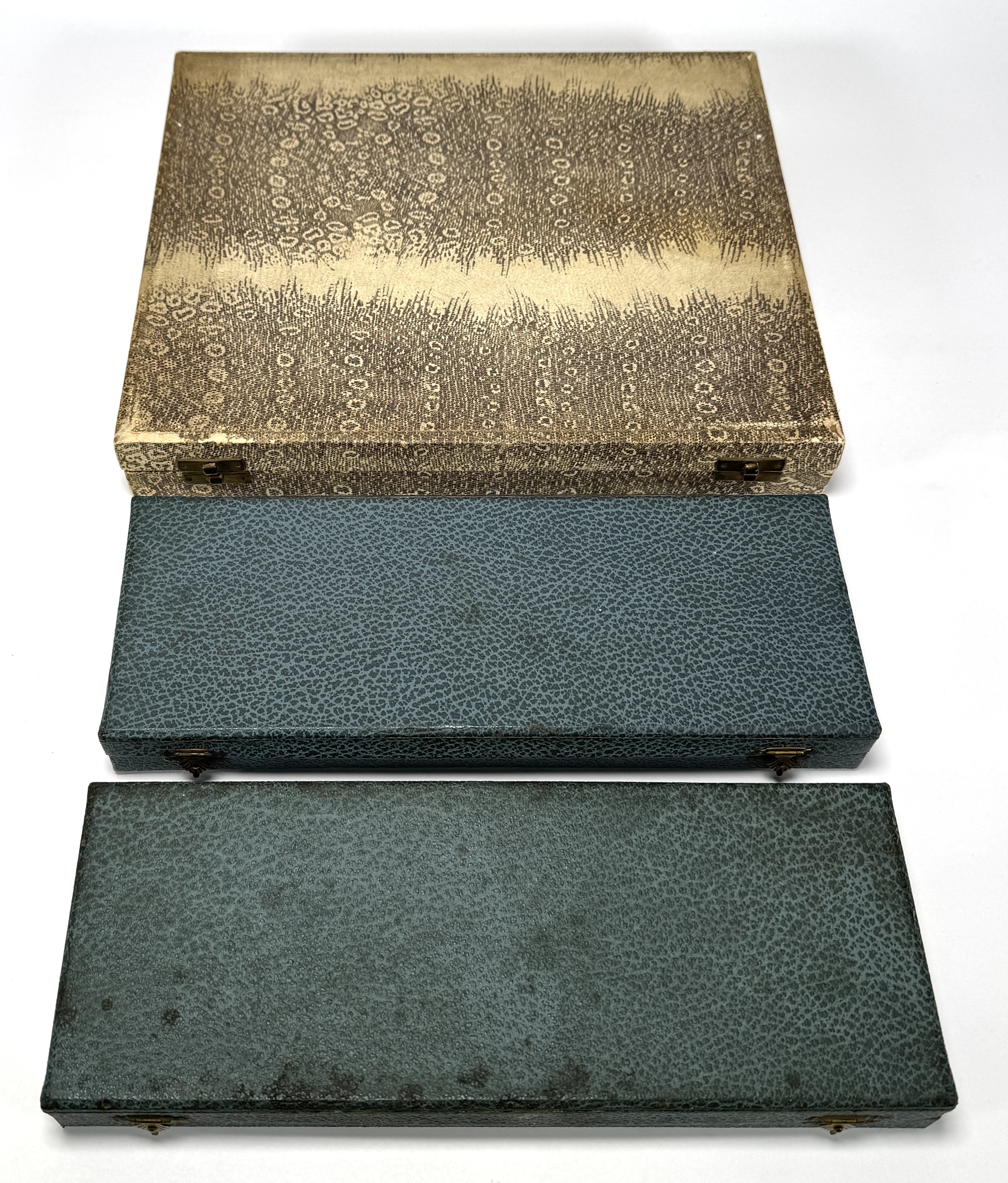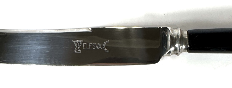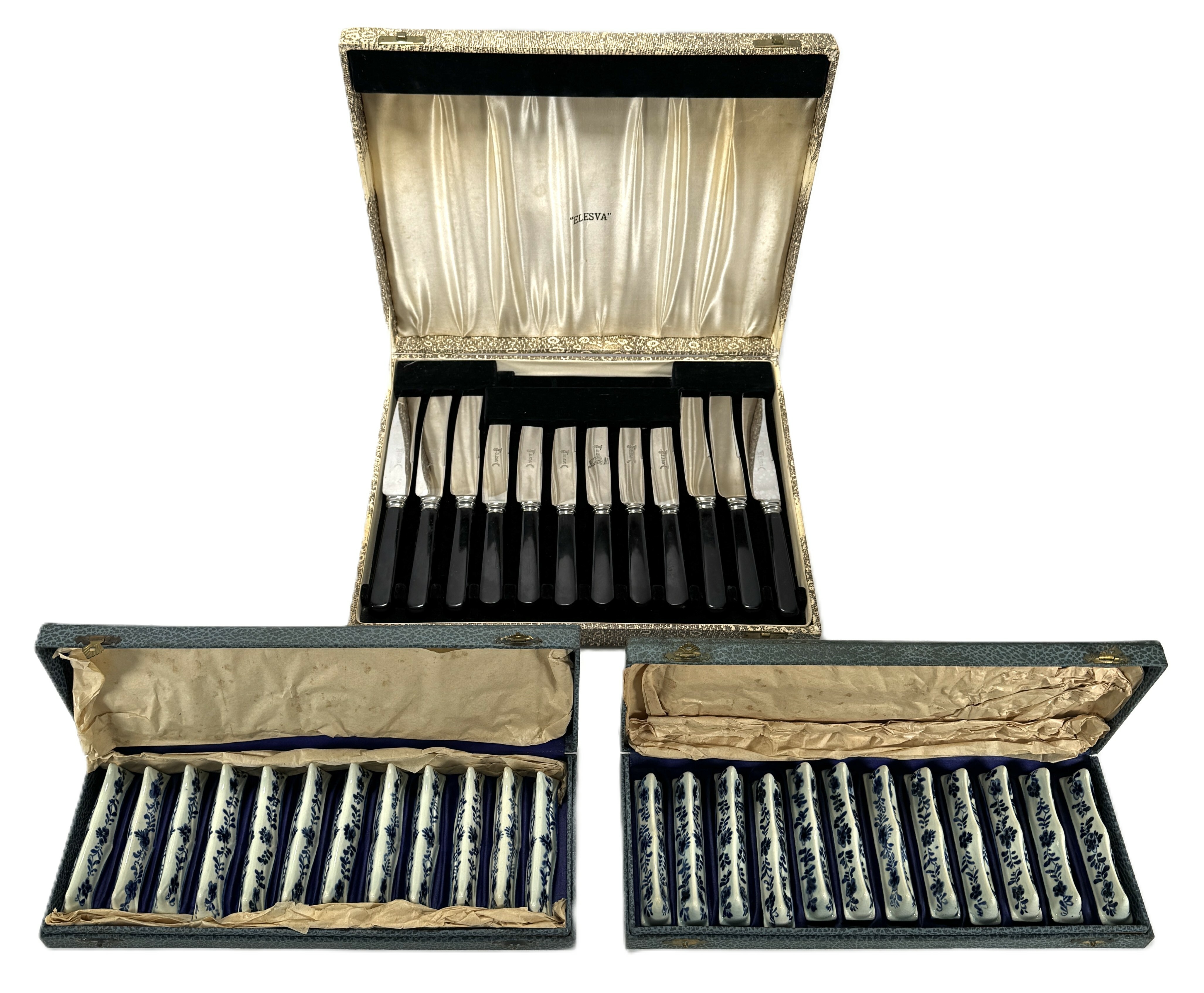 Twaalf Elesva tafelmessen van roestvrij staal met zwarte Art Deco kunststof handvatten, ca. 1930–1940, en vierentwintig keramische messenleggers in Delfts blauw, ca. 1940–1950. De messenleggers zijn handbeschilderd met een bloemmotief en voorzien schildersinitialen op de onderzijde. De gehele set bevindt zich in de originele bewaardozen met satijnen voering. |