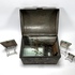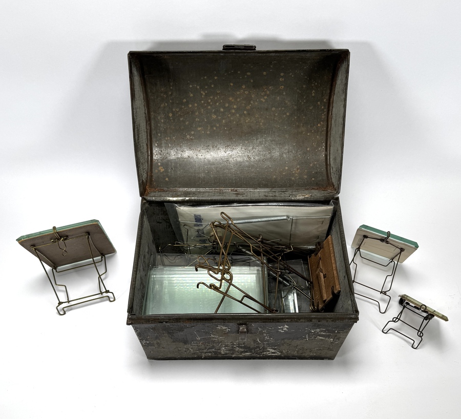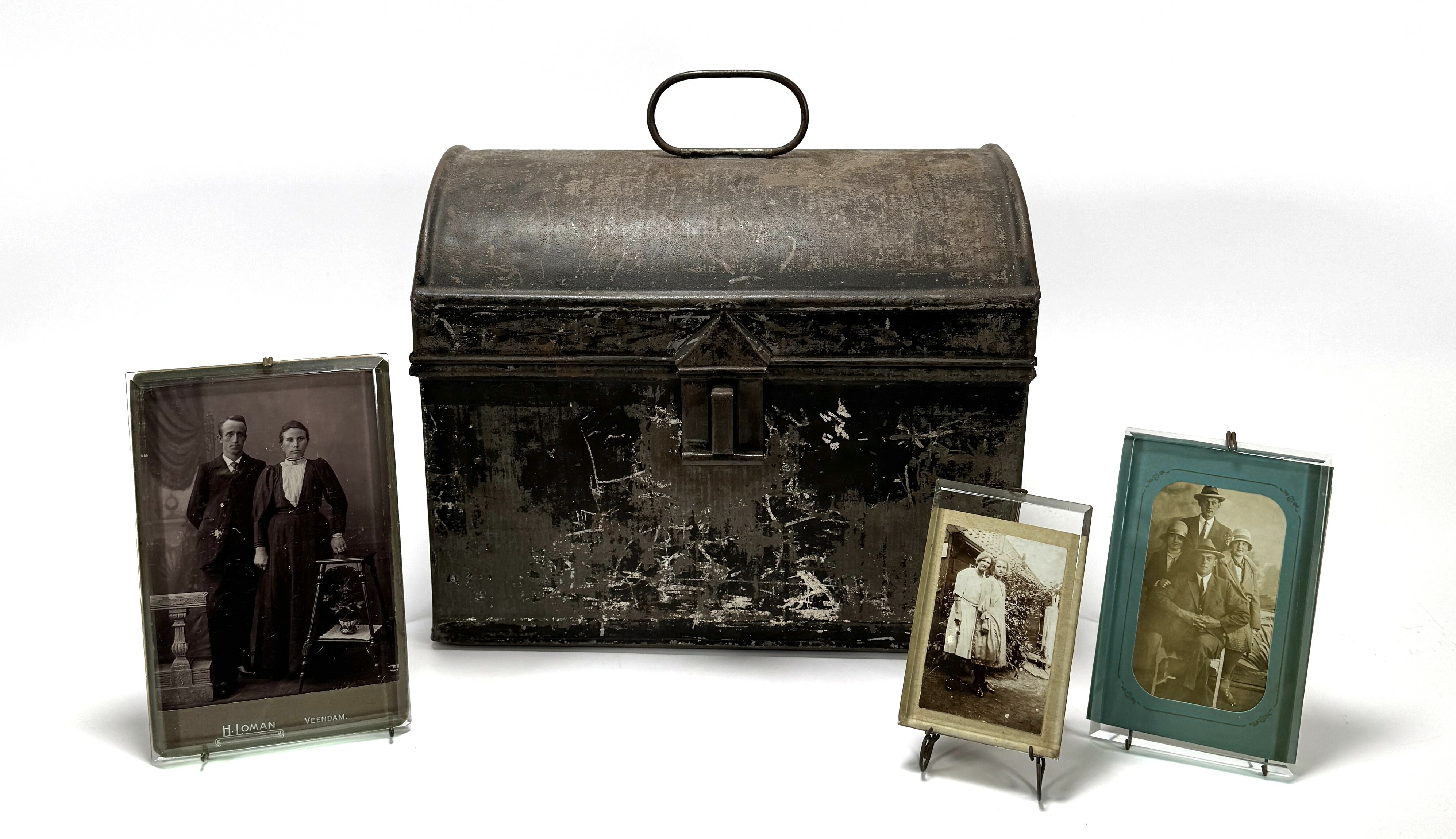 Blikken kist met een collectie draadstalen fotolijstjes, een foto gesigneerd H. Loman, Veendam. De kist is uitgevoerd in een utilitaire stijl. Datering circa 1890 – 1920. Deze kavel zelf beoordelen? Je bent welkom op onze kijkdagen op 28, 29 en 30 november! |