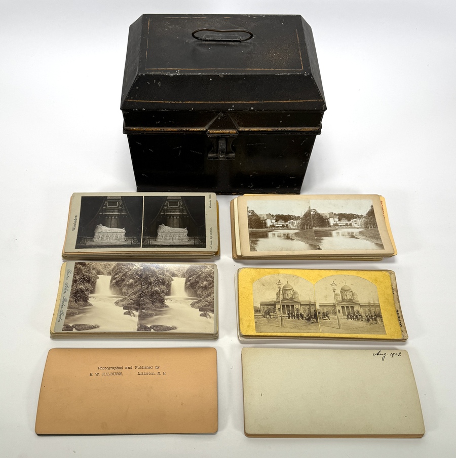 Metalen opbergkist met een grote collectie stereofoto’s, daterend circa 1880–1920. De stereokaarten zijn fotografische afdrukken gemonteerd op karton en omvatten onder meer stadsgezichten en landschappen. De Amerikaanse uitgevers van de kaarten zijn onder andere B. W. Kilburn en Underwood & Underwood. Geïnteresseerd? Bezoek onze kijkdagen op 28, 29 of 30 november van 11:00 tot 17:00 uur! |