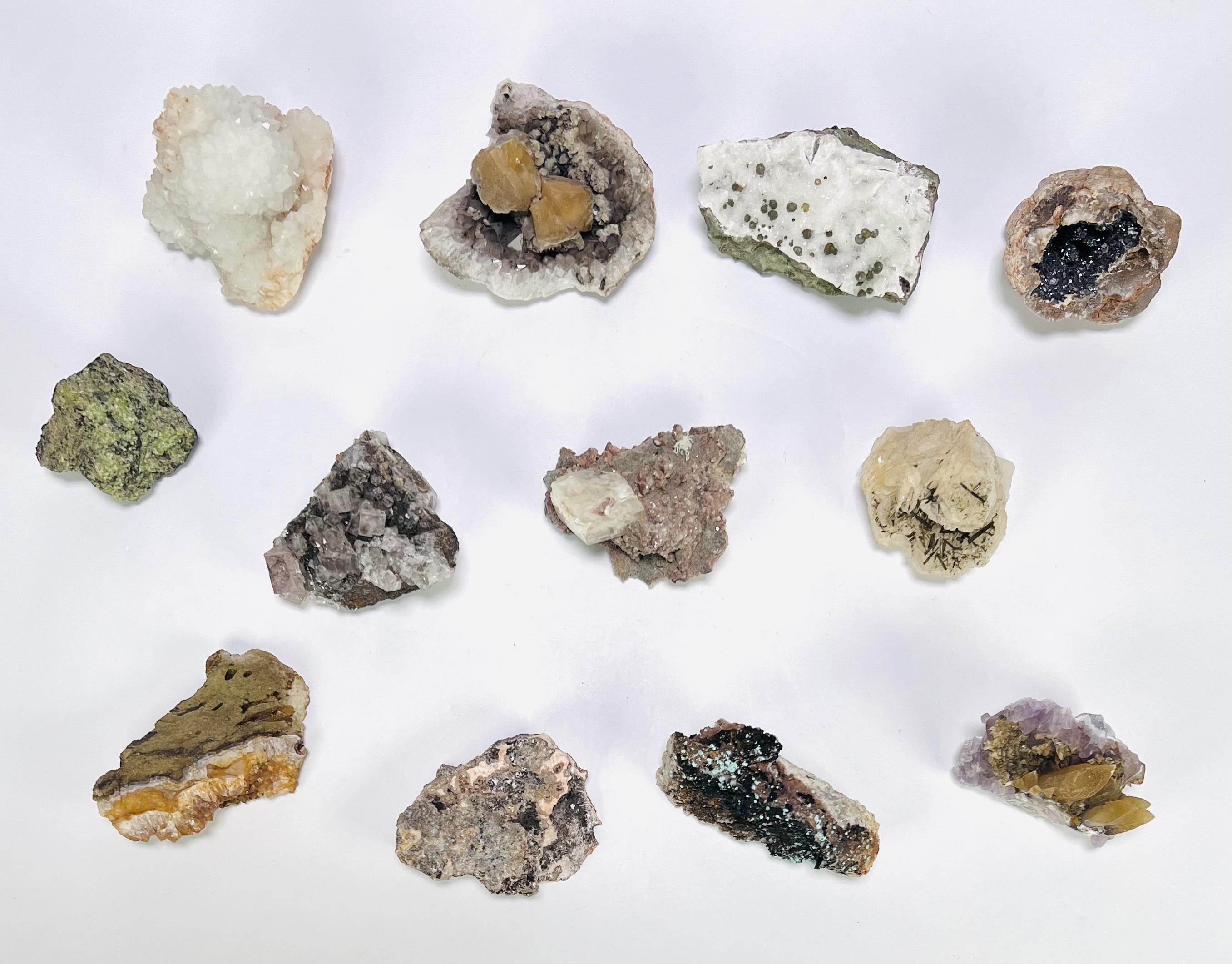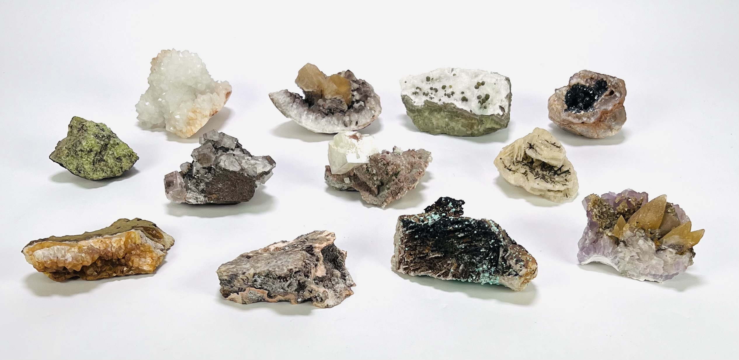 Een gevarieerd lot van twaalf ruwe mineralen en gesteentemonster. Het lot omvat kwartsclusters, paarse amethist en citrien in geodeformaties, grofkorrelig groen metamorf gesteente en agaatstukken. De monsters zijn onbewerkt en vertonen natuurlijke kristal - en kleurvariaties. Wil je direct deelnemen? Plaats vanaf 21 november alvast een schriftelijk bod via onze website! |