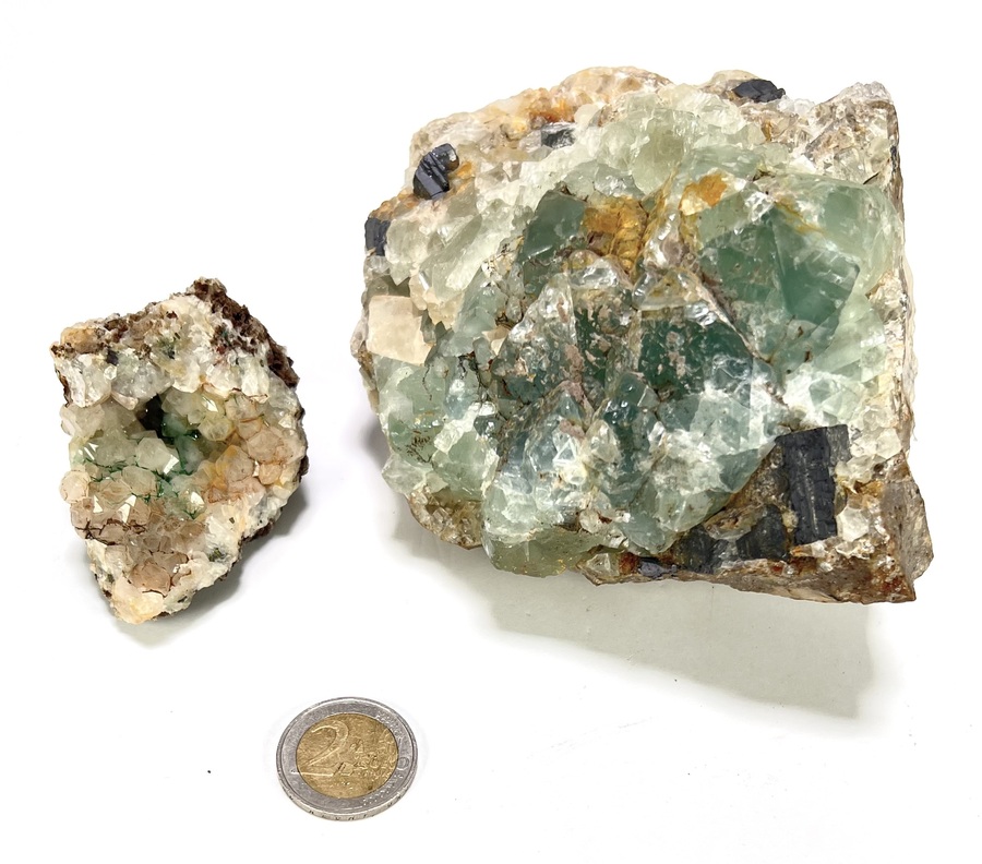 Een collectie van diverse ruwe mineralen en deels gepolijste geoden, onder andere een groot stuk groene fluoriet met matrix, diverse kwartsgeoden met kristalvorming aan de binnenzijde en een specimen met calcietkristallen. Wil je deze mineralen n het echt bekijken? Kom naar de kijkdagen op 28, 29 en 30 november! |