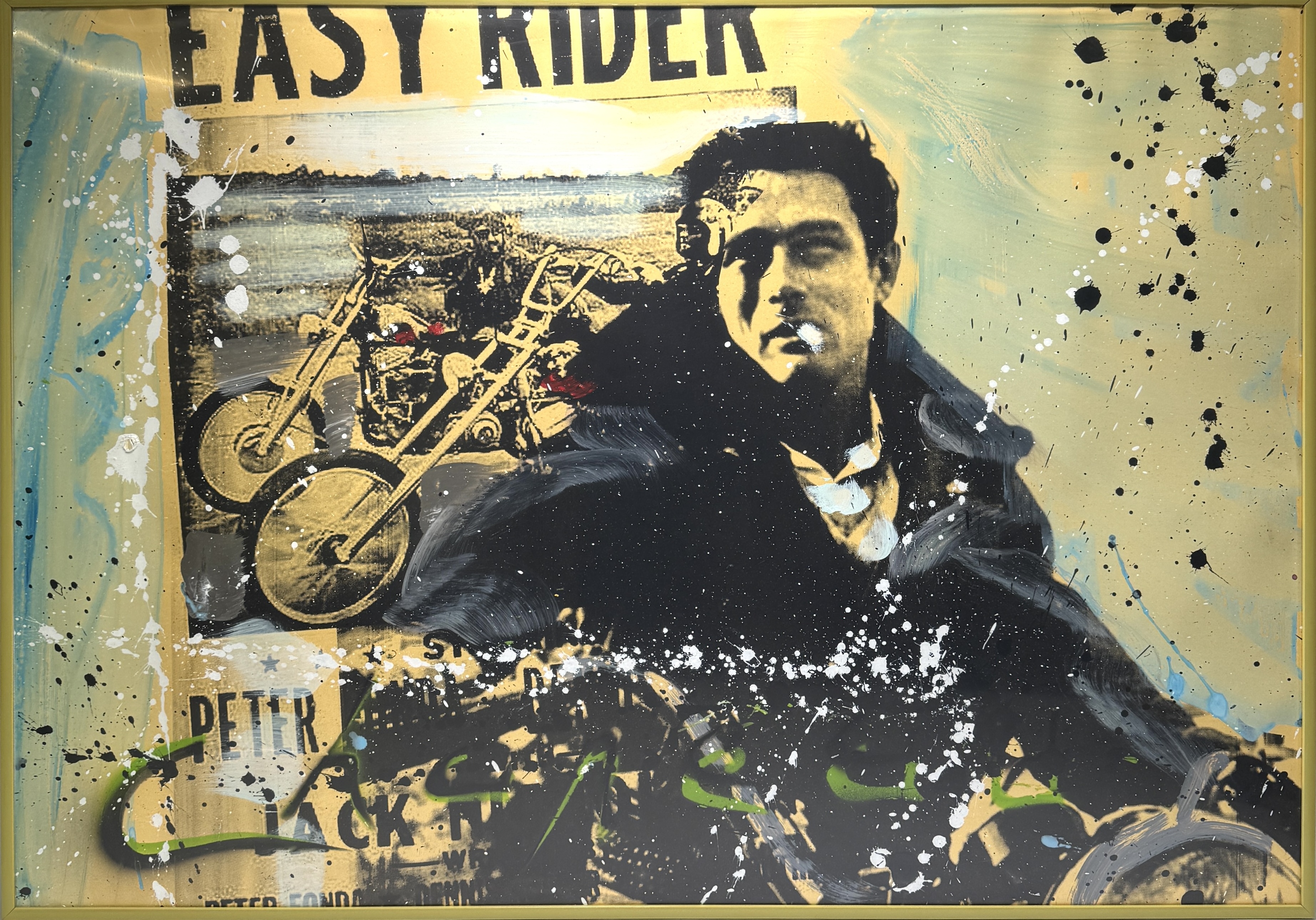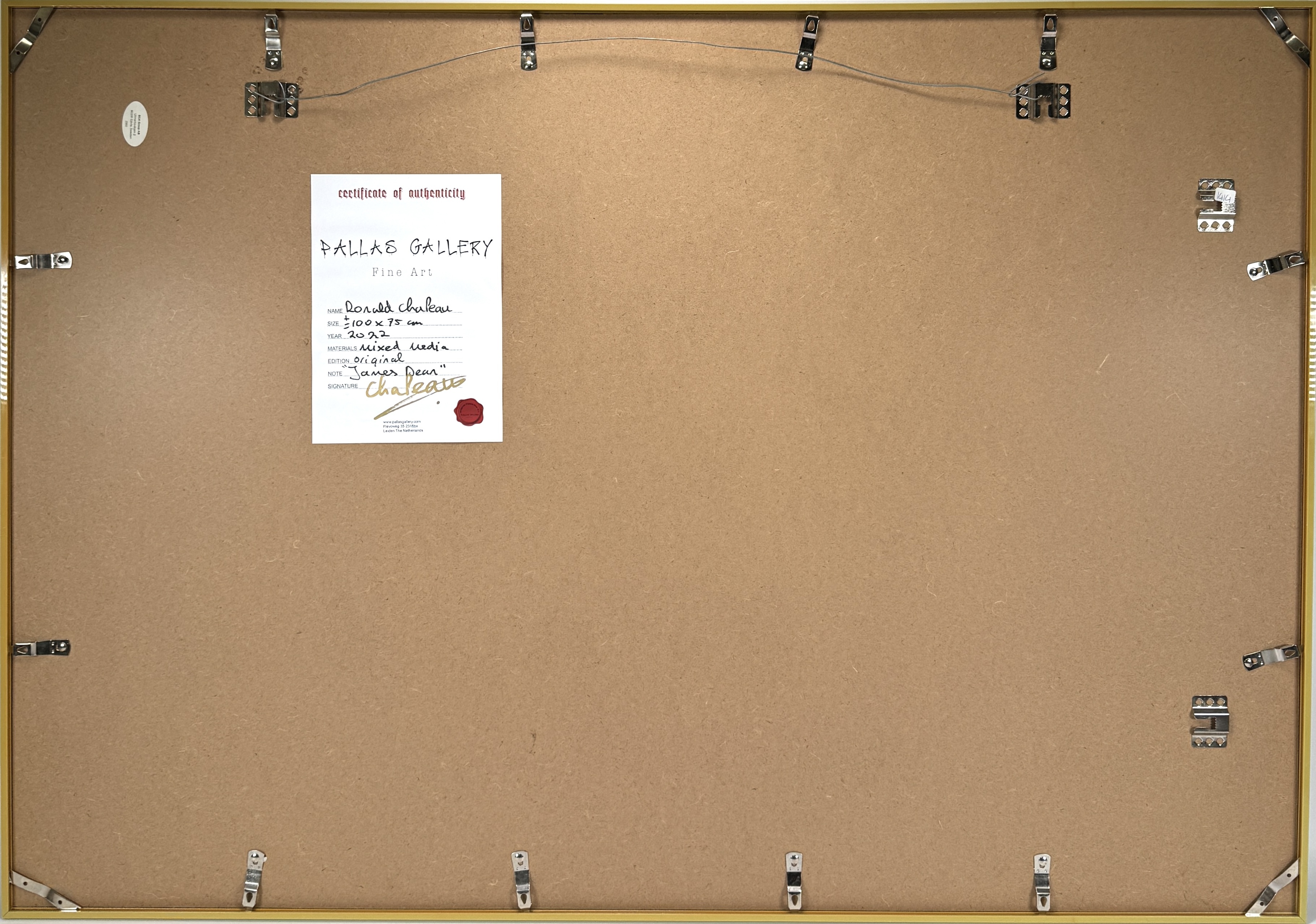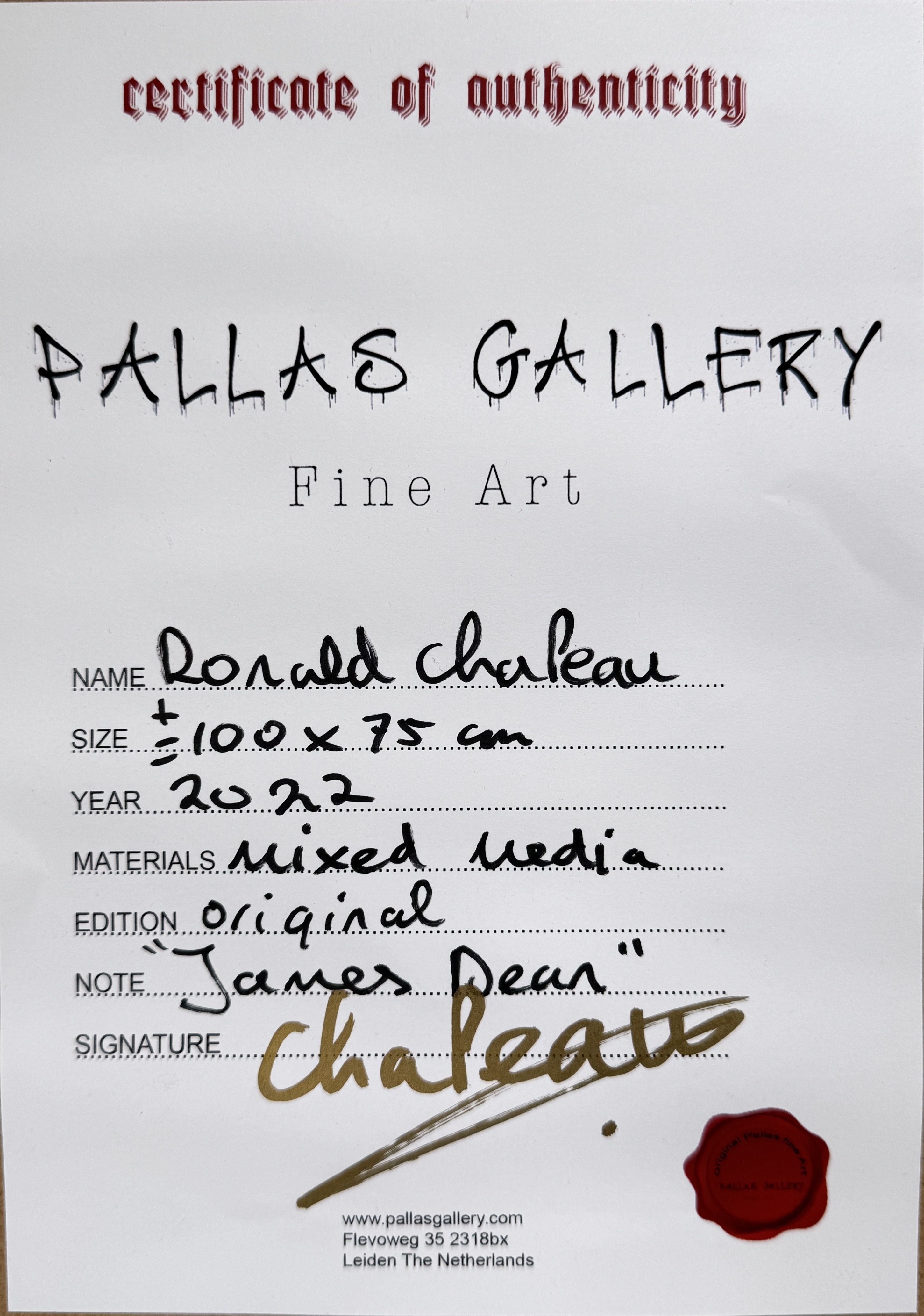 Mixed media getiteld "James Dean", uitgevoerd in de hedendaagse popart stijl door de Nederlandse kunstenaar Ronald Chapeau (1969). Het werk uit 2022 combineert zeefdruk en acrylverf op doek en toont James Dean. Verso certificaat Palles Gallery, inclusief signatuur. Kom langs tijdens de kijkdagen (28 t/m 30 november) en ontdek dit object zelf! |