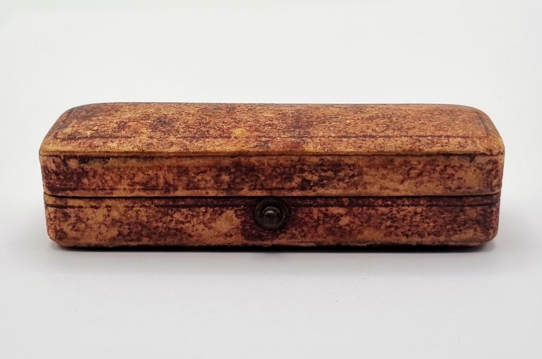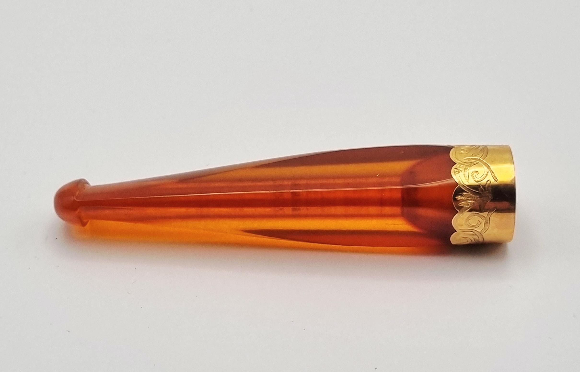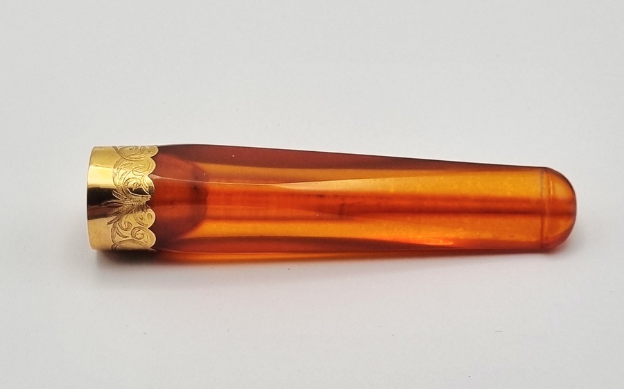 Sigarettenhouder uit het begin 20e eeuw, circa 1900–1920, uitgevoerd in geslepen barnsteen met een 14 karaats gouden manchet. De Art Nouveau gouden band is rijk gegraveerd, voorzien van een eikenblad keurmerk, in de originele lederen etu Kom langs tijdens de kijkdagen (28 t/m 30 november) en ontdek de sigarettenhouder zelf! |