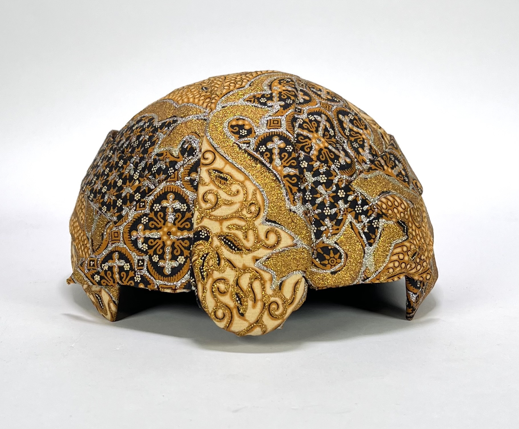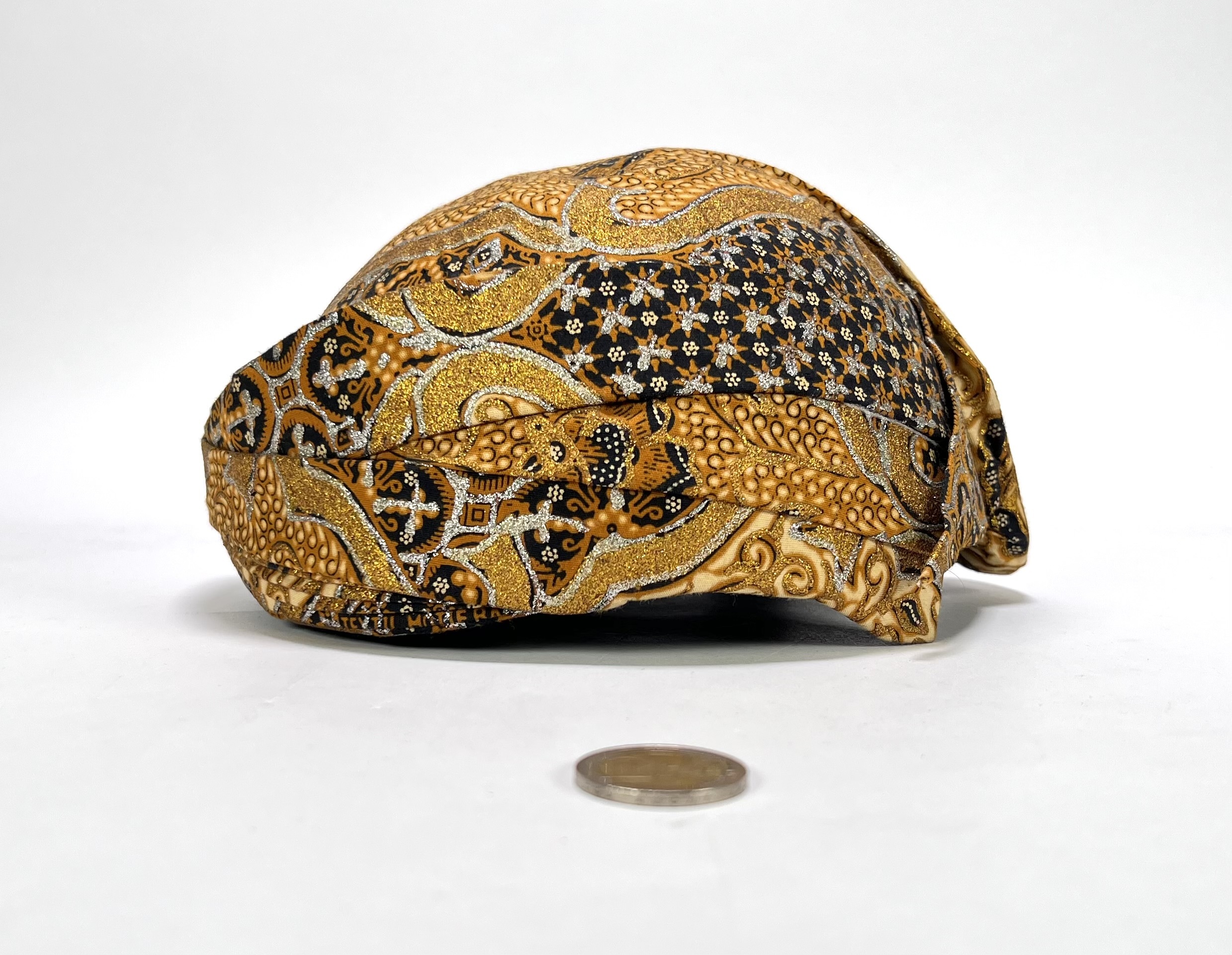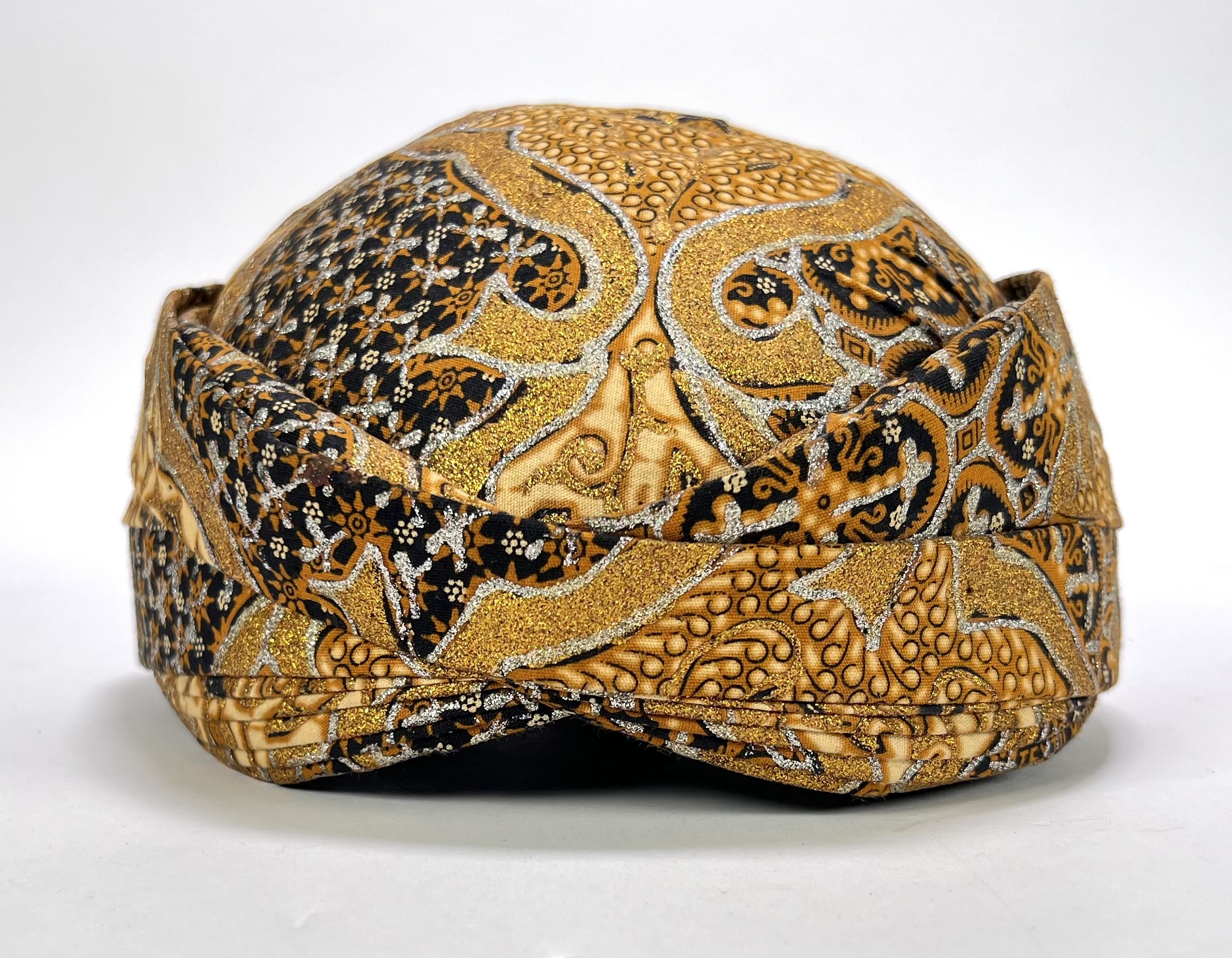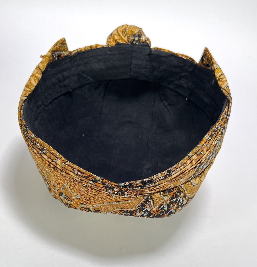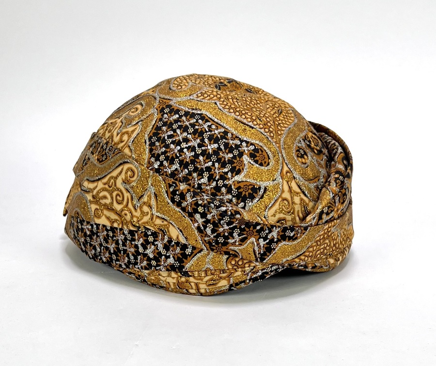 Deze ceremoniële textiele blangkon (Javaanse hoofdbedekking) is vervaardigd door middel van batik en naaiwerk, datering midden 20e eeuw. De blangkon uit Indonesië heeft een dicht batikpatroon in bruin en zwart, sterk geaccentueerd met goud- en zilverkleurige metallic pigmenten. Kom langs tijdens de kijkdagen (28 t/m 30 november) en ontdek deze Blangkon zelf! |
