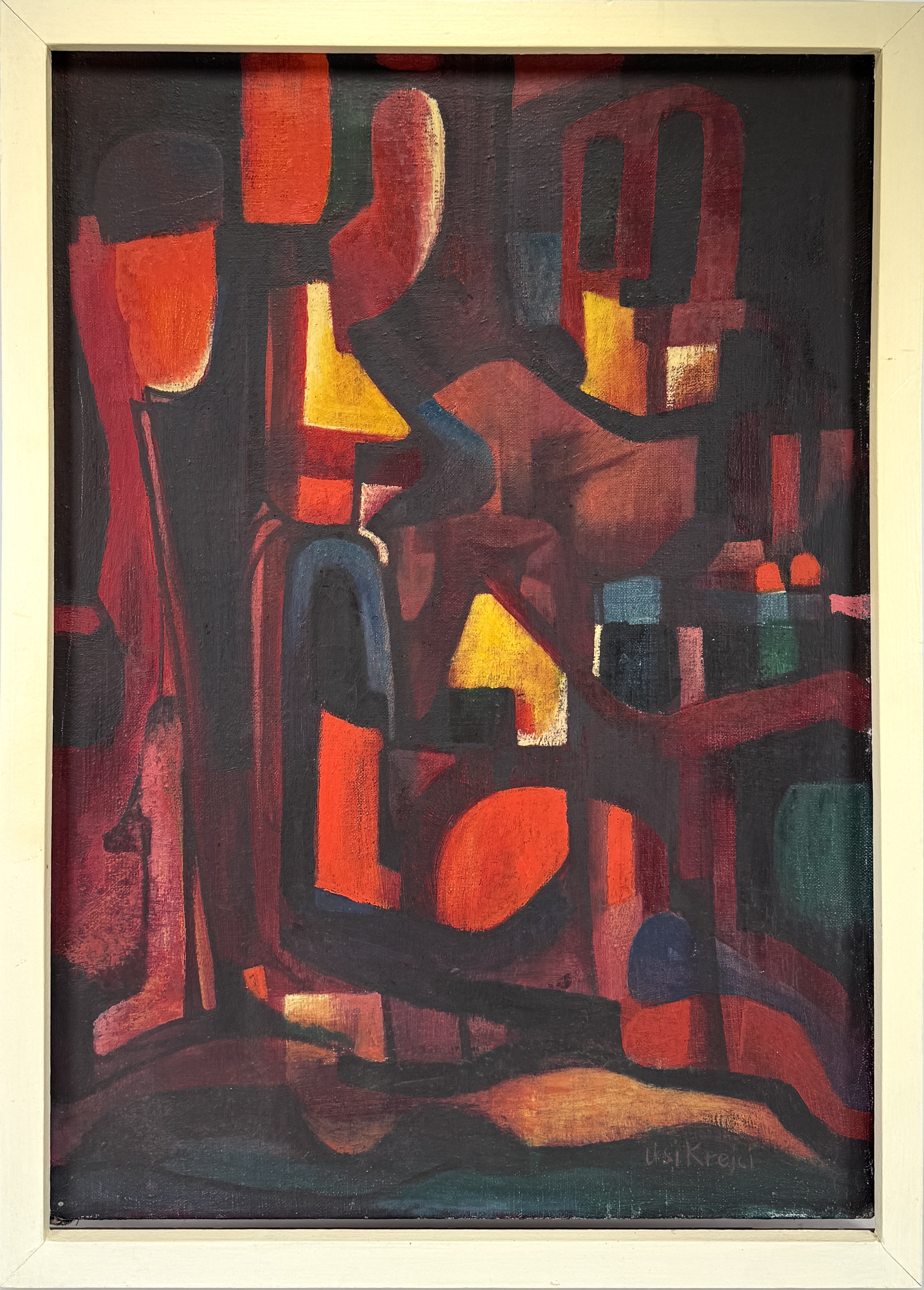 Abstract-expressionistisch schilderij door Usi Krejci, uitgevoerd in olieverf op doek, daterend ca. 1970, Tsjechië. De compositie toont overlappende geometrische en organische vormen in rood-, oker-, paars- en groentinten, Het werk is rechtsonder gesigneerd. Geïnteresseerd? Bezoek onze kijkdagen op 28, 29 of 30 november van 11:00 tot 17:00 uur! |
