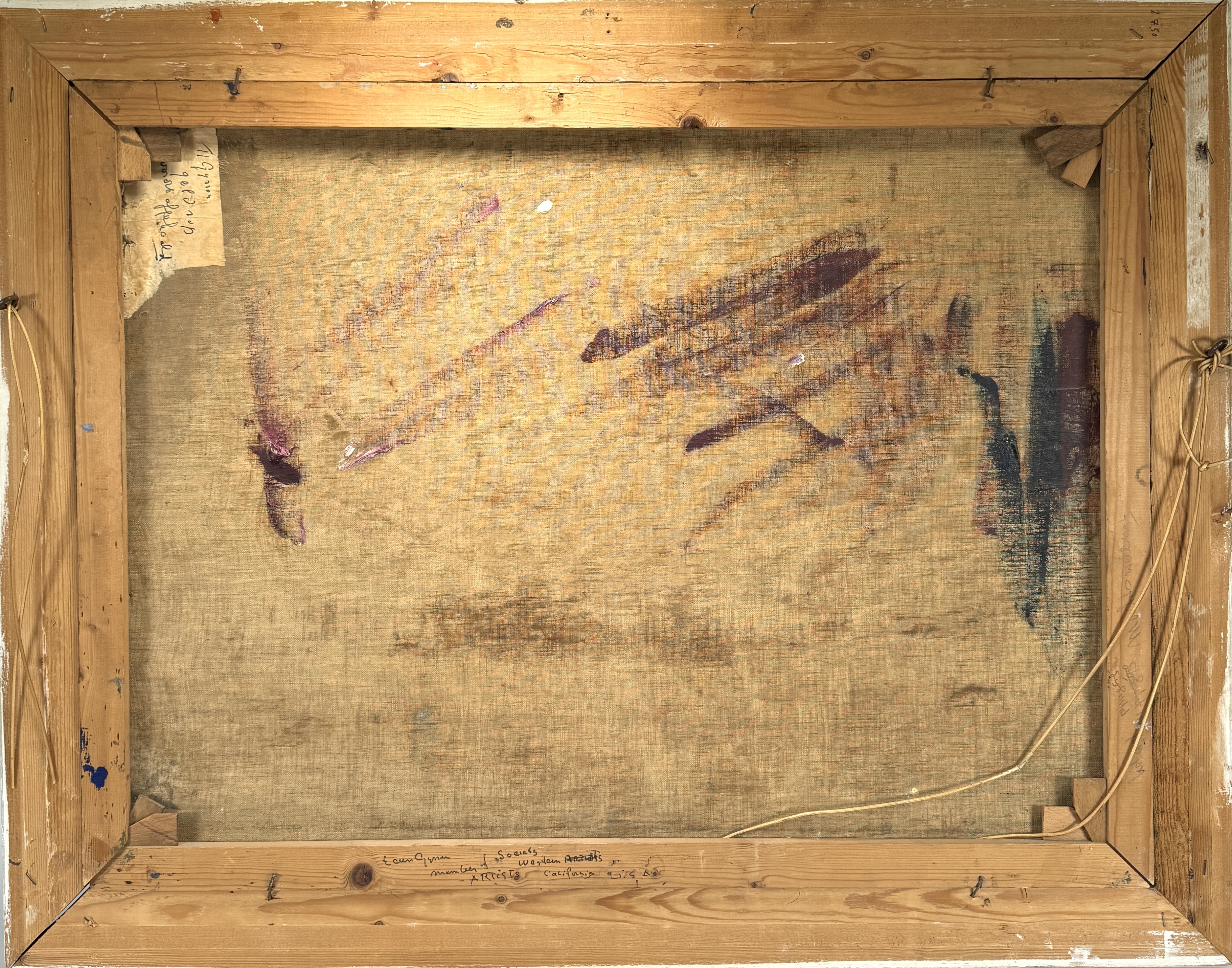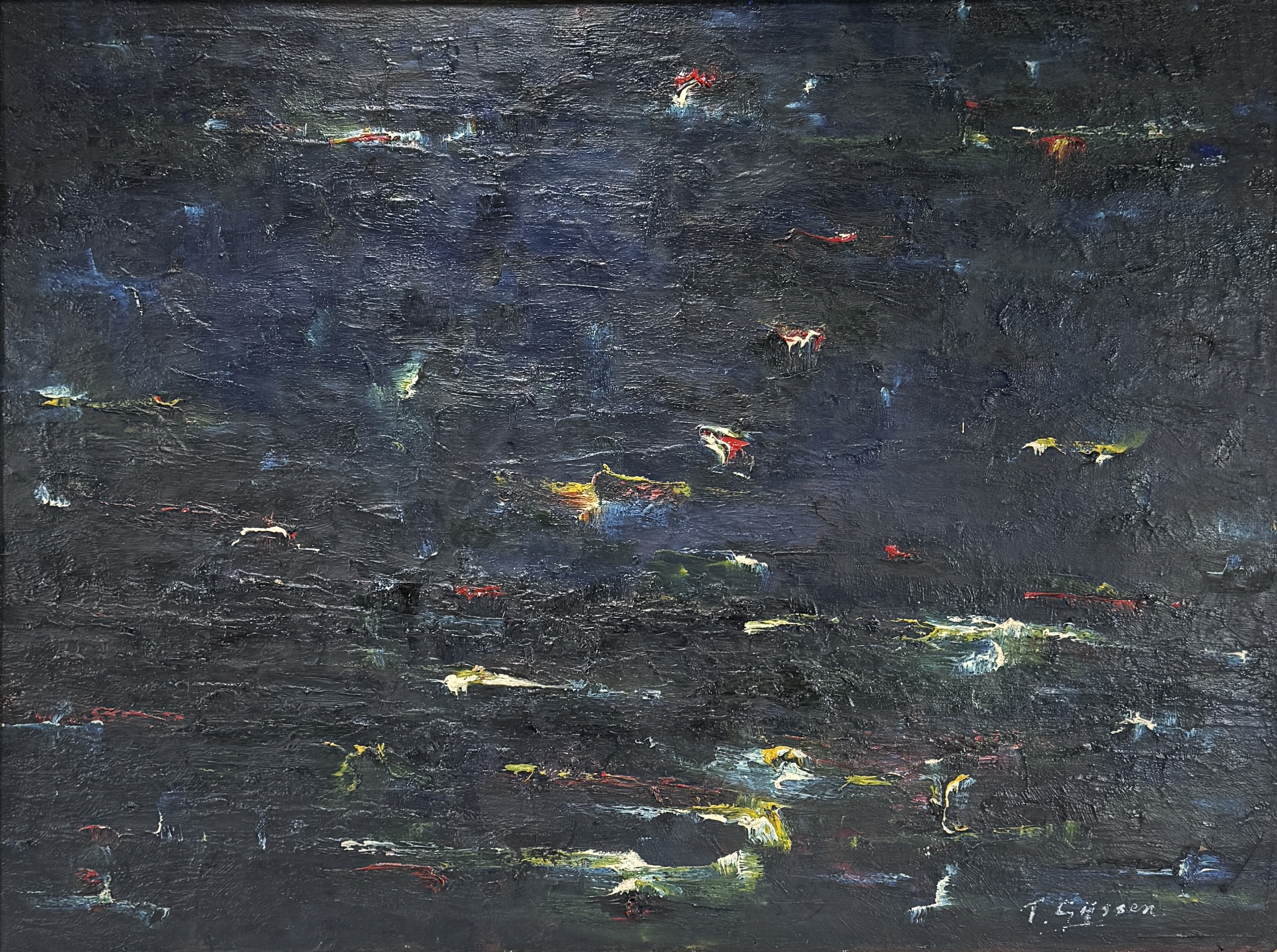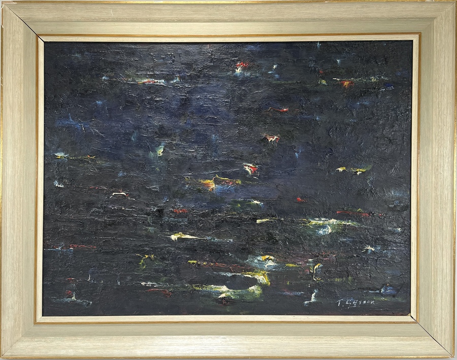 Schilderij door Teun Gijssen (1910–2003), uitgevoerd in olieverf op doek. Het werk toont een abstract expressionistische compositie met dik aangebrachte verflagen in donkere blauw- en zwarttinten, doorbroken door lichte kleuraccenten. Gesigneerd rechtsonder 'T. Gijssen', daterend uit de tweede helft van de 20e eeuw. Dit schilderijzelf beoordelen? Je bent welkom op onze kijkdagen op 28, 29 en 30 november! |