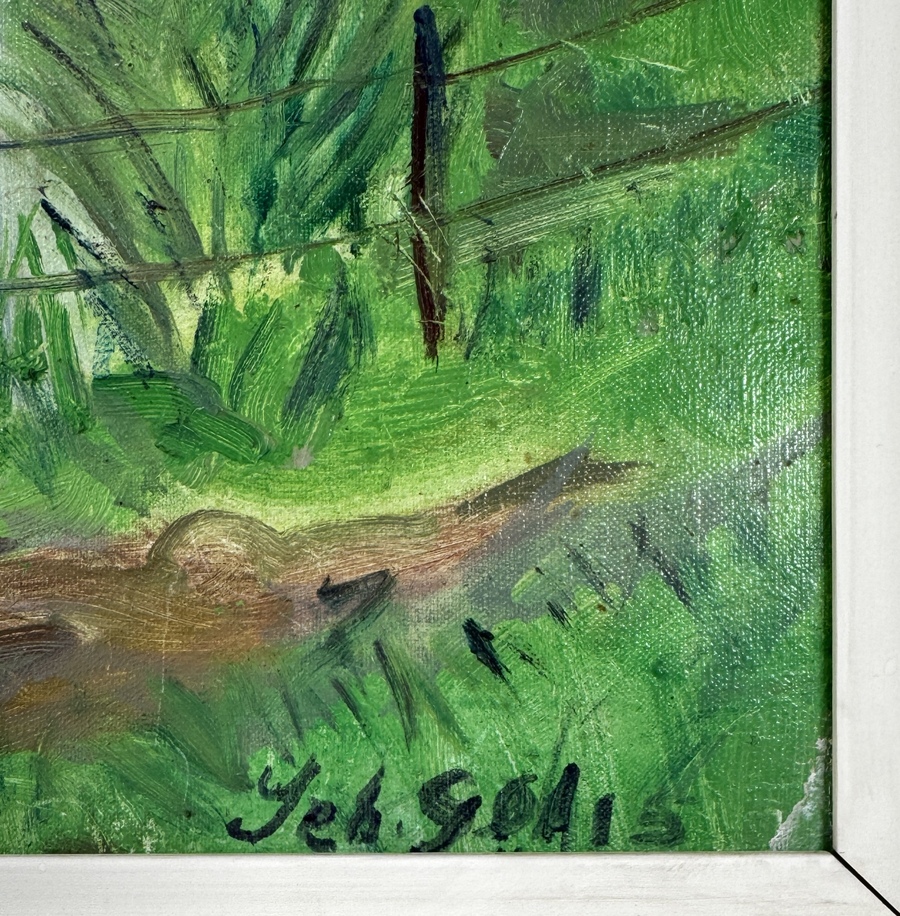 Schilderij van een klassiek Hollands polderlandschap in impressionistische stijl, gekenmerkt door een bewolkte lucht, een molen aan de horizon en een sloot met houten hek op de voorgrond. Uitgevoerd in olieverf op doek, rechtsonder onduidelijk gesigneerd. tweede helft van de twintigste eeuw Wil je dit schilderij in het echt bekijken? Kom naar de kijkdagen op 28, 29 en 30 november! |