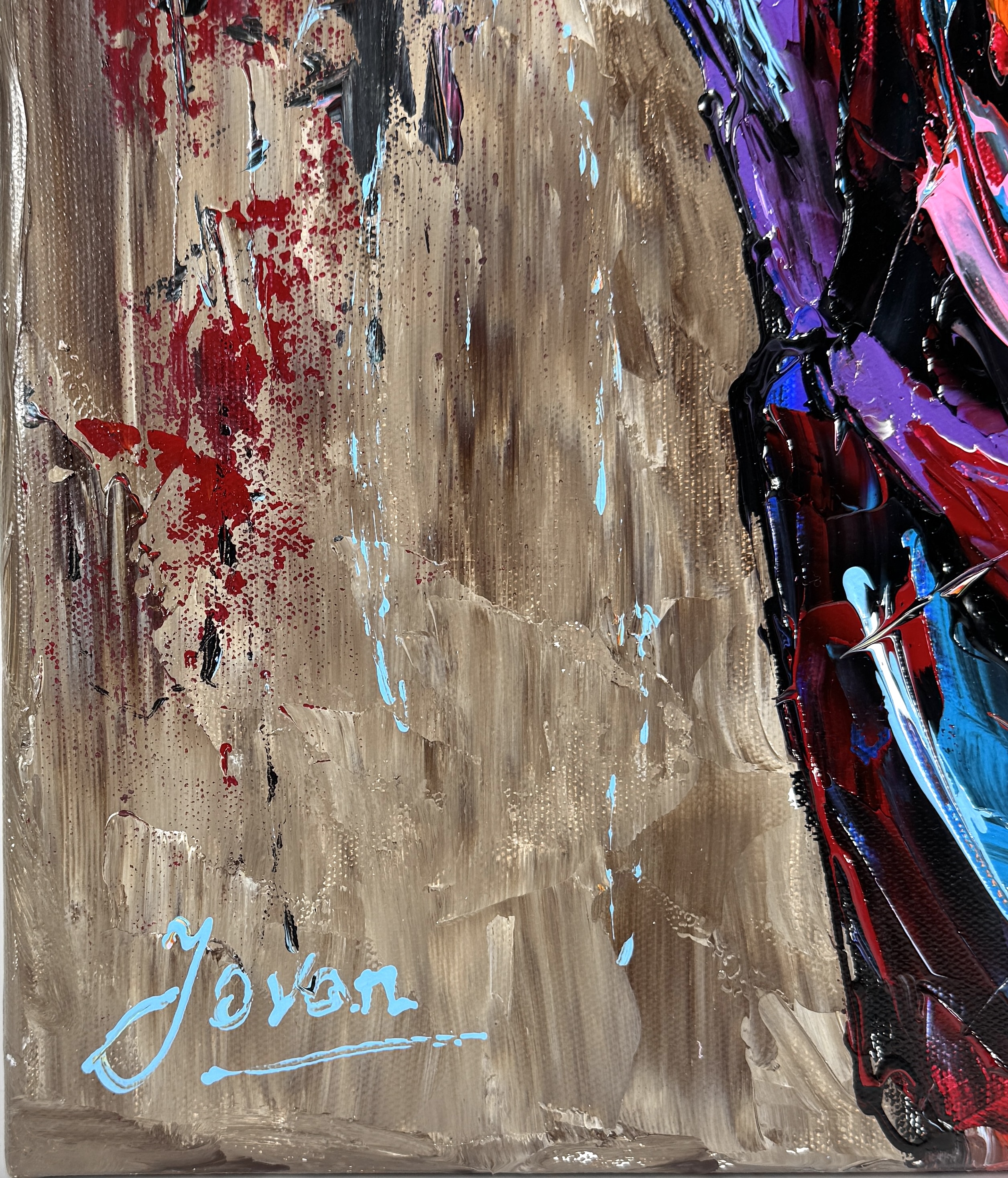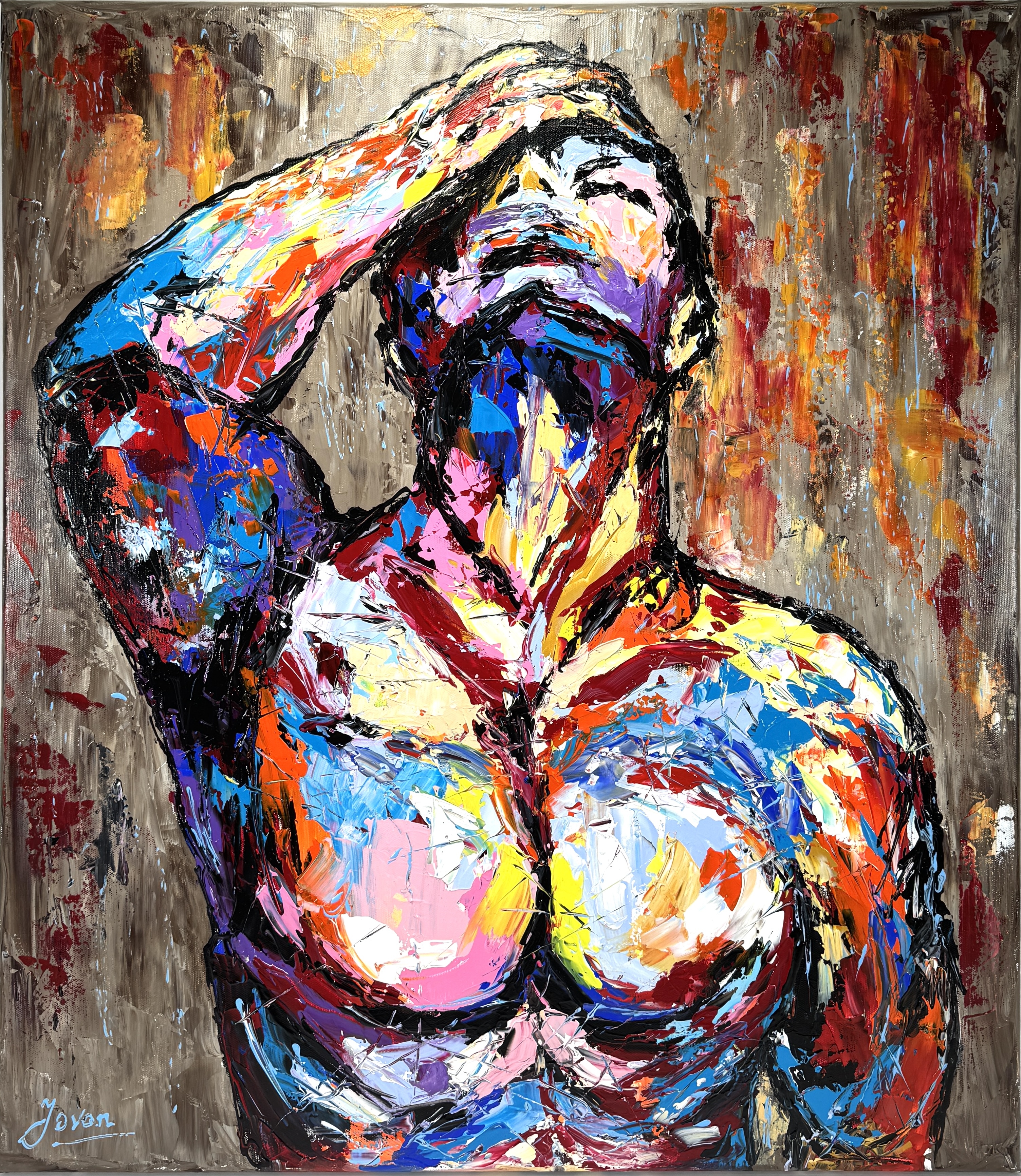 Expressief olieverfschilderij op doek, getiteld "Worried man", door de kunstenaar Jovan Sretenac, gedateerd 2022. Het werk is uitgevoerd in figuratief expressionisme met een uiterst zware impasto. Het toont een gespierd mannelijk figuur met gefragmenteerde vlakken van heldere kleuren. Vers getiteld, gesigneerd, gedateerd en Certificate of Authenticity. Registreer nu en bied eenvoudig online mee op dit schilderij! |